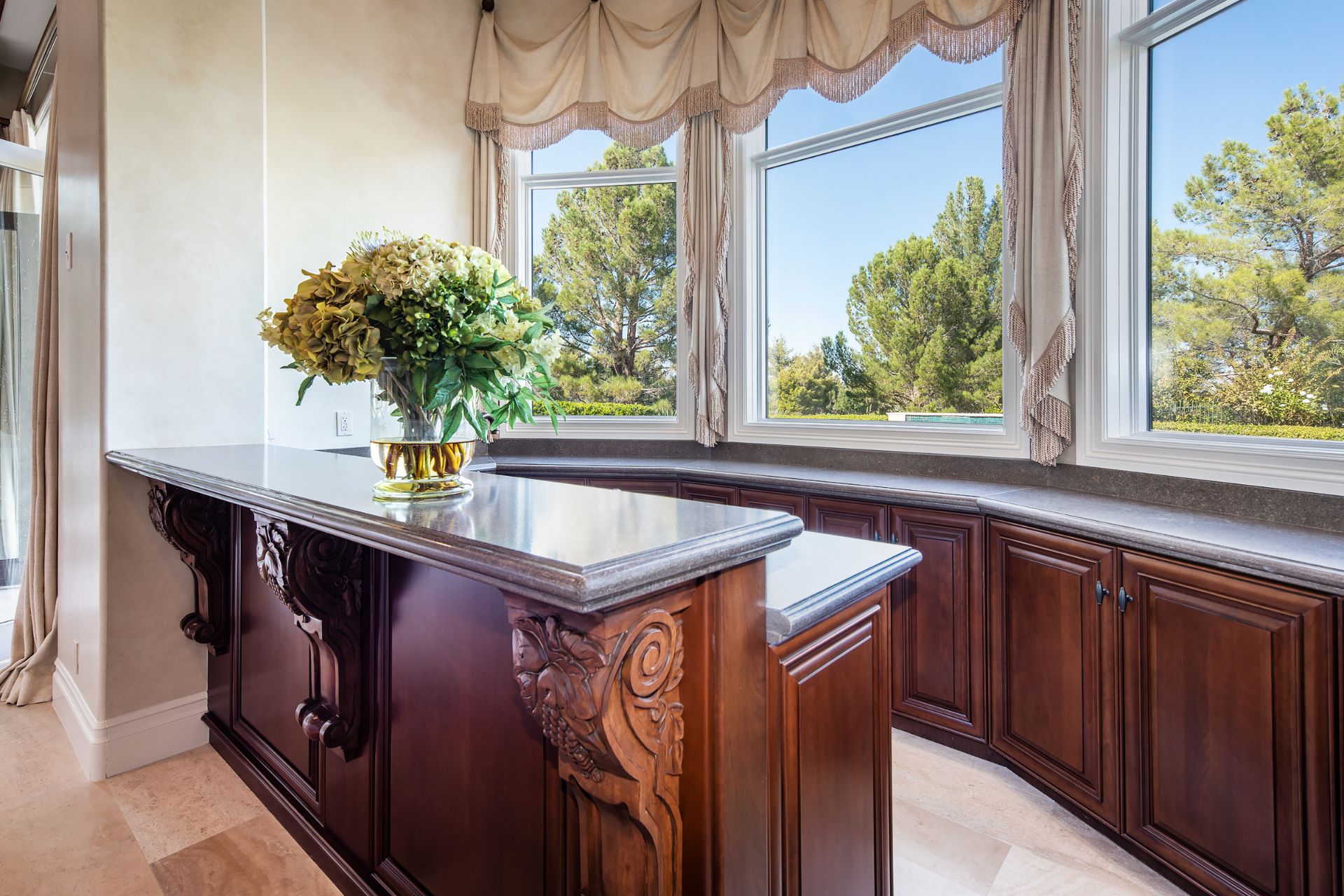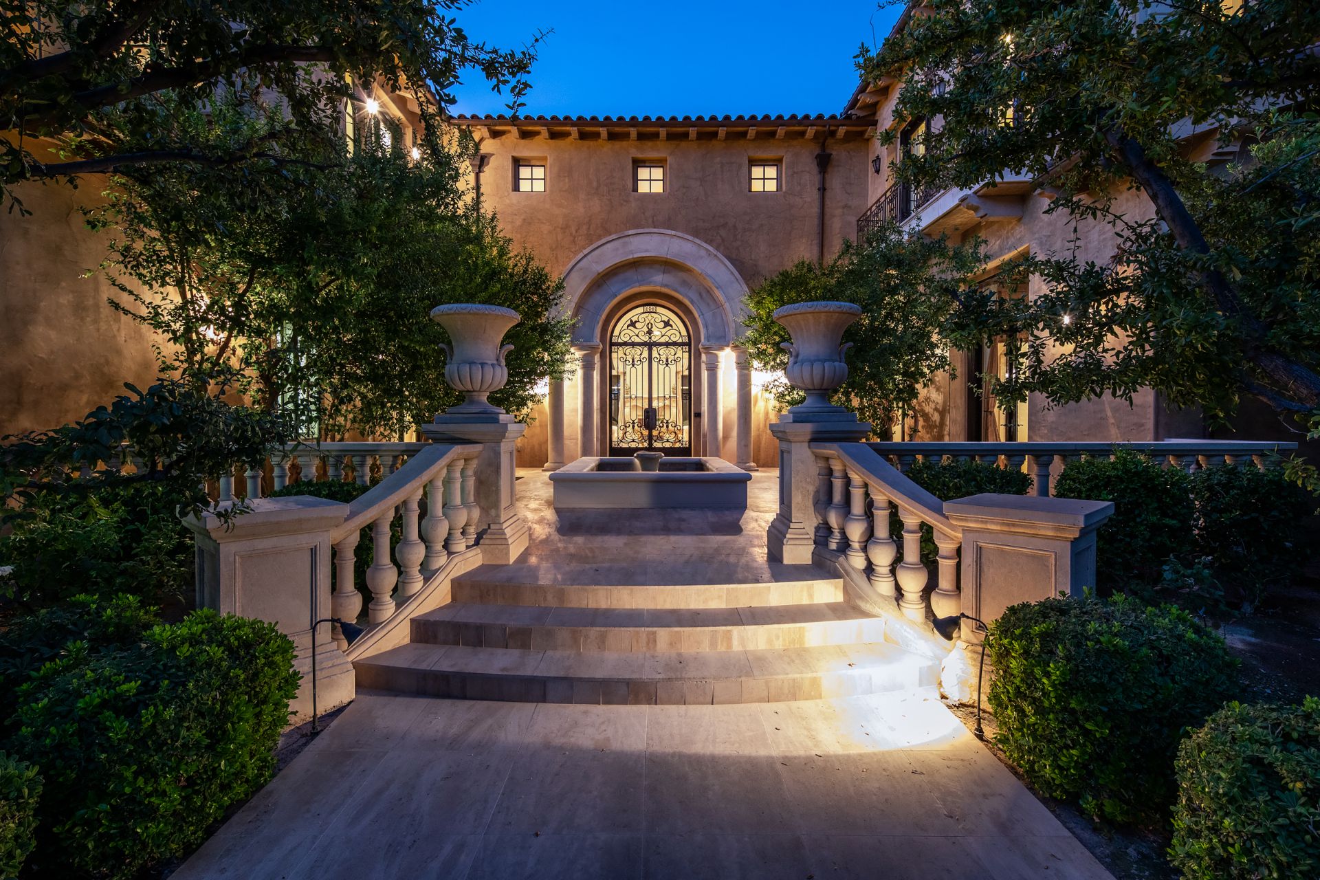 This one-of-a-kind recently-renovated residence offers an exterior landscape filled with mature shrubbery and fruit trees, highlighted by stone pathways and colonnades and an entry patio with a fountain. The rear yard boasts golf course frontage and commanding views of surrounding mountains. A sparkling pool with waterfall and spa and an outdoor kitchen with an inviting fireplace complete the private garden oasis.