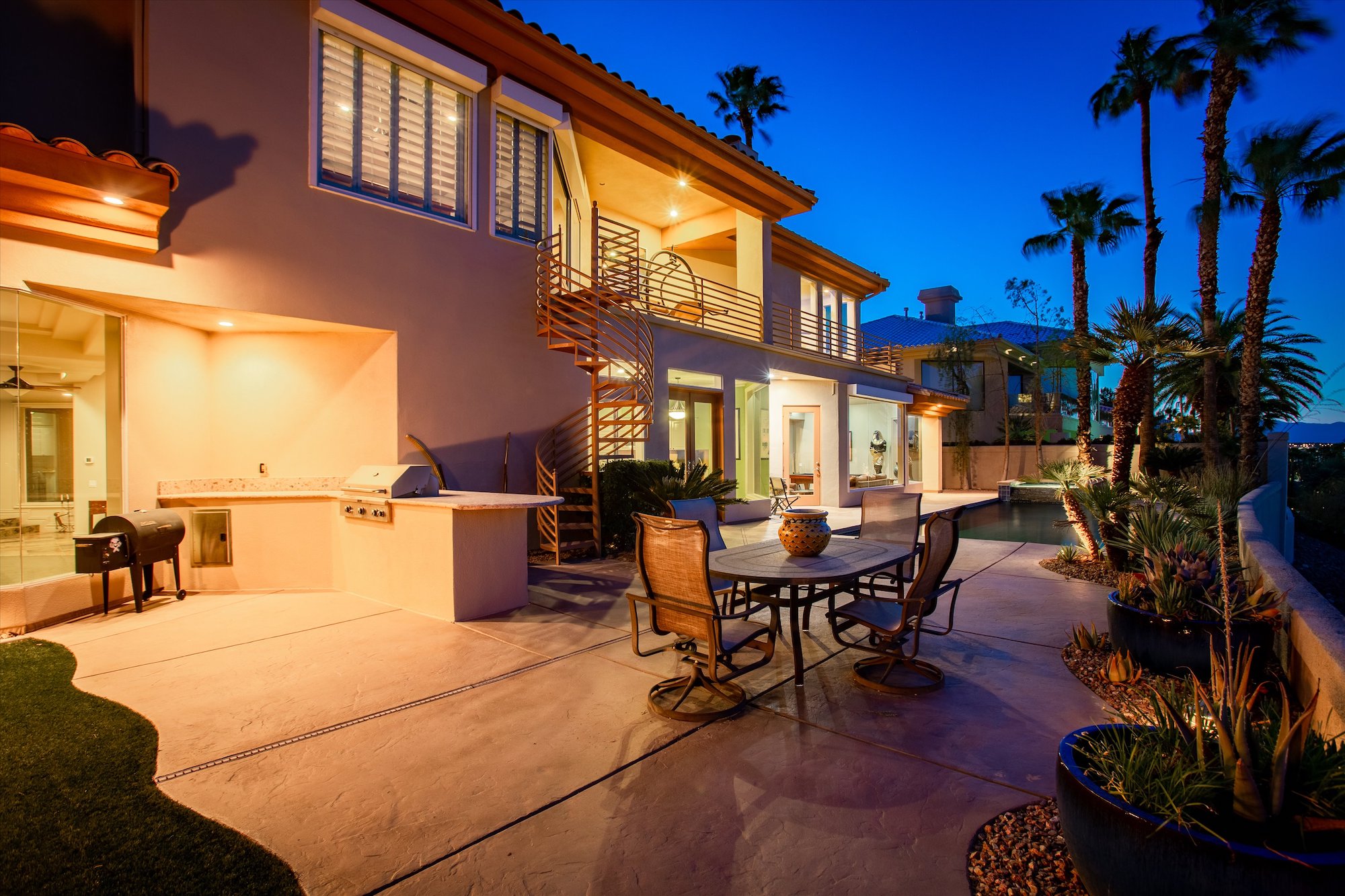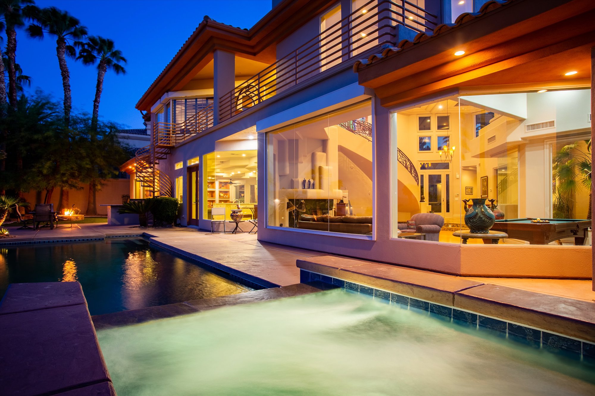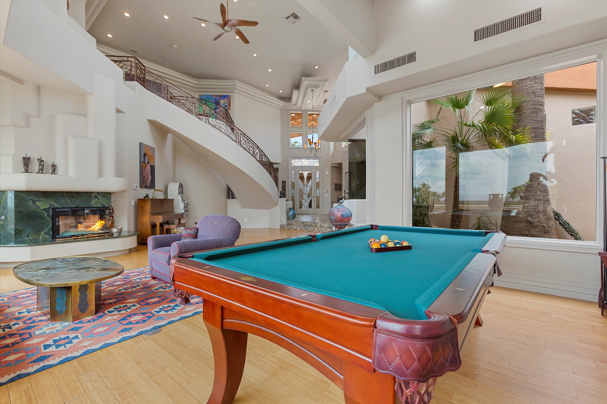 A sweeping staircase with unique wrought-iron railing leads to the home's upper-level bedrooms. The huge 40x21 master suite, with fireplace and private sitting area, boasts an outdoor balcony with spiral staircase leading to the backyard pool. Another distinctive feature, in the suite's large bathroom, is a glassed-in view of two towering palms that have been allowed to grow through the second story roof. The bath itself is a vision of function with dual vanities, inviting soaking tub and soothing glass-walled shower. This is a home to be savored both for its comfort and its ingenuity! Both the living room and family feature built-in bookcases, while a formal dining room boasts a wall of glass that overlooks the entry court. The kitchen, a model of efficiency with white-painted cabinetry and granite counters, has a dining nook with full views of rear yard and direct access to the outdoors. The sparkling backyard pool and spa invite outdoor enjoyment, with a paved patio and small lawn adding to the overall ambience of the property.