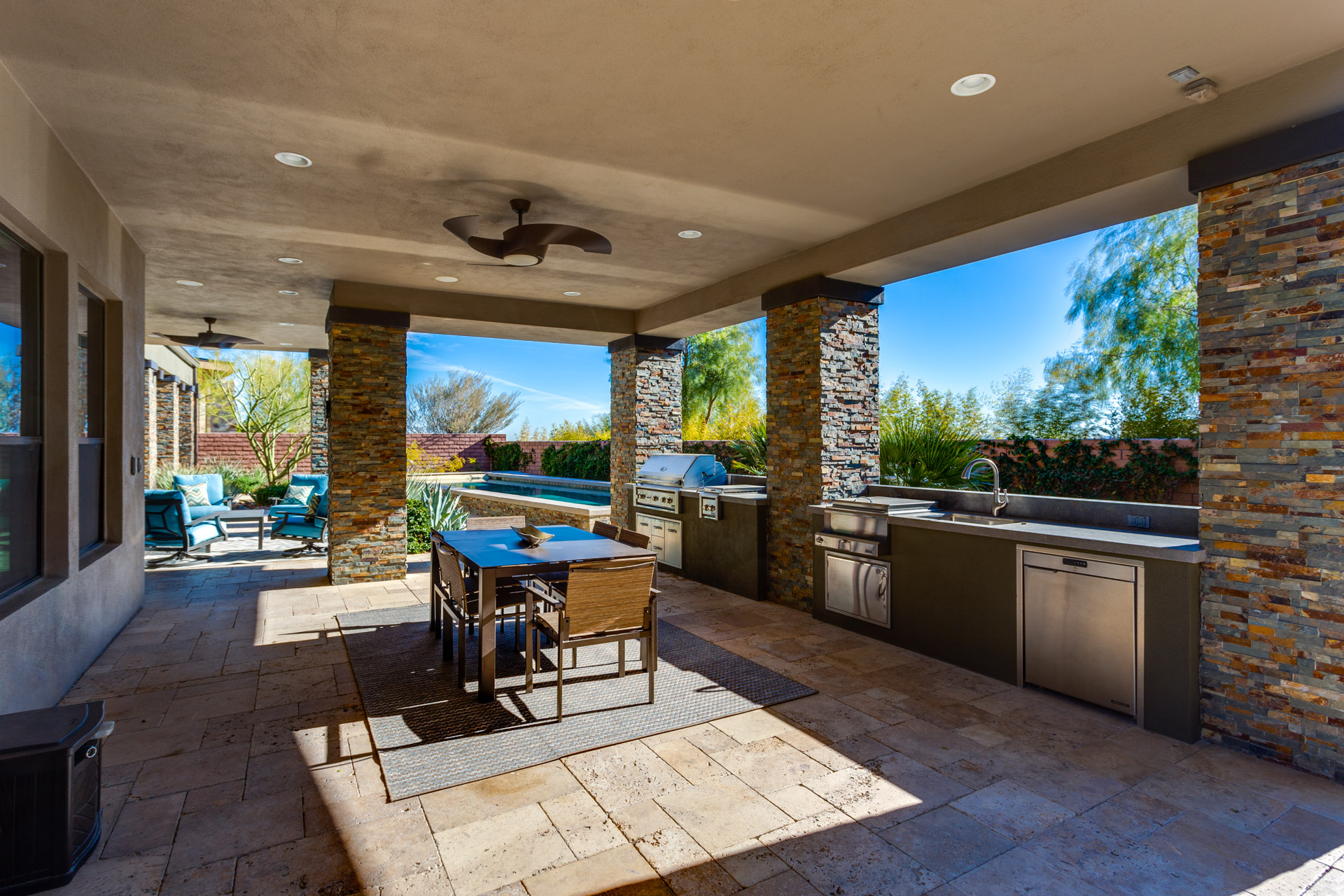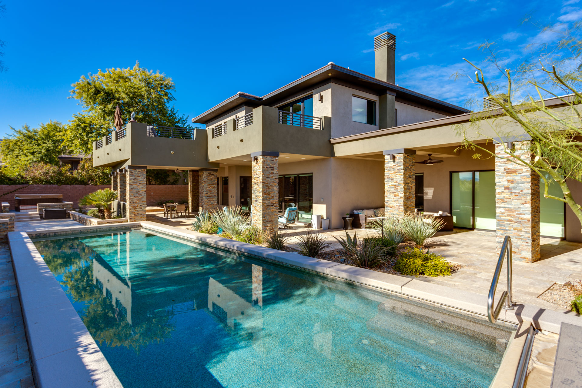 Oversized-sliding glass doors expand the great room to an enormous covered patio with ceiling fans and a high-end outdoor kitchen. The backyard features a saltwater pool with automatic cover, an above-ground therapeutic spa, built-in gas fire pit, low maintenance landscaping, as well as, gated side parking. This custom home offers two master suites, one on each level, and three additional large bedroom suites upstairs, each with ceiling fans and views in all directions.