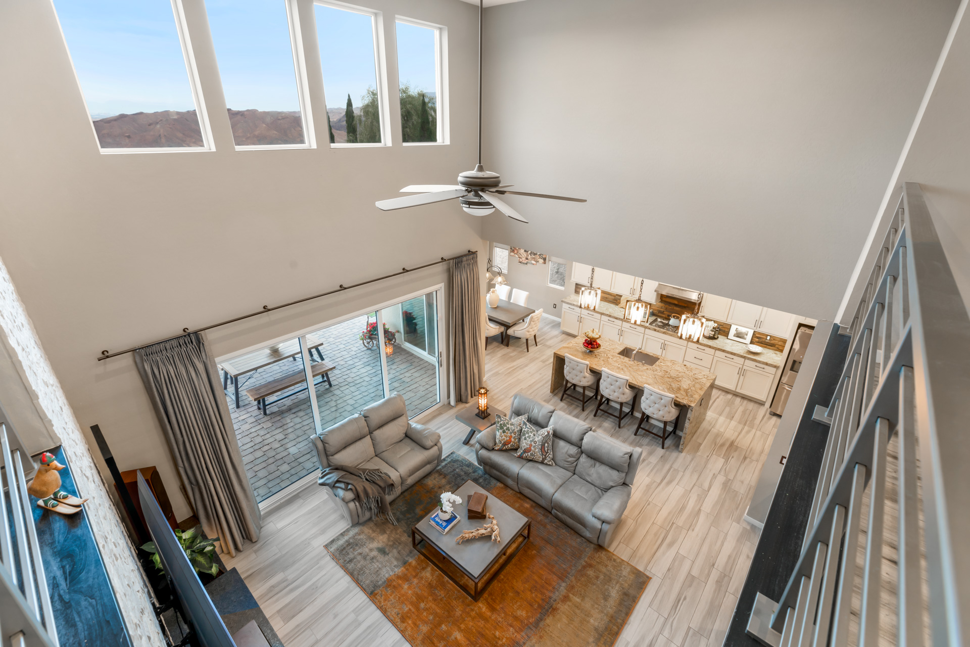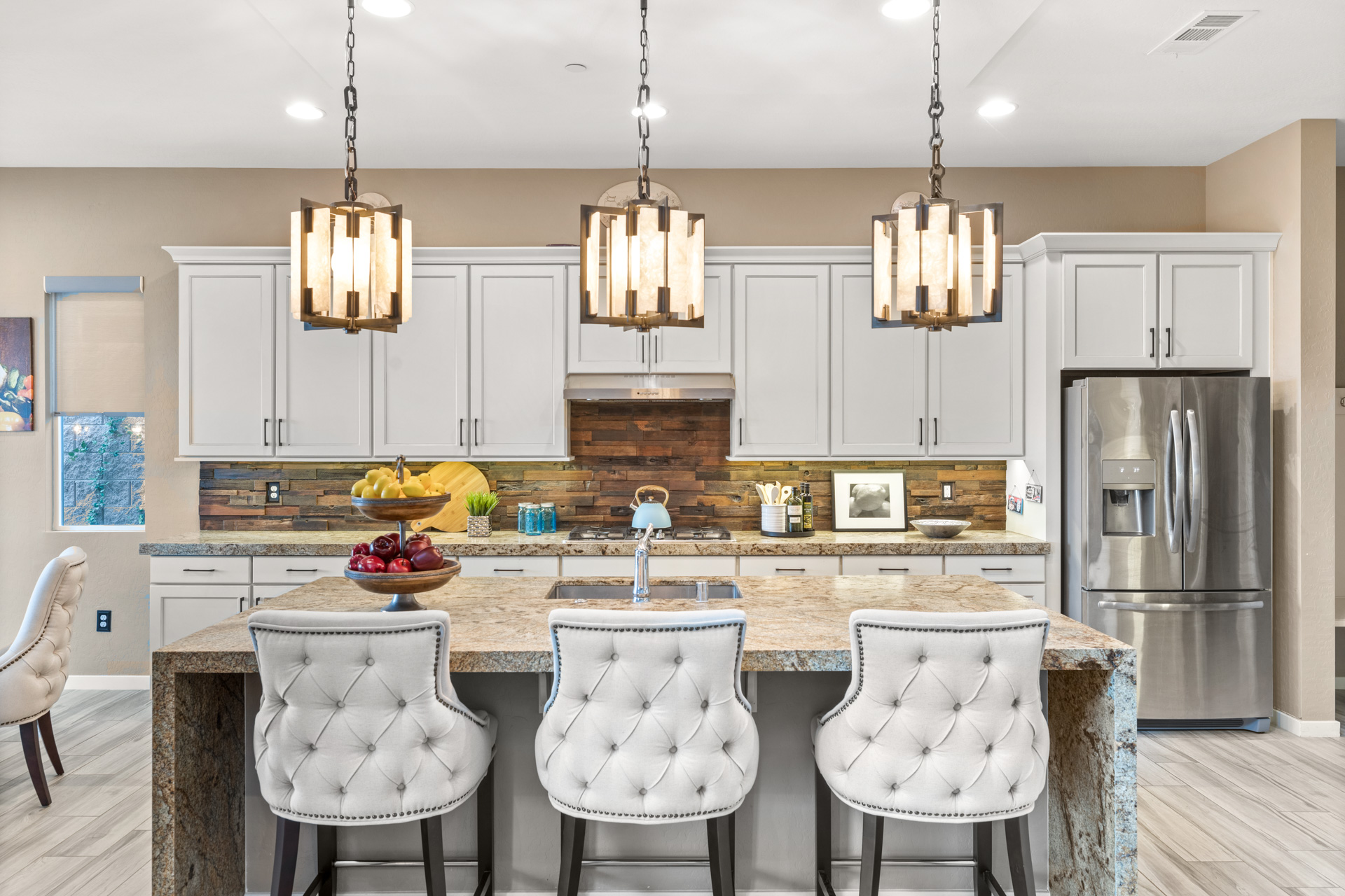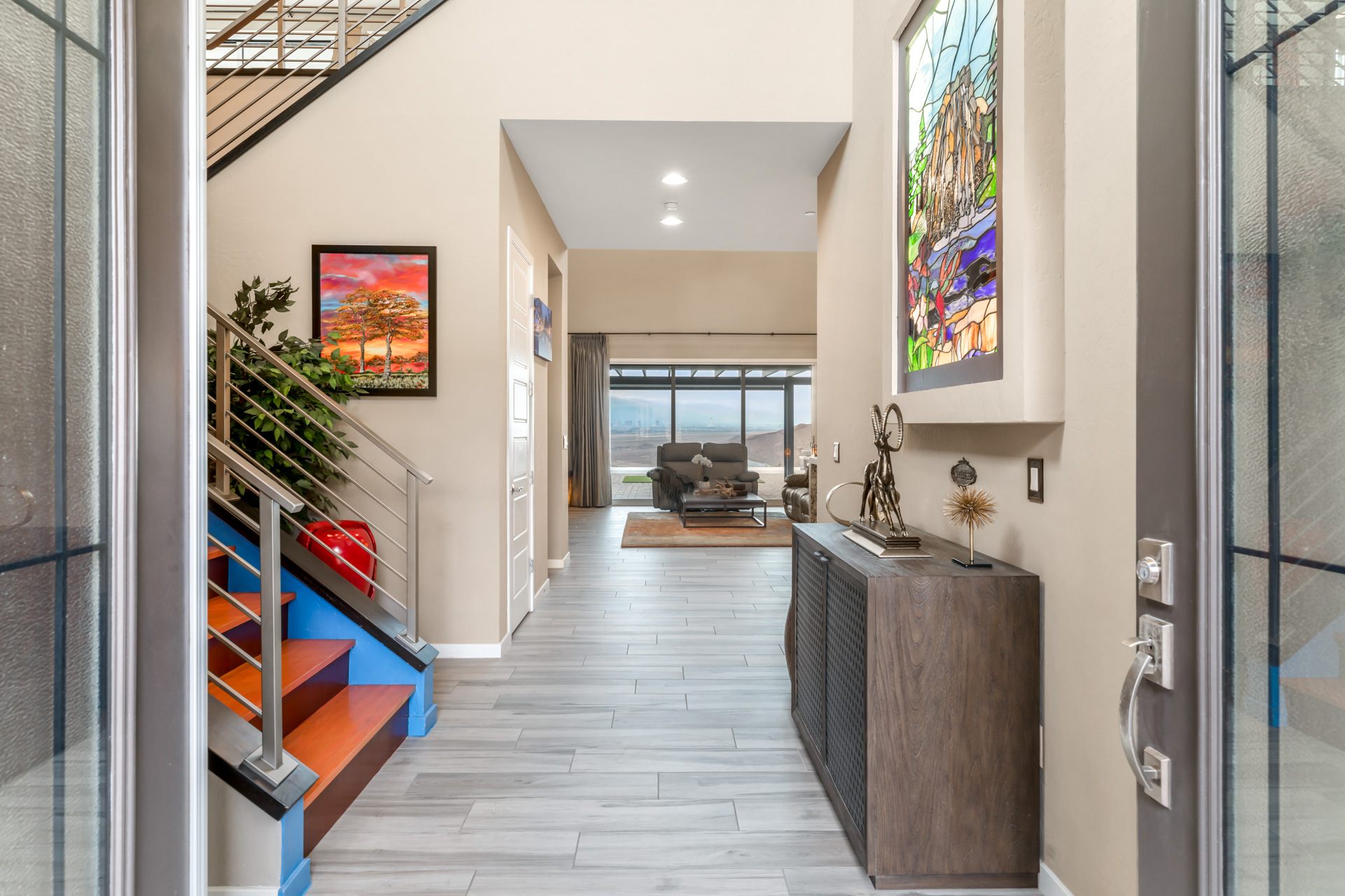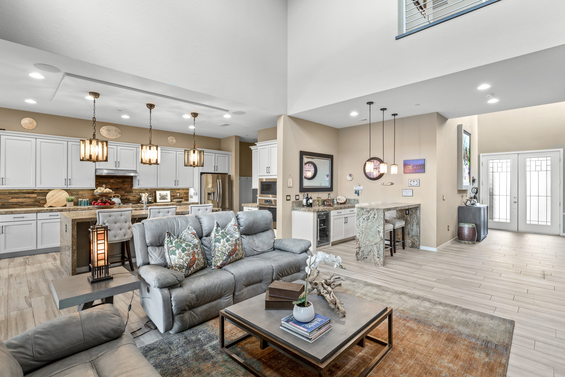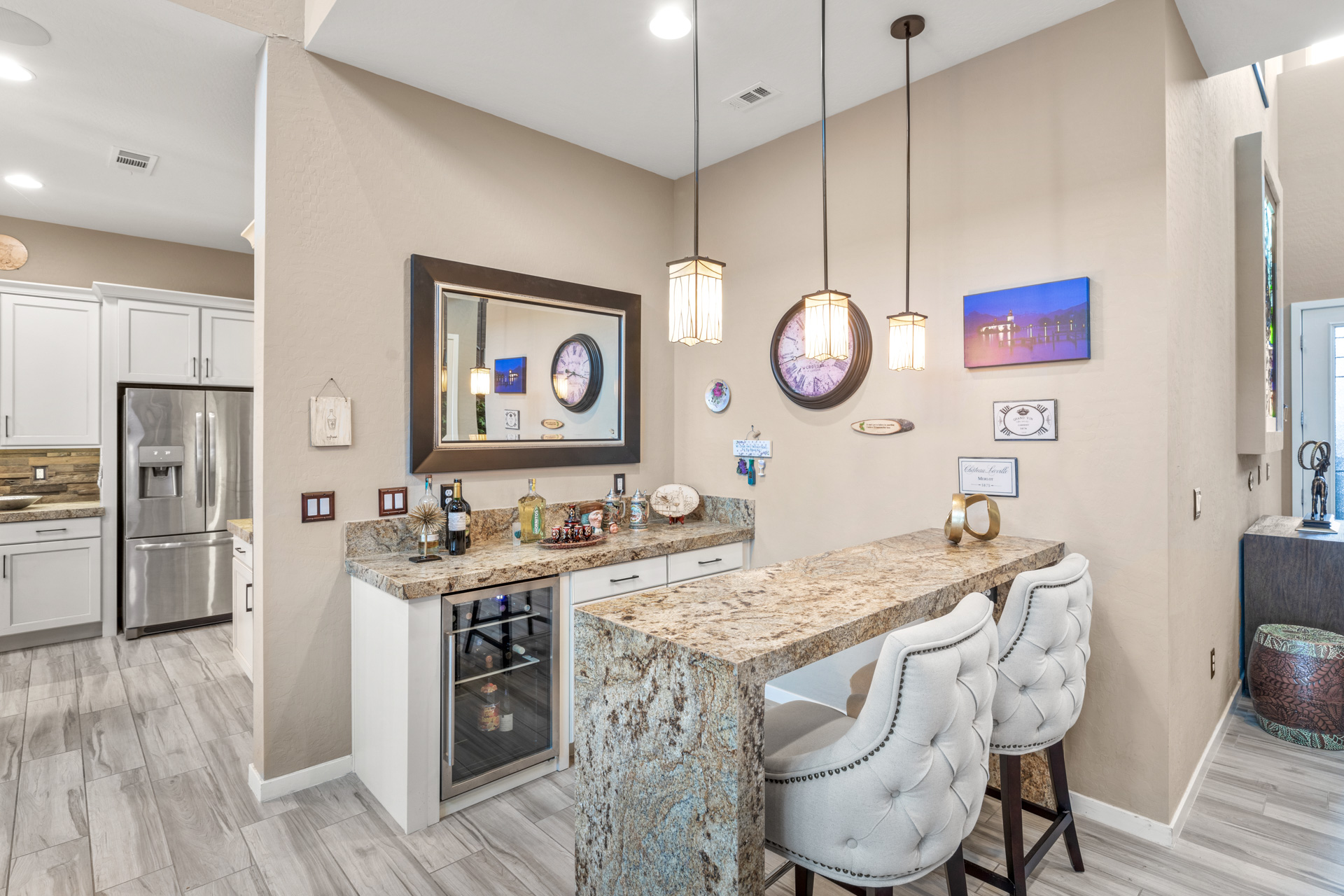 Located in a cul-de-sac, on an elevated lot, this home offers a driveway of tumbled stone pavers, easy desert landscaping, and custom wrought-iron privacy gates. Upon entering the foyer, you are welcomed with a built-in, custom stained glass art piece. The great room offers an entertaining dry bar, wine refrigerator, and detailed waterfall edging.