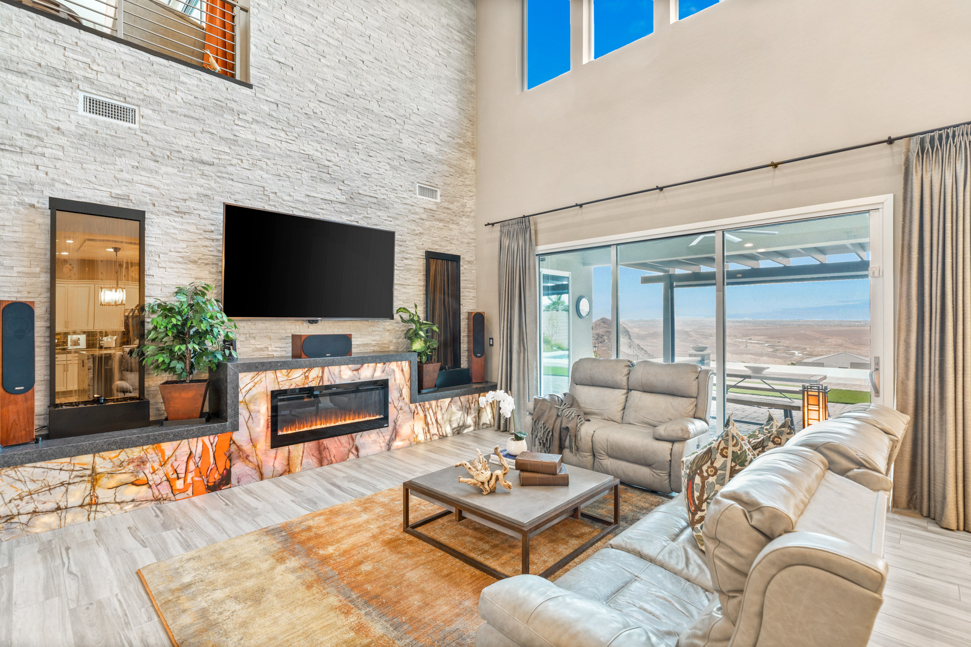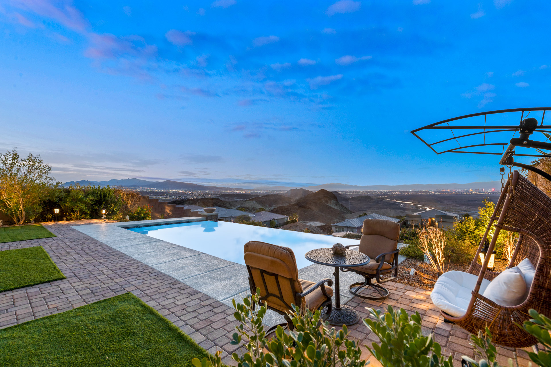 Additional features are a high vaulted ceiling, a fireplace with a unique granite finish, and a custom stone stack wall to add interest and texture. Multiple sliders lend to an abundance of natural light throughout the home. The oversized kitchen is a masterpiece with custom cabinets, stainless steel appliances, a large kitchen island with waterfall detail, a walk-in pantry, a convenient "drop spotā and exquisite Designer light fixtures. The owner's suite is located on the first floor for ease and convenience. You will find the same exceptional views from the primary bedroom. The sliders will take you out to the covered patio and a morning dip in the pool. The primary bathroom features dual sinks with granite countertops, a make-up vanity, a huge walk-in shower, a soaking tub, and an ample walk-in closet. A large linen closet will also hold your towels and toiletries. When you walk up the modern staircase, the copper wall leading to the second floor is stunning. When you arrive at the second floor you are greeted with a loft that offers flexibility for an office, a home gym, or additional lounging space. A slider leads you out to the balcony, to enjoy the Sunset views. There are two additional upgraded bedrooms, both with dramatic views, and a large secondary bathroom with granite countertops, a bathtub, and linen storage. There is no better backyard in which to enjoy the sunny weather with a covered patio, an additional patio for shaded entertainment and remote shades offer the perfect outdoor setting. The true infinity edge pool is magnificent, and perfectly designed for your daily laps. The evenings are truly magical with beautiful Sunset views and views of the Strip and City lights. Solar panels are an additional feature of this beautiful home.
