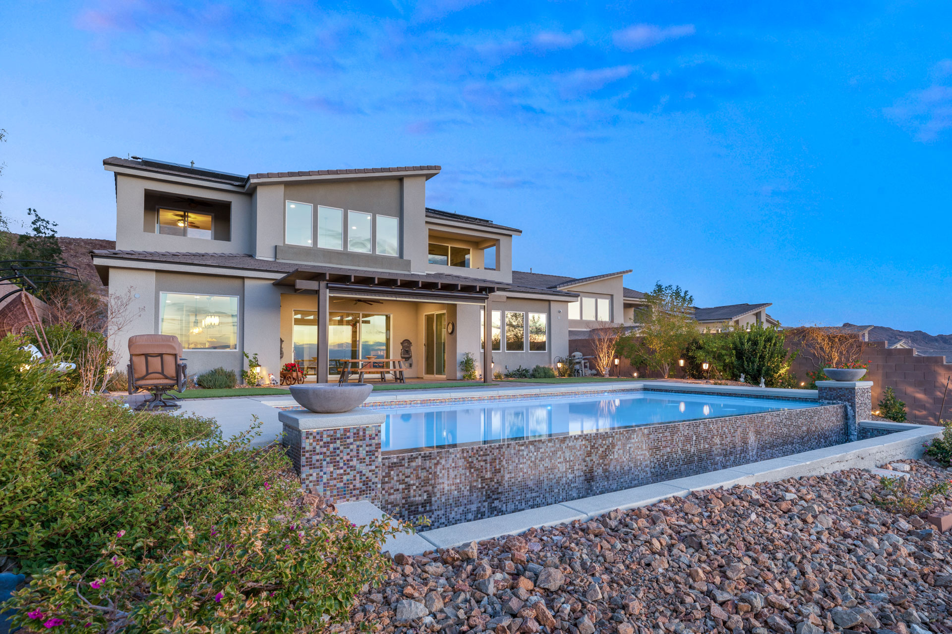 This Lake Las Vegas residence is a sanctuary for entertainment and classic appeal. The open layout showcases indoor-outdoor living with numerous sliders leading out to the covered patio and exceptional backyard. This property has unobstructed views of the Strip, city, mountains, and views throughout the Valley as well. Nestled in The Peaks, a boutique gated community, this warm modern home features beautiful details and quality finishes.