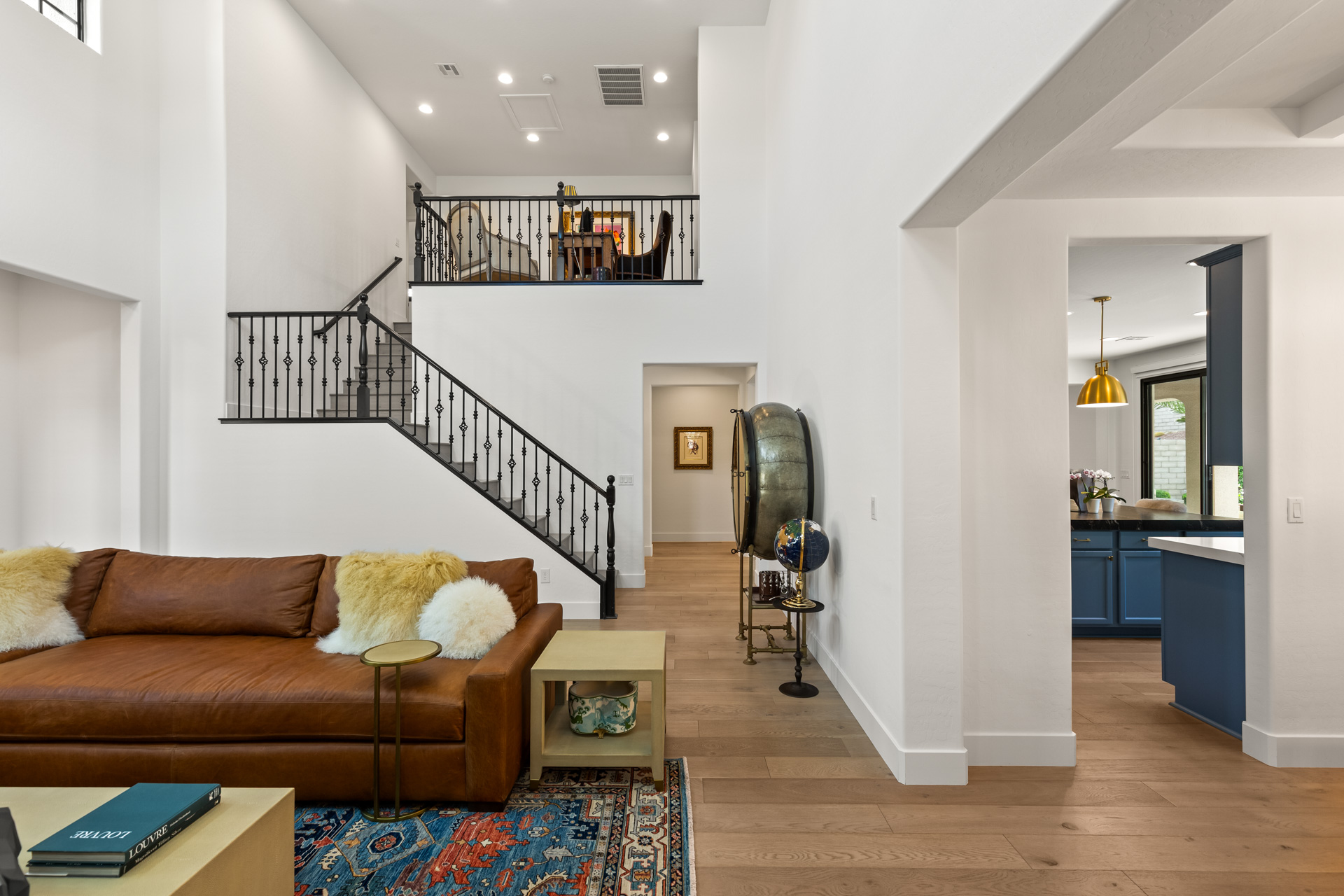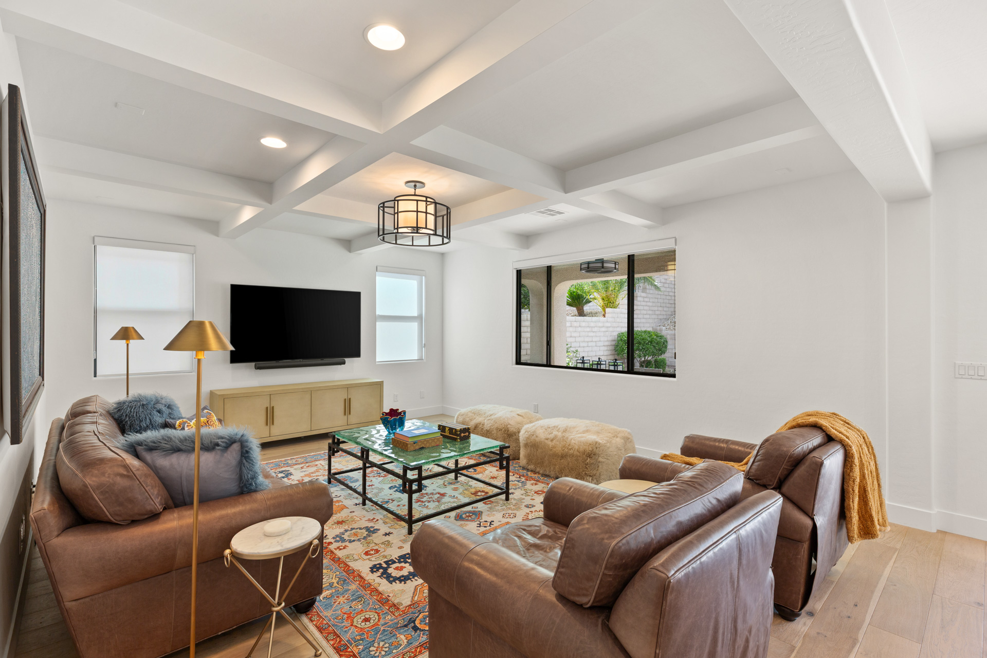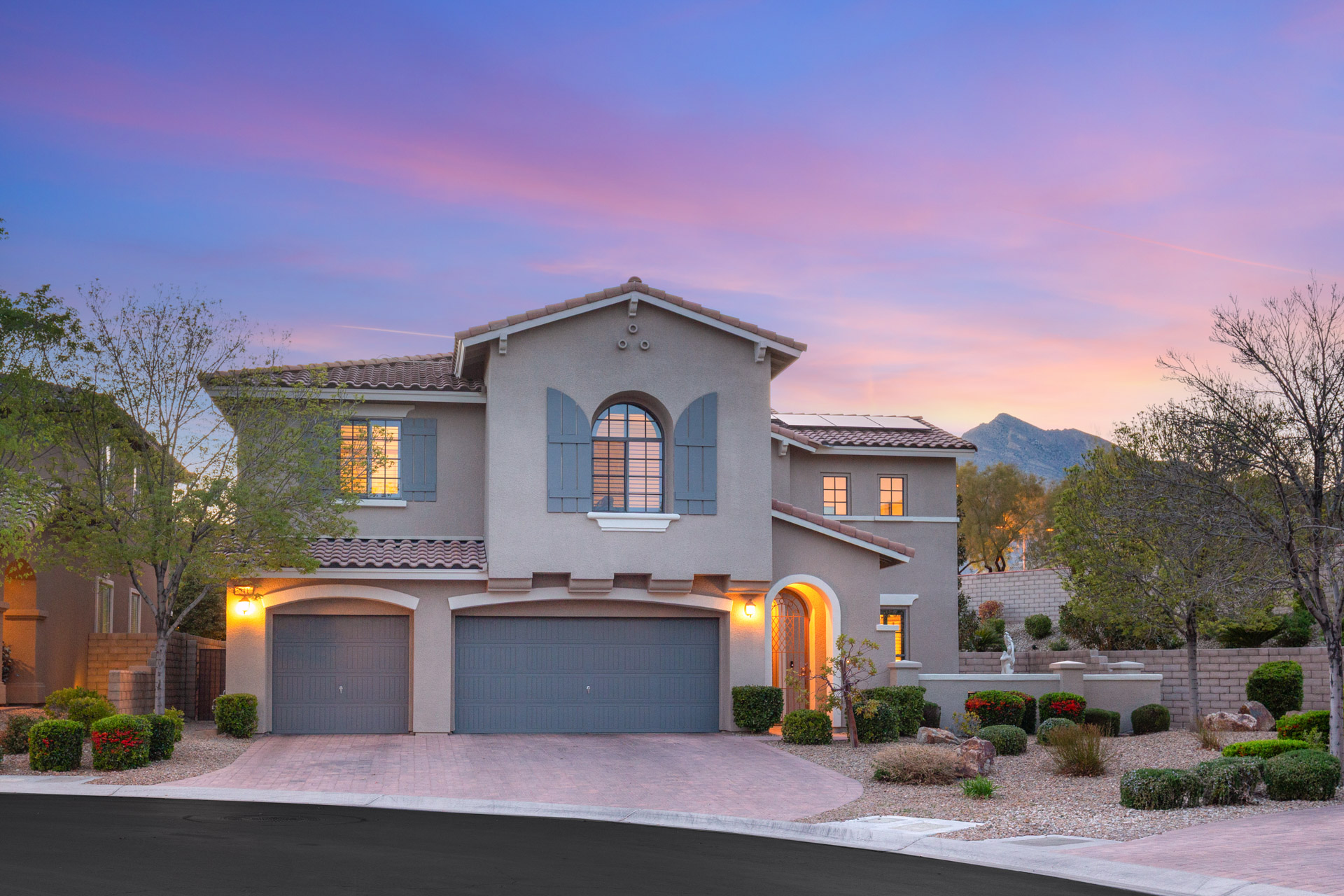 Hardwood floors, coffered ceilings, luxurious lighting, and leathered granite are just some of the gorgeous details found throughout the home. The primary bath has been reimagined with a large walk-in shower with multiple shower heads, RH wood vanities, a barber station and custom closet. Upstairs offers a large balcony with mountain views from the primary bedroom and strip views from the front bedroom and extra room. Additional features include fully-owned solar and a car charger in the 3-car garage.