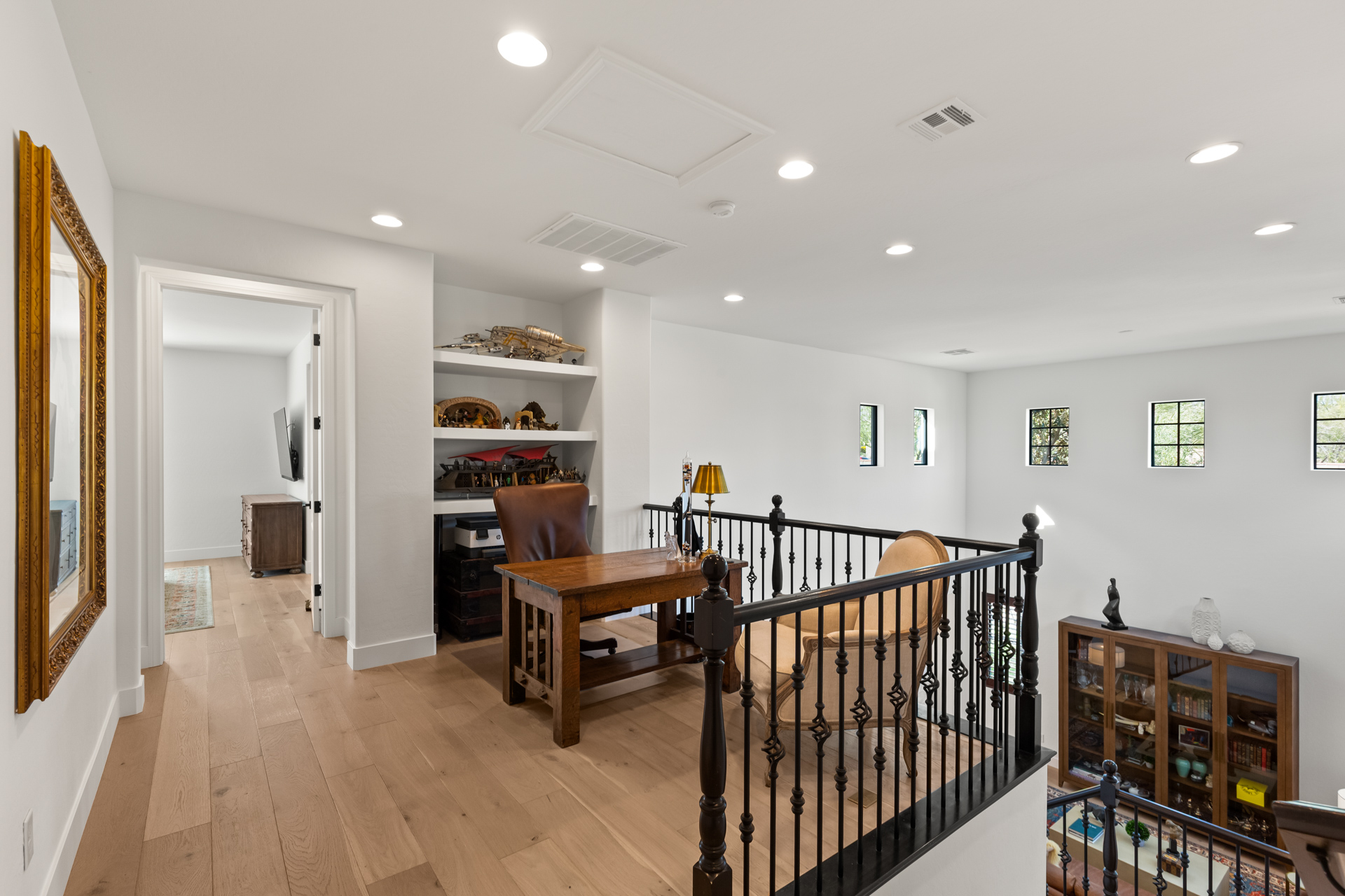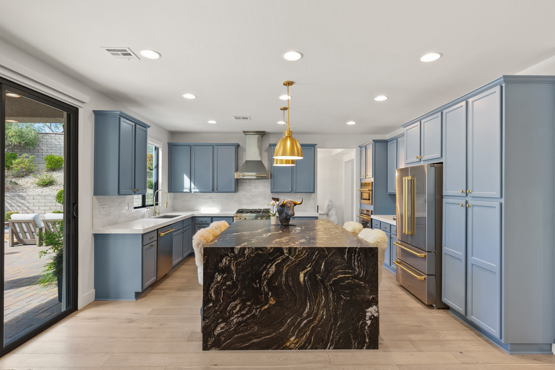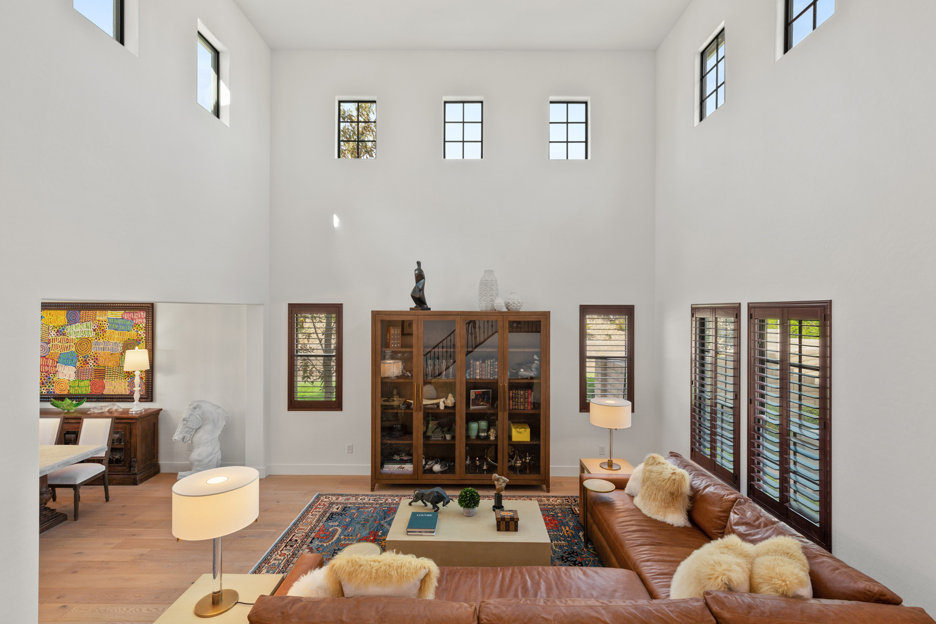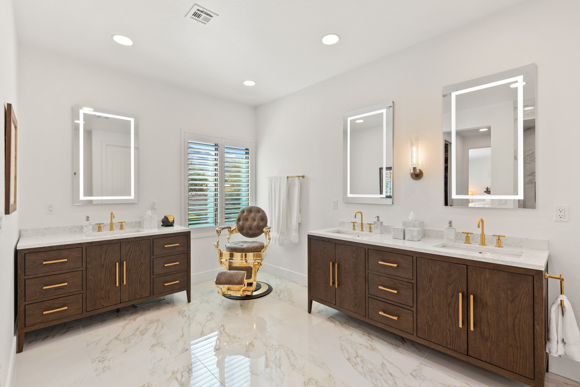 Hardwood floors, coffered ceilings, luxurious lighting, and leathered granite are just some of the gorgeous details found throughout the home. The primary bath has been reimagined with a large walk-in shower with multiple shower heads, RH wood vanities, a barber station and custom closet. Upstairs offers a large balcony with mountain views from the primary bedroom and strip views from the front bedroom and extra room. Additional features include fully-owned solar and a car charger in the 3-car garage.