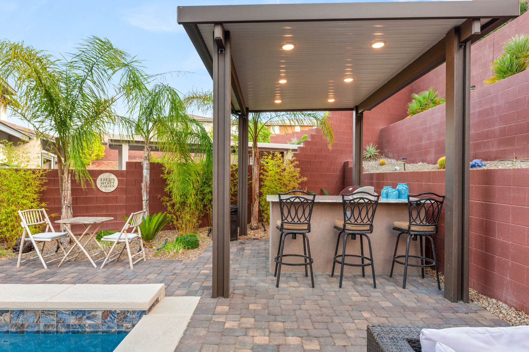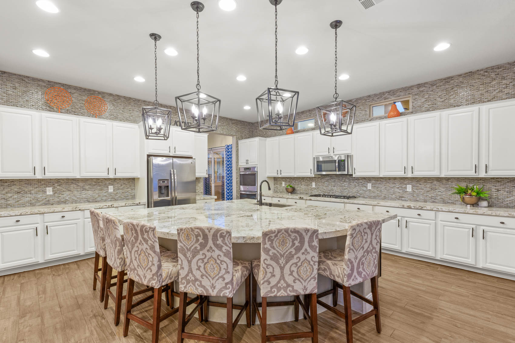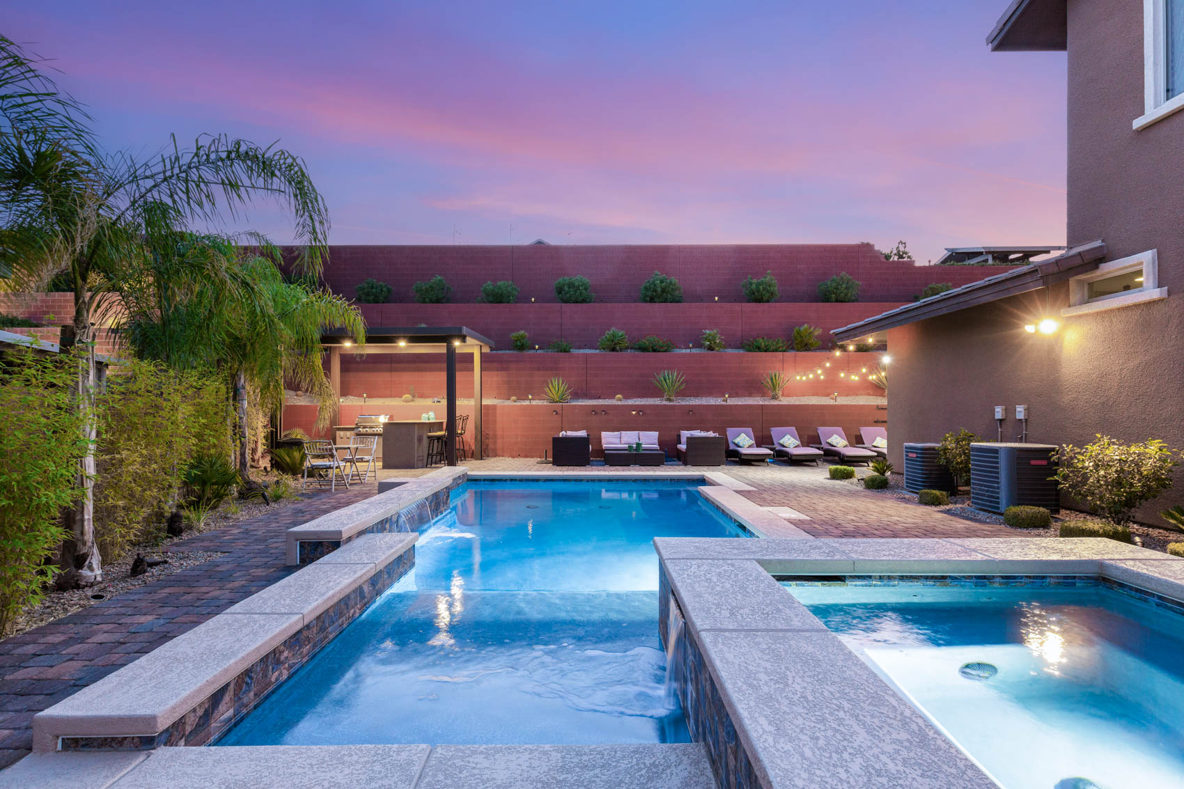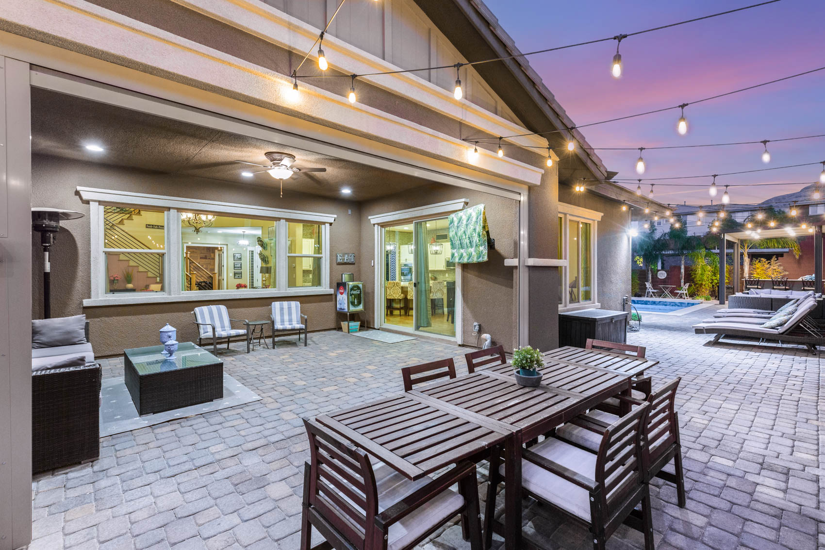 A remodeled white kitchen with stainless appliances, walk-in pantry, and 2 dining areas opens to a soaring 2-story living room with upgraded tile floors. Sliding doors lead to a private paradise with pool, spa, covered patio, outdoor kitchen, and landscape lighting. Additional outdoor space includes a motorized screen for privacy. Oversized 3-car garage with fans and water softener. In vibrant South Summerlin near parks, top schools, and amenitiesāthis is a rare find.