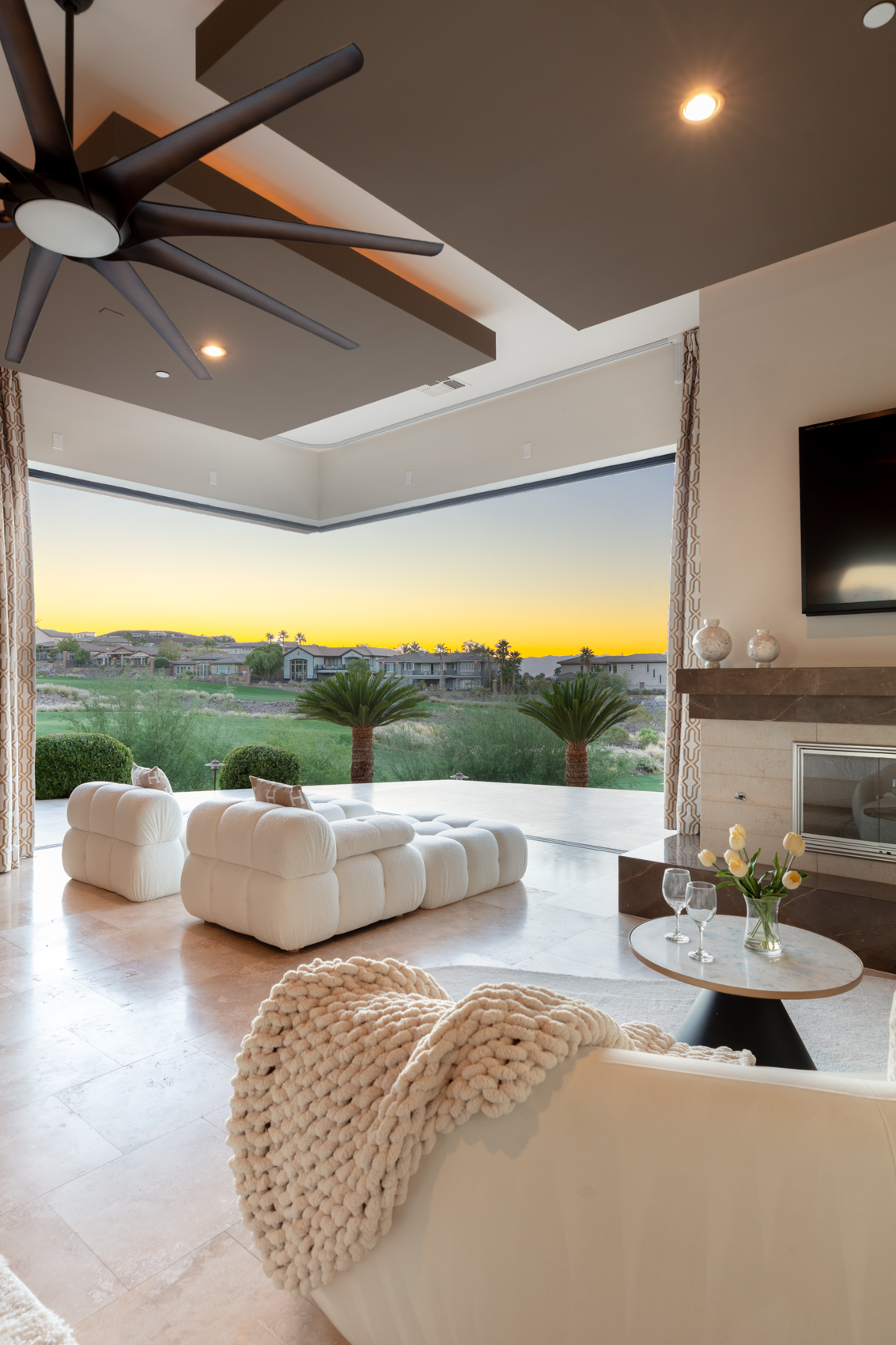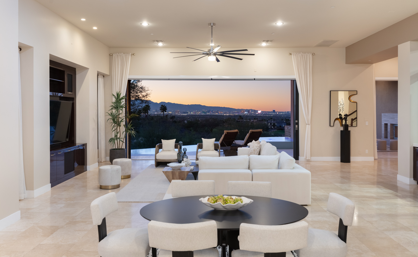 Perched high above the valley in the prestigious guard-gated community of MacDonald Highlands, 583 Saint Croix Street is a custom luxury estate that commands attention from every angle. With unobstructed, panoramic views of the glittering Las Vegas Strip, surrounding mountains, and the lush fairways of the DragonRidge Golf Course, this remarkable residence was designed to celebrate light, space, and sophisticated living.