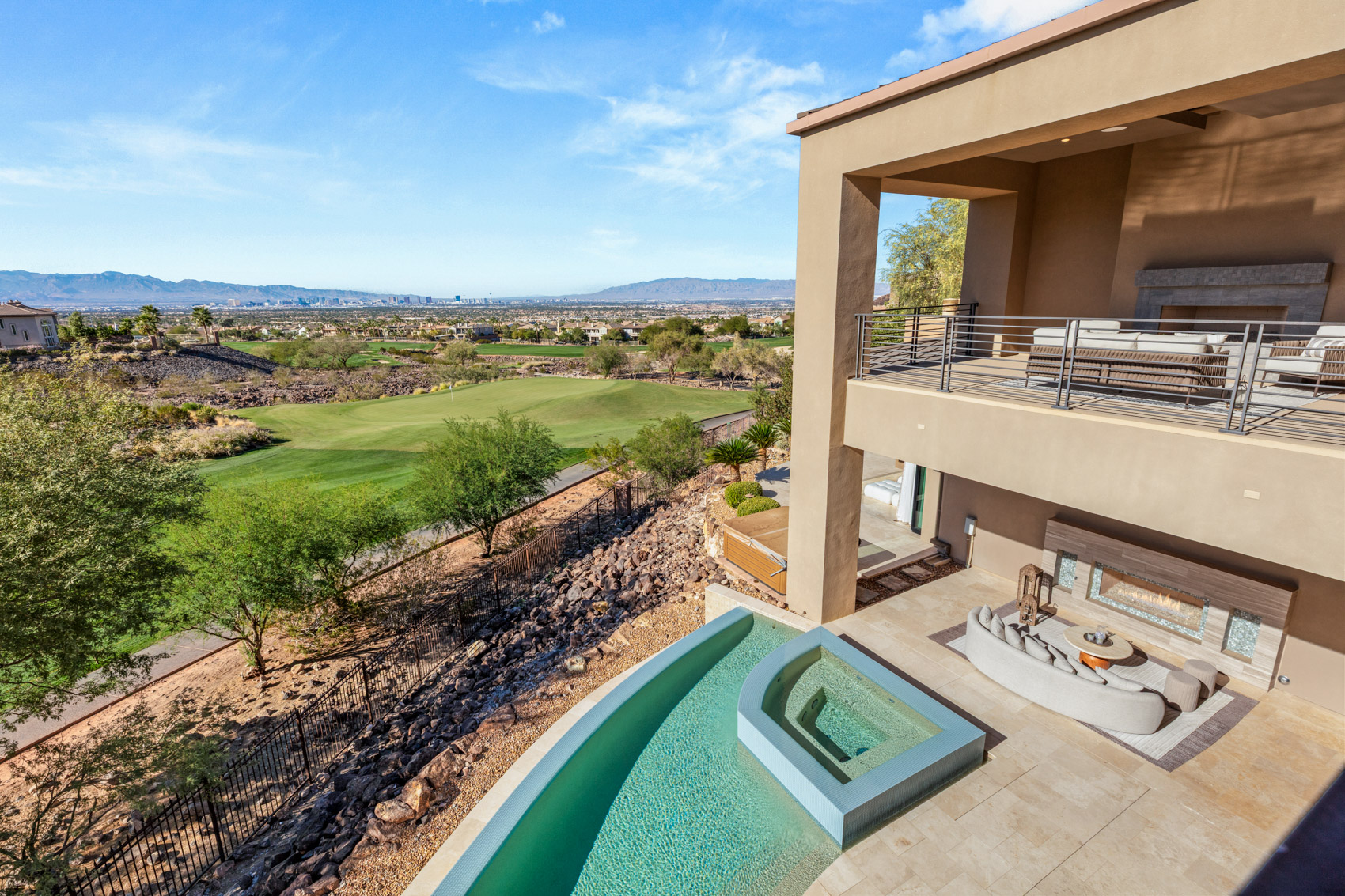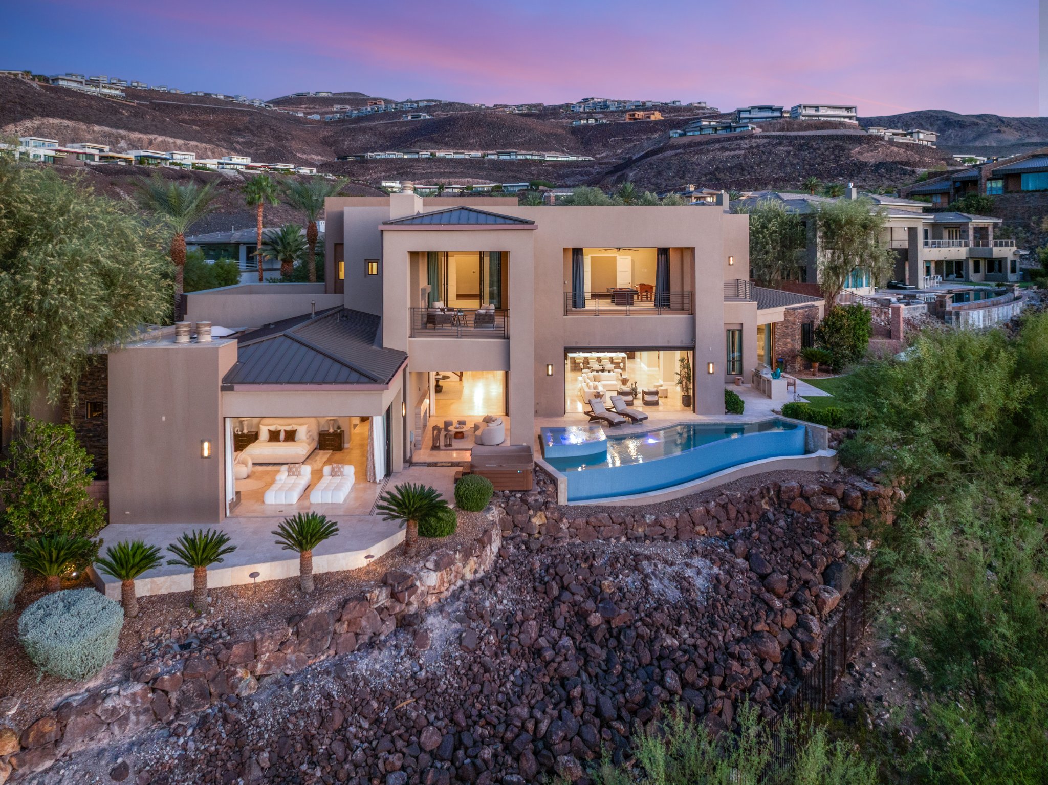 The main level showcases an effortless flow between the living, dining, and entertaining areas. The chefās kitchen serves as the heart of the home, featuring dual islands, double sinks, and top-of-the-line stainless steel appliances, all framed by sleek finishes and abundant storage. Adjacent is a refined dining space with a built-in wine display, perfect for intimate gatherings or formal occasions. The great room opens through pocketing glass doors to a covered patio lounge, where a fireplace and sweeping city views set the stage for unforgettable evenings. The primary suite, also located on the main level, is a private sanctuary designed for rest and rejuvenation. Corner pocketing doors extend the suite into the outdoor living area, offering direct access to the resort-style yard. Inside, the spa-inspired bath features an oversized walk-in shower with steam and multiple body jets, a large soaking tub, and two expansive closets, both with custom built-ins. Every detail has been considered to create an experience that is both indulgent and serene. The upper level continues the theme of luxurious living with a spacious game room complete with a bar and its own balcony overlooking the Stripāa perfect setting for entertaining or quiet enjoyment. An acoustically treated theater room offers cinematic immersion with surround sound and eight plush lounge chairs, bringing the movie experience home. For convenience and accessibility, the residence is equipped with a private elevator that seamlessly connects both levels. Outdoors, the property becomes a personal resort. The infinity-edge pool appears to flow into the horizon, framed by the golf course and skyline beyond. An attached spa, covered patio lounge with a cozy fireplace, and a separate built-in outdoor BBQ area create multiple spaces for entertaining or relaxation under the Nevada sky. Whether hosting large gatherings or enjoying a quiet sunset, this homeās design invites a lifestyle of comfort and connection. Set within MacDonald Highlands, one of Las Vegasā most prestigious and sought-after communities, residents enjoy 24-hour guard-gated security, world-class amenities, and access to the exclusive DragonRidge Country Club, featuring championship golf, tennis, fitness, and fine dining. The neighborhoodās elevated location offers unmatched privacy and breathtaking vistas while remaining just minutes from the vibrant energy of the Strip, premier shopping, dining, and entertainment. A home of this caliberāwhere craftsmanship, design, and location converge so flawlesslyāis a rare opportunity in todayās market. 583 Saint Croix Street isnāt just a residence; itās a statement of style and sophistication, a sanctuary that captures the essence of modern desert luxury while offering front-row seats to the glittering heart of Las Vegas.