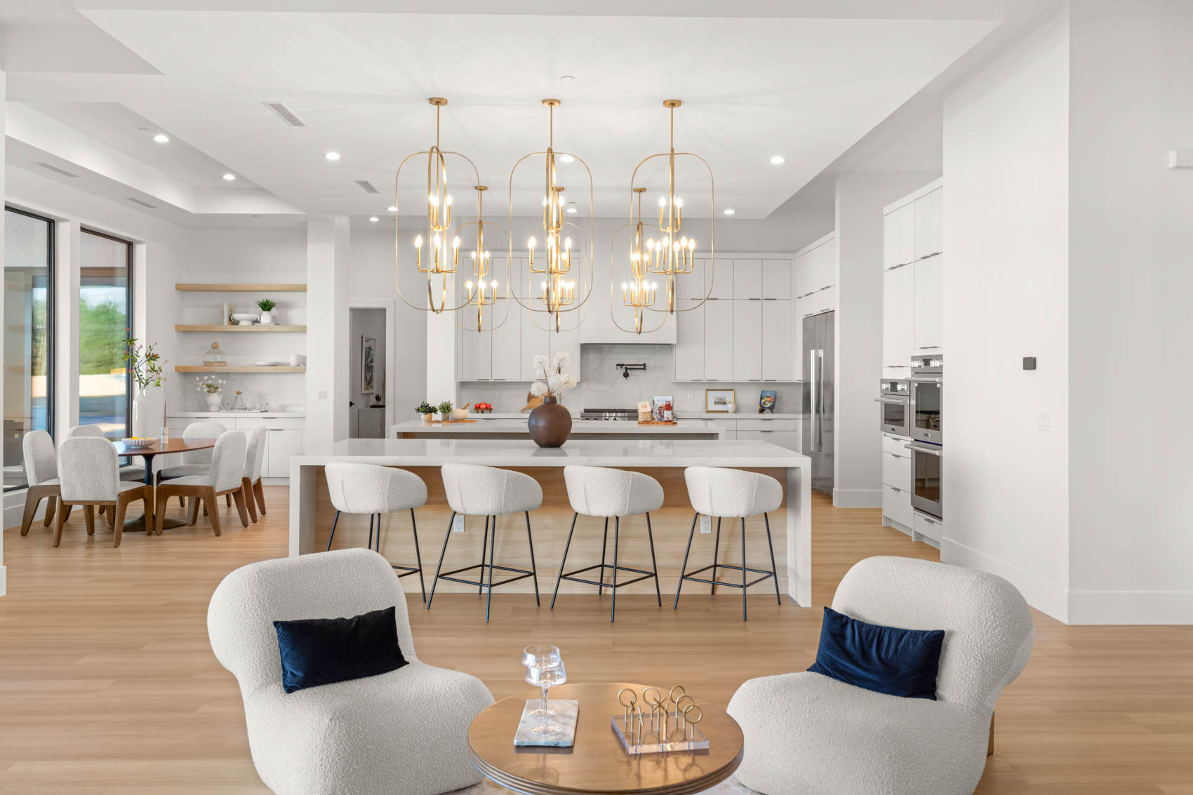 From the moment you arrive, the homeās commanding presence is evident. Clean modern lines, a thoughtful landscape design, and a stately approach set the tone for what waits inside. The grand entryway provides an impressive welcome, opening into a beautifully proportioned layout where 12-foot ceilings and an abundance of natural light create a sense of openness and ease. Level 5 smooth wall finishes lend a gallery-like backdrop for art and dĆ©cor, while rustic LVP flooring introduces warmth and texture, grounding the homeās contemporary aesthetic.