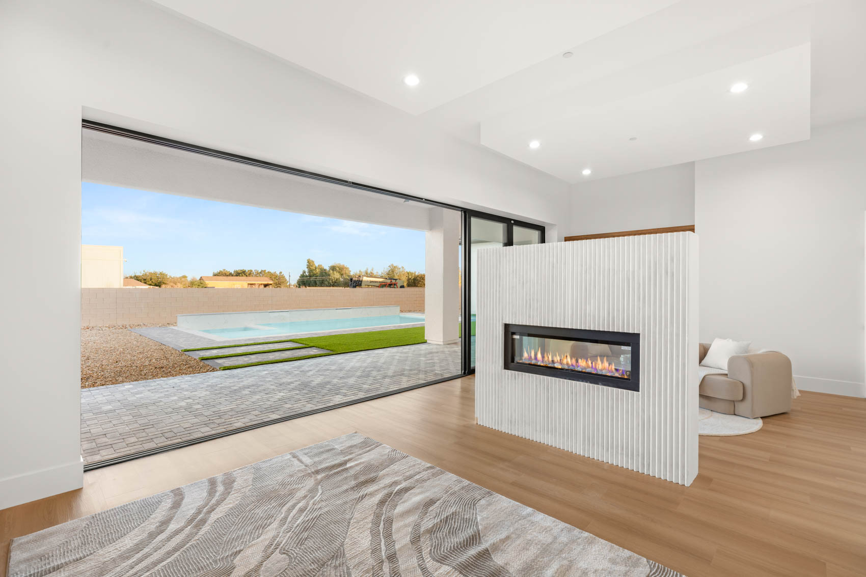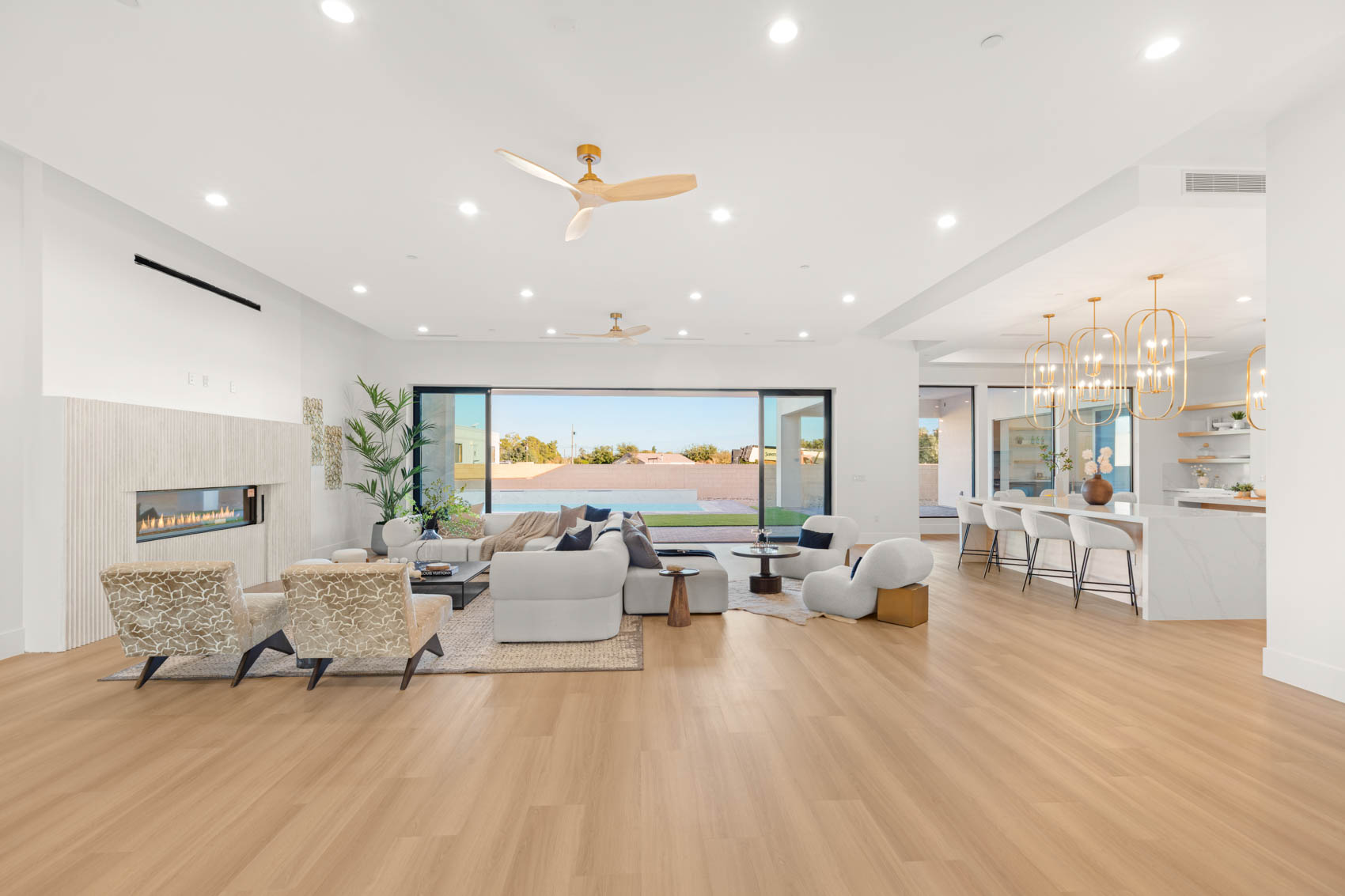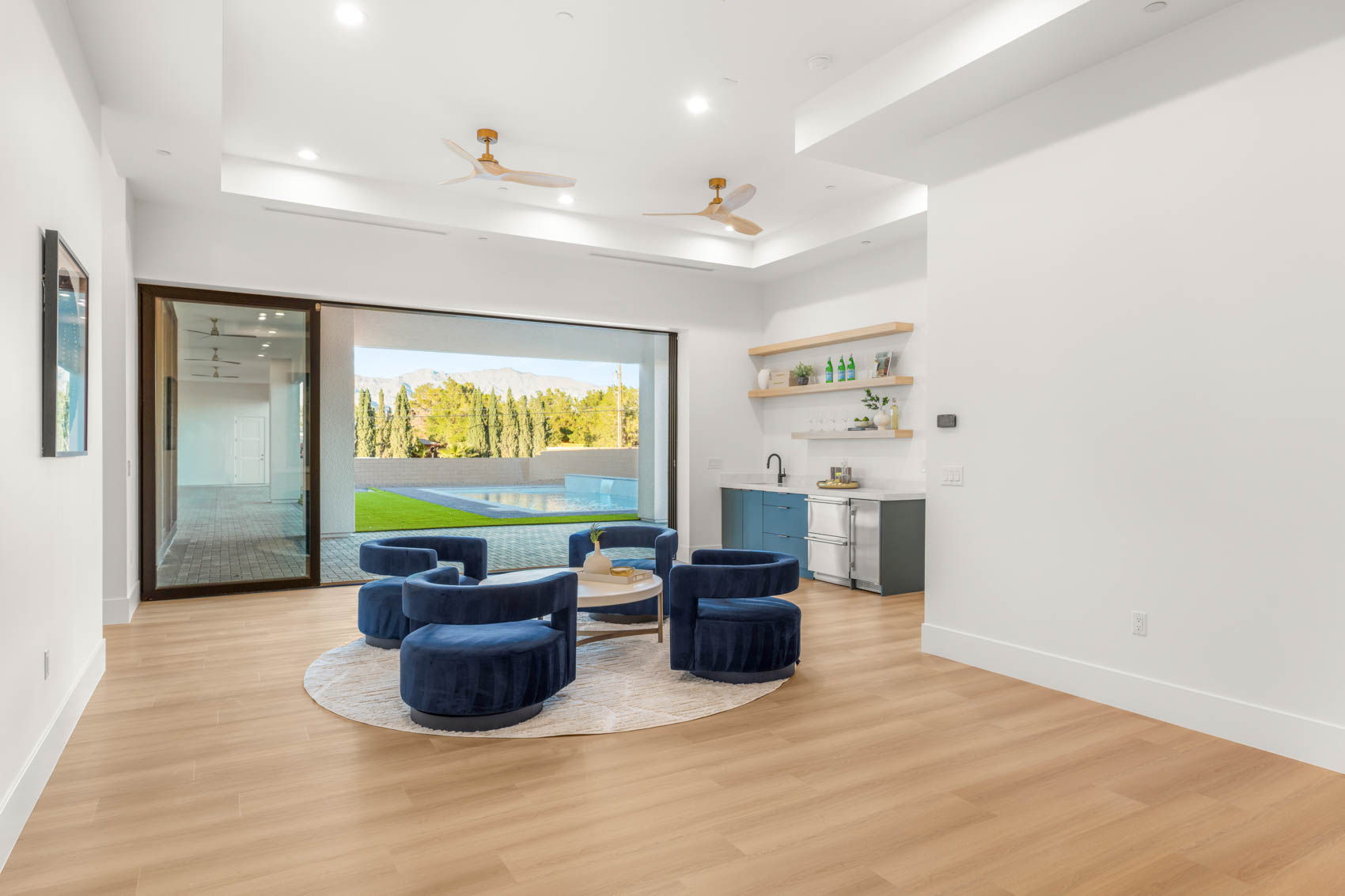 At the heart of the residence, the great room serves as both a statement space and a central gathering hub. Its striking refrigerated wine wall functions as a showpiece for collectors and entertainers, while the roomās expansive glass doorsāframed in sleek black-trimmed, sun-coated aluminumāblur the line between indoor and outdoor living. Designed to maximize natural light and views, these windows invite the outdoors in, creating a seamless extension of the living space. The adjacent chefās kitchen is equally impressive, blending high style with exceptional functionality. Quartz countertops, custom European cabinetry, and a premium appliance package support culinary pursuits of any scale. A large island offers ample workspace and casual seating, making it the perfect place for morning coffee, evening conversations, or hosting gatherings with friends and family. Every detailāfrom the fixtures to the layoutāhas been curated to elevate both everyday living and entertaining. The primary suite occupies its own private wing, offering a restful sanctuary designed with tranquility in mind. Two oversized walk-in closets provide extensive storage, while the spa-inspired bath features luxurious finishes, a soaking tub, walk-in shower, and thoughtfully designed lighting that enhances the serene ambiance. Each of the secondary bedrooms includes its own private ensuite bath, ensuring comfort, convenience, and privacy for guests or family members. Whether used as sleeping quarters, flex spaces, or home offices, these rooms offer versatility without compromising style. Completing the interior is a dedicated theatre roomāa coveted feature for movie nights, game-day viewing, or immersive entertainment experiences. Its location and design ensure an intimate, cinematic environment free from outside distractions. The estateās outdoor living spaces are equally compelling, designed to amplify relaxation and recreation. A 1,254-square-foot covered patio spans the rear of the home, creating an expansive shaded retreat perfect for dining, lounging, or hosting events. Beyond the patio, a sparkling pool and spa serve as the focal point of the backyard, surrounded by fully landscaped grounds that combine beauty with easy maintenance. Whether enjoying quiet mornings outside or entertaining on a grand scale, the outdoor spaces offer both functionality and resort-style ambiance. For car enthusiasts, adventurers, or those needing substantial storage, the propertyās garage accommodations are unmatched. In addition to the 4-car garage, the rare 45ā RV garage offers exceptional capacity for recreational vehicles, car collections, equipment, or additional storage needsāproviding a level of flexibility uncommon in a luxury residential setting. Throughout the home, thoughtful craftsmanship, carefully selected finishes, and a cohesive design vision come together to create a residence that is both striking and welcoming. Its single-story layout enhances accessibility and ease of movement, while its location within an intimate gated community offers enhanced peace and privacy without sacrificing proximity to nearby conveniences. Infused with modern elegance, generous scale, and exceptional amenities, 5855 St. Ebbes Court stands as a distinctive offering in the Las Vegas luxury marketāa one-of-a-kind retreat where comfort, style, and sophisticated living converge seamlessly.
