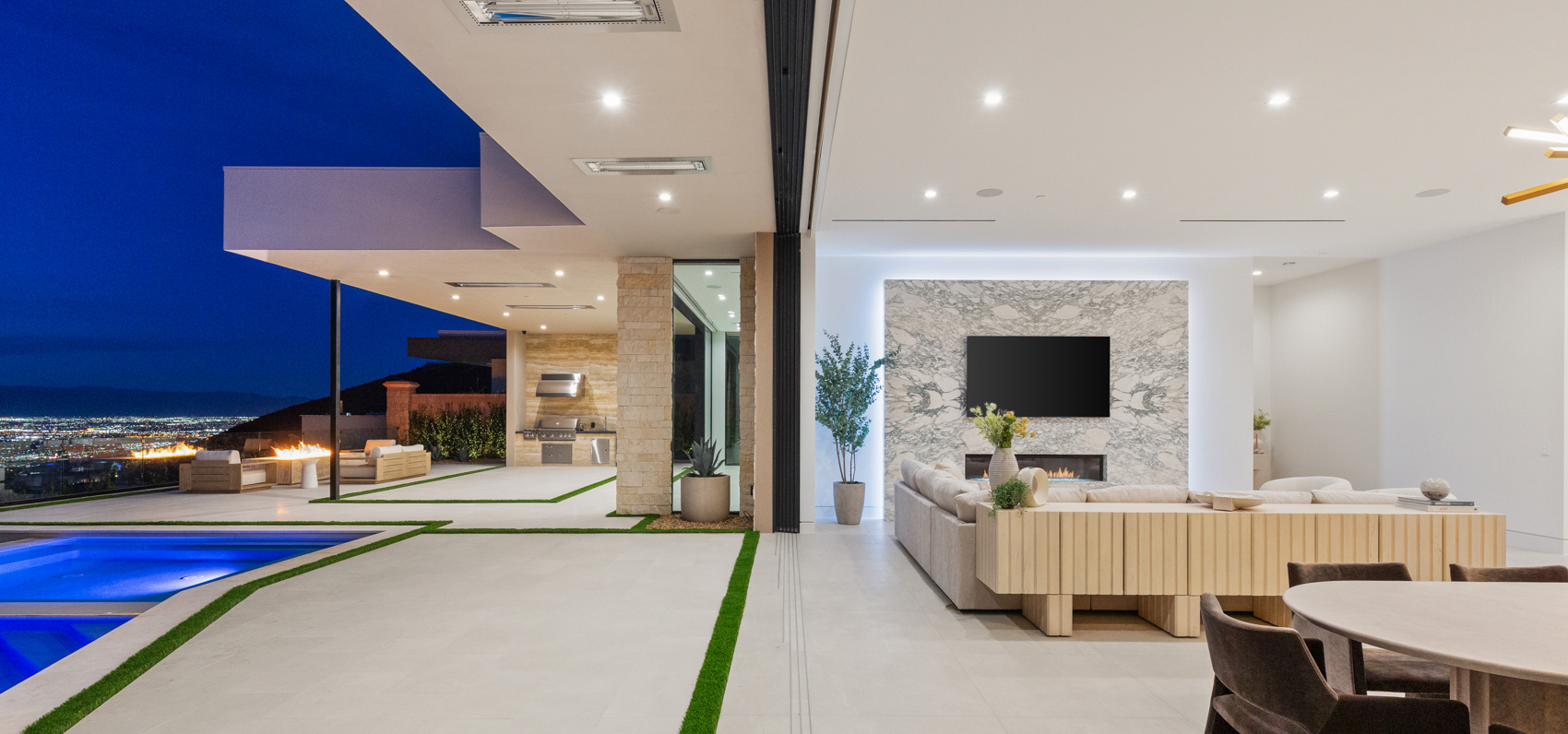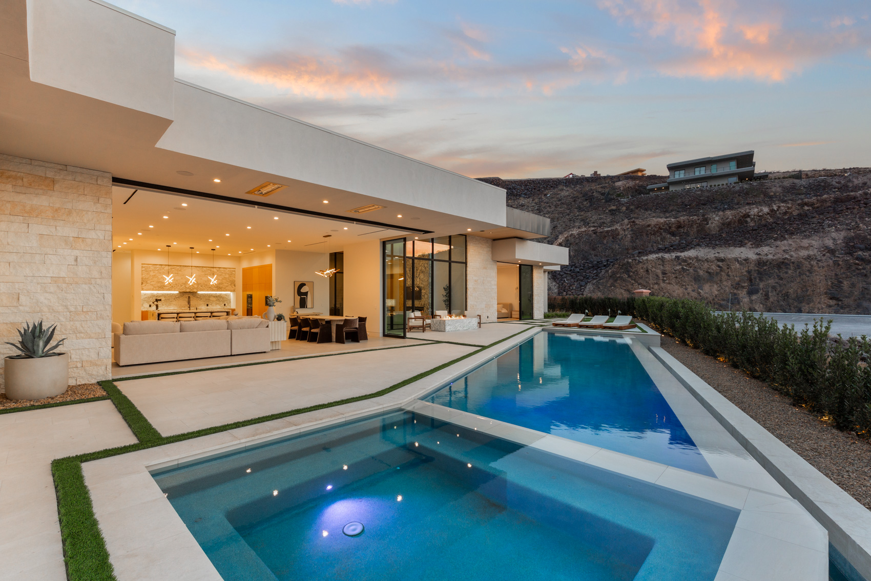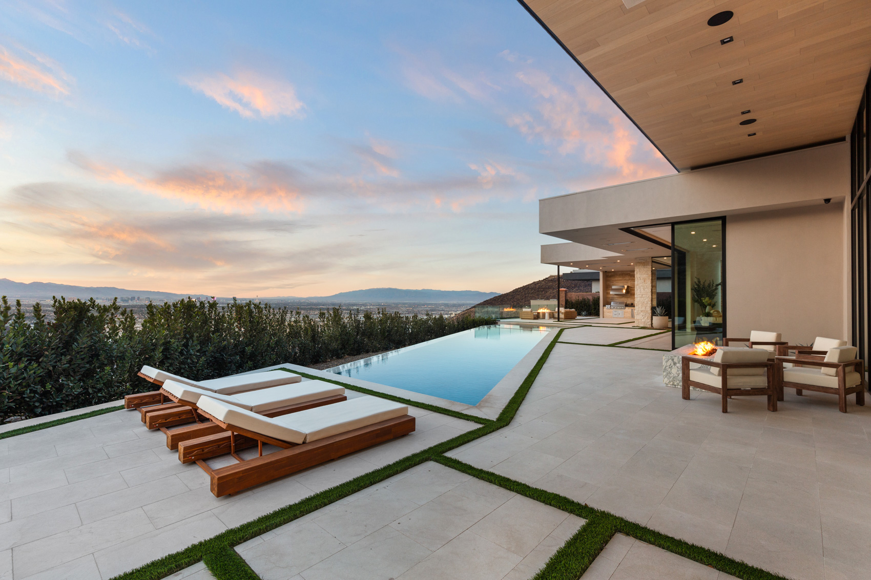 The thoughtfully designed floor plan includes a state-of-the-art theater room, a stylish bar, and a game roomāall curated for the ultimate in leisure and entertainment. A private home gym, complete with a sauna, provides a dedicated space for wellness and relaxation. Culinary enthusiasts will appreciate the gourmet kitchen, outfitted with top-of-the-line appliances, exquisite cabinetry, and a waterfall-edge island that serves as both a workspace and a gathering spot. A separate butlerās kitchen ensures seamless hosting, while a third kitchen in the private casita offers additional convenience and versatility. Equipped with Crestron smart home technology, this estate provides intuitive control over lighting, climate, security, and entertainmentādelivering a living experience that is as effortless as it is luxurious. Step outside to discover an outdoor sanctuary designed for year-round enjoyment. The 65-foot infinity-edge pool seemingly merges with the skyline, creating a tranquil yet dramatic focal point. A built-in spa, two firepits, and built-in patio heating enhance the ambiance, while the outdoor kitchen and barbecue area set the stage for unforgettable al fresco dining and gatherings. Situated in one of Las Vegasā most sought-after communities, 591 Cityview Ridge presents an unparalleled opportunity to own a home that epitomizes luxury, exclusivity, and sophistication. Experience the pinnacle of desert modern living in MacDonald Highlandsāwhere world-class amenities, breathtaking scenery, and exceptional design come together in perfect harmony.