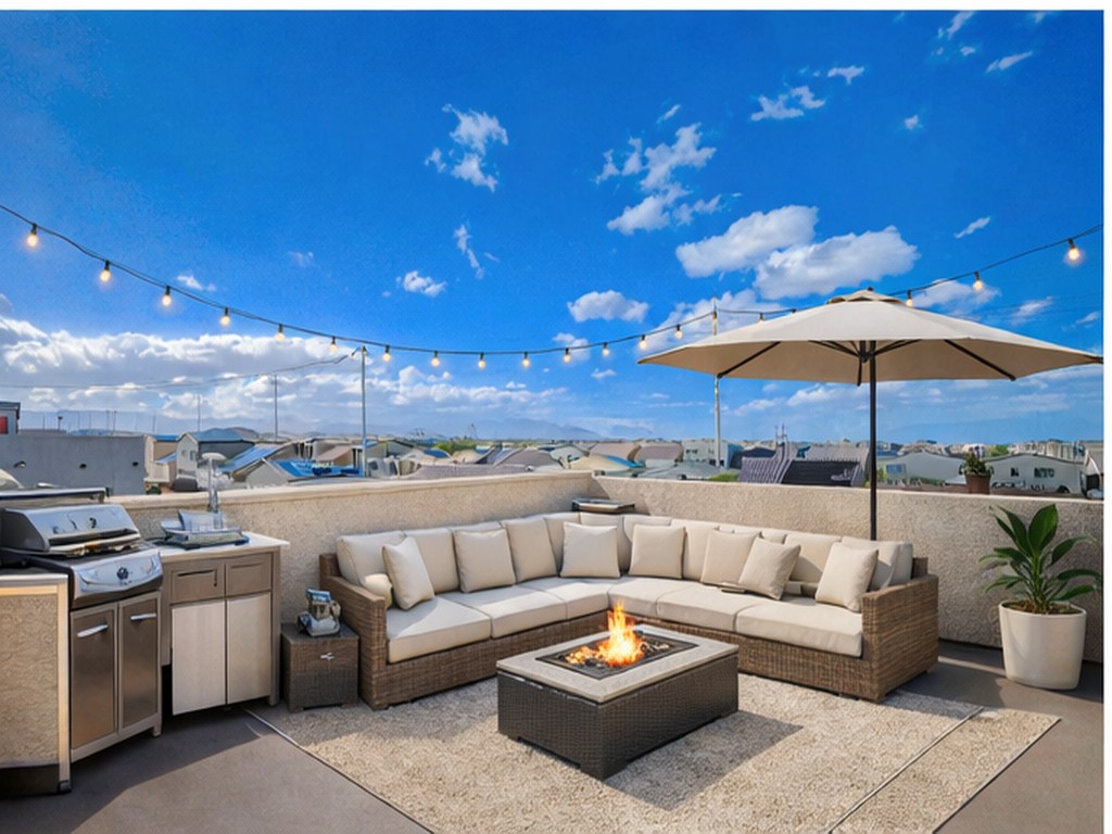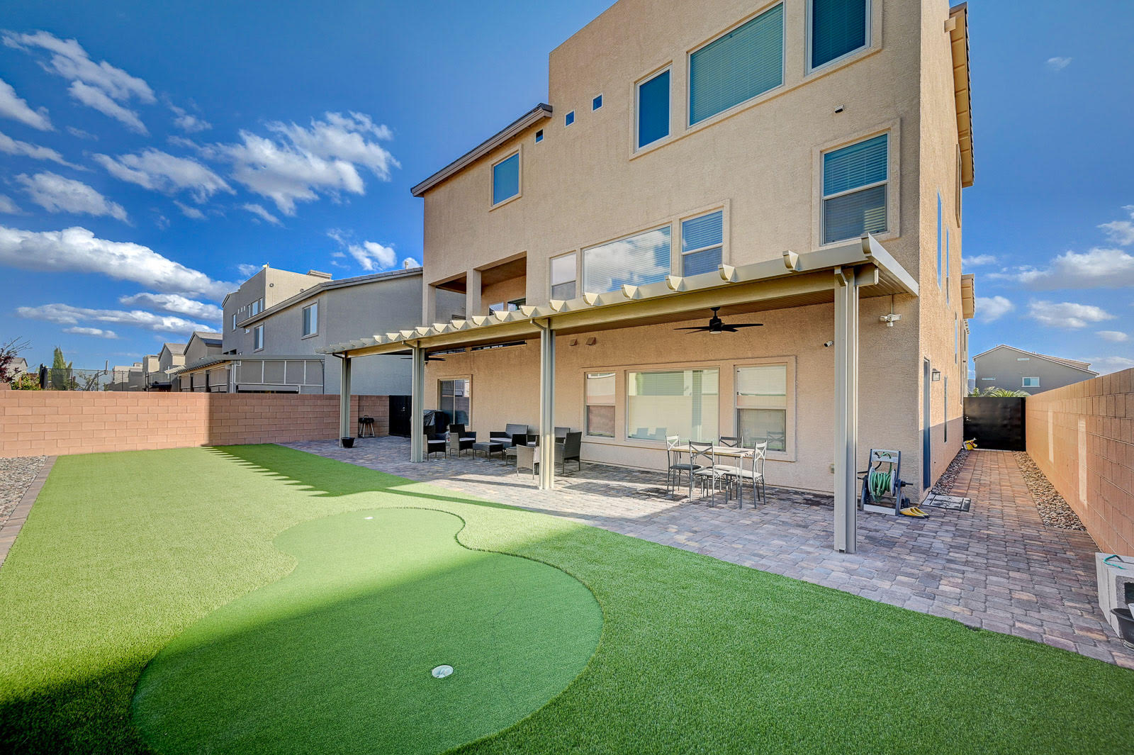 Multiple living spaces include a formal living room, great room, and private den. The chef’s kitchen features a large island with breakfast bar, walk-in pantry, upgraded cabinetry, and granite countertops. The upstairs primary retreat offers a spa-inspired bath with soaking tub and walk-in shower. Enjoy front and rear balconies, a finished three-car garage, and a covered patio with private putting green.Huge and abundant storage closets throughout! The rooftop deck is equipped with electrical, lighting, and water, showcasing stunning 360-degree city and mountain views, perfect for sunsets and holiday fireworks.