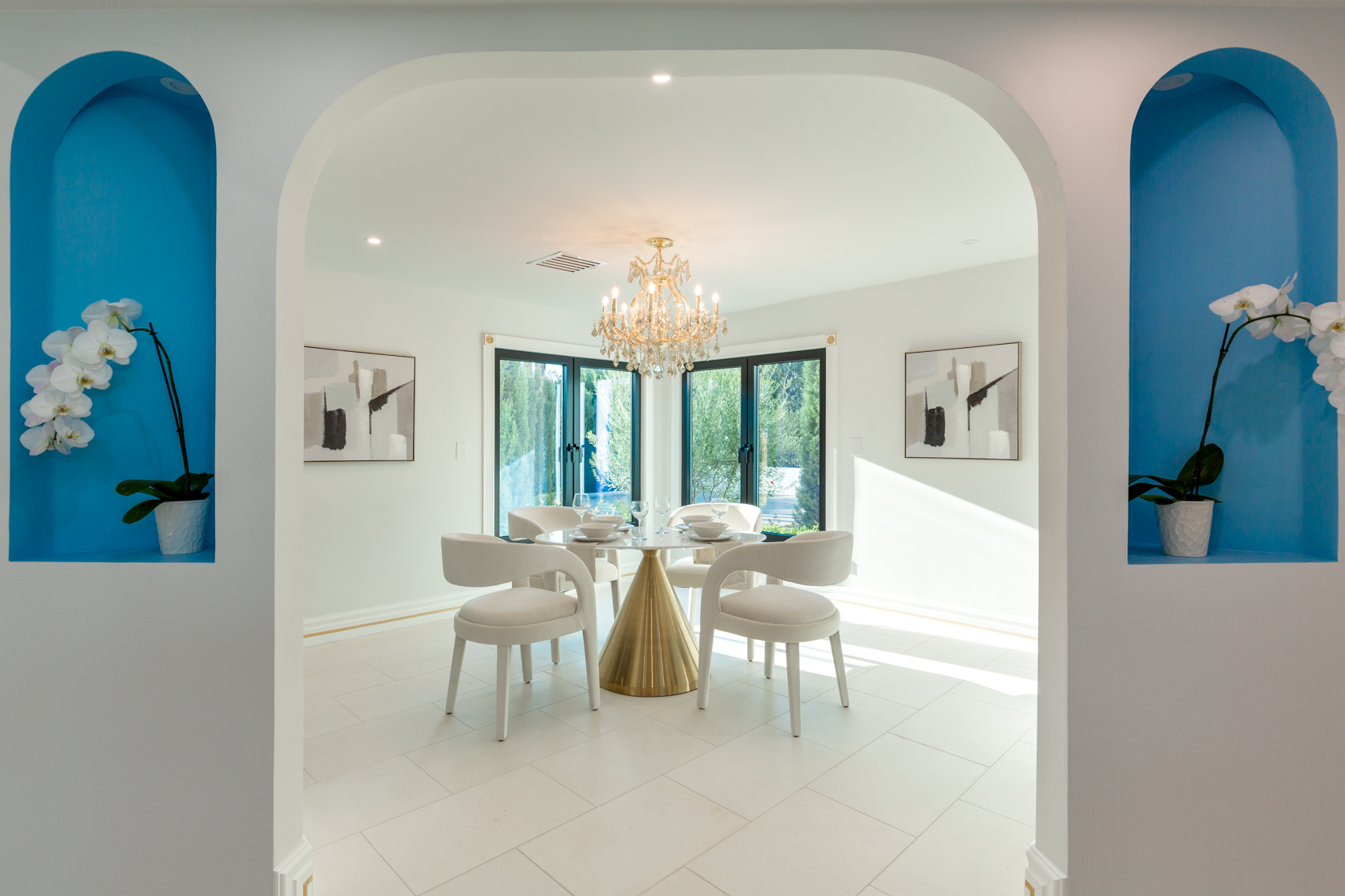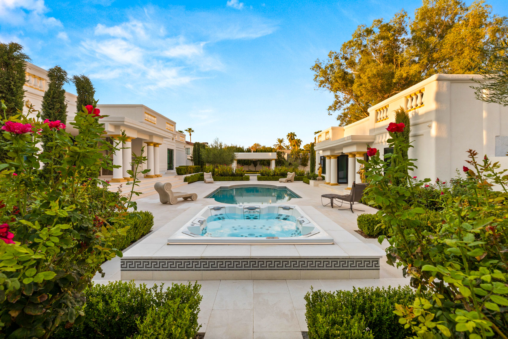 Experience French chateau elegance in this custom Las Vegas estate. Nestled on over 3/4 acre, this residence features lush landscaping with mature trees, serene water features, a grand circular driveway, and a vegetable garden with raised planters, fruit trees, and a dedicated dog run. Spanning 4,100 sq ft, including a guest casita, this home has over $2.1M in upgrades, from imported limestone and Carrara marble to hand-painted gold leaf details.