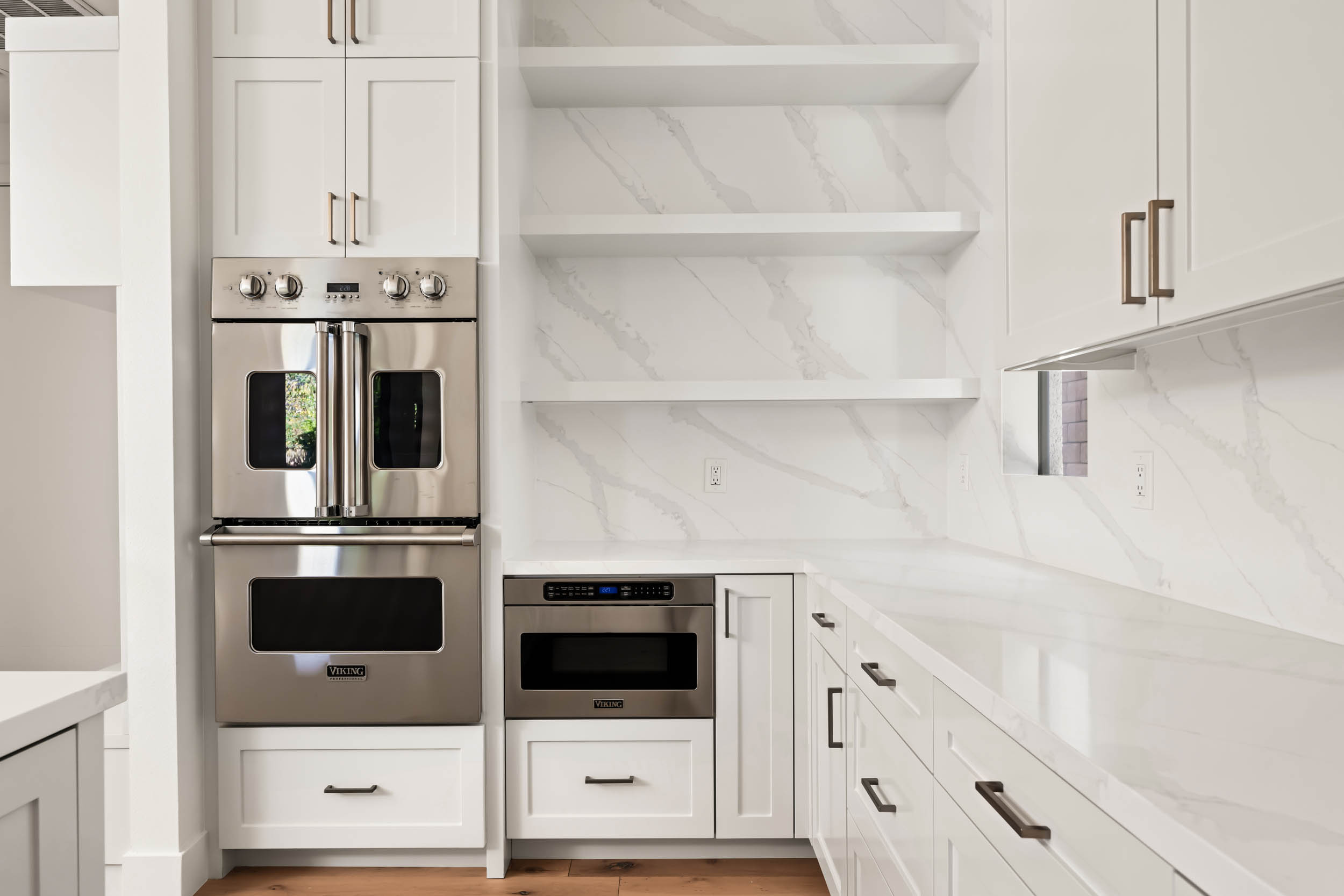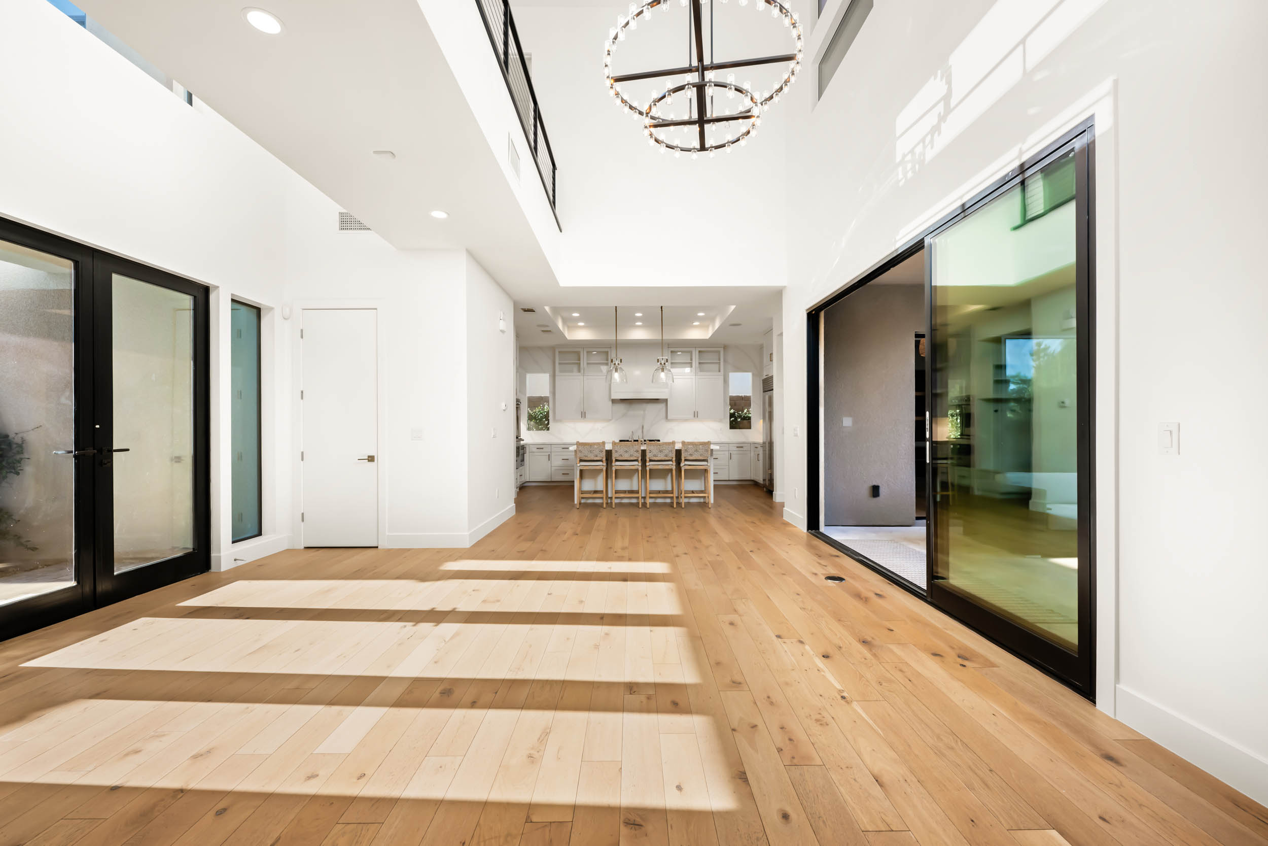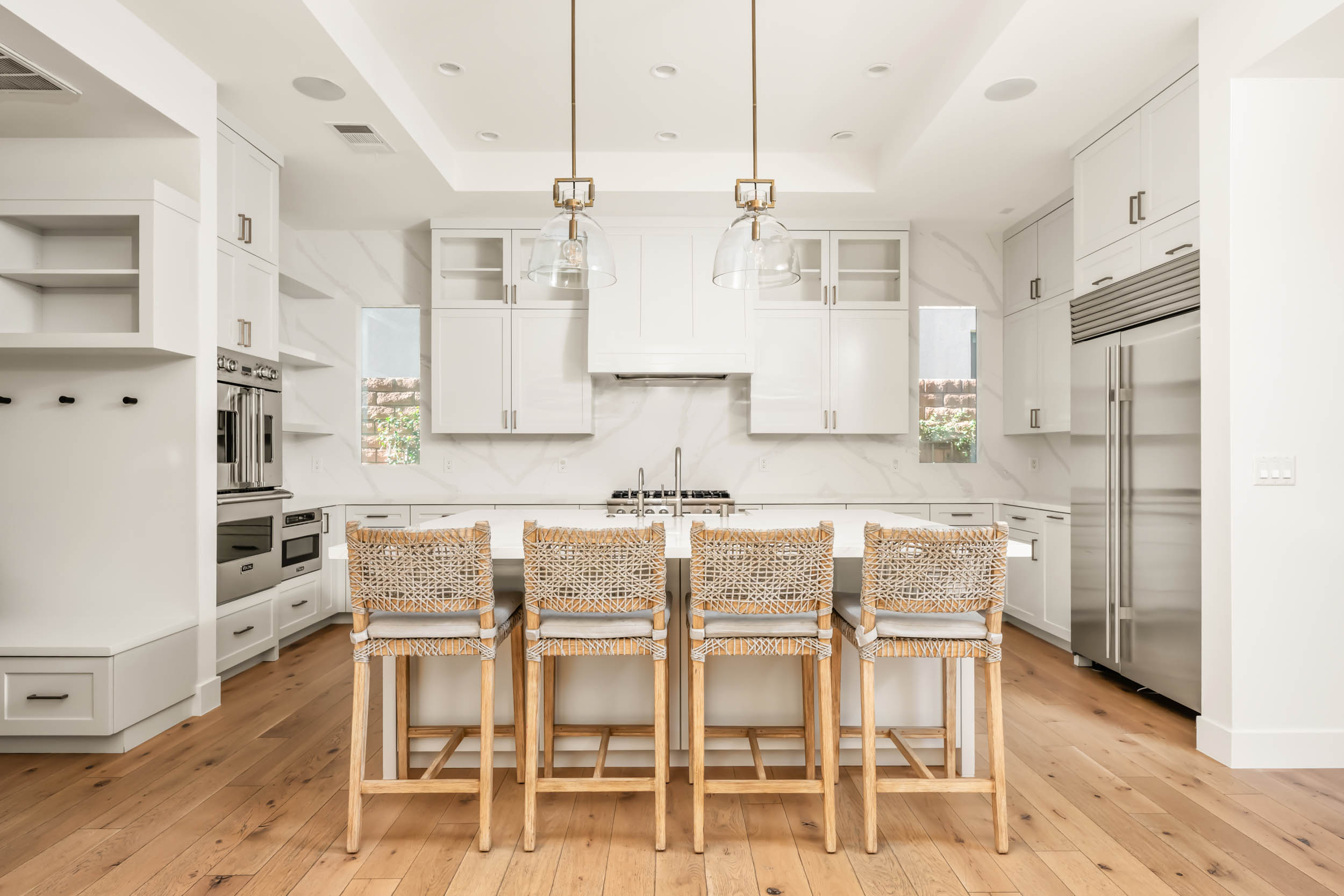 The heart of the home is a light-filled gourmet kitchen featuring an expansive waterfall island, custom cabinetry, premium stainless steel appliances, and designer lighting—perfectly positioned for entertaining and everyday living. European oak flooring flows throughout, complementing the home’s soft neutral palette and elevated finishes.