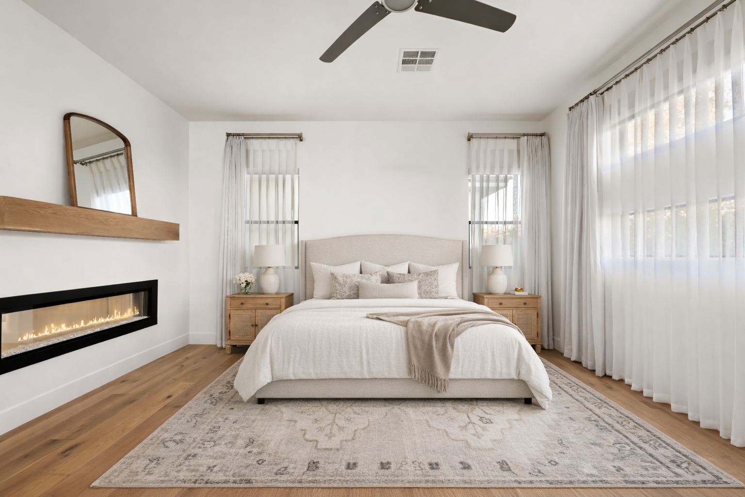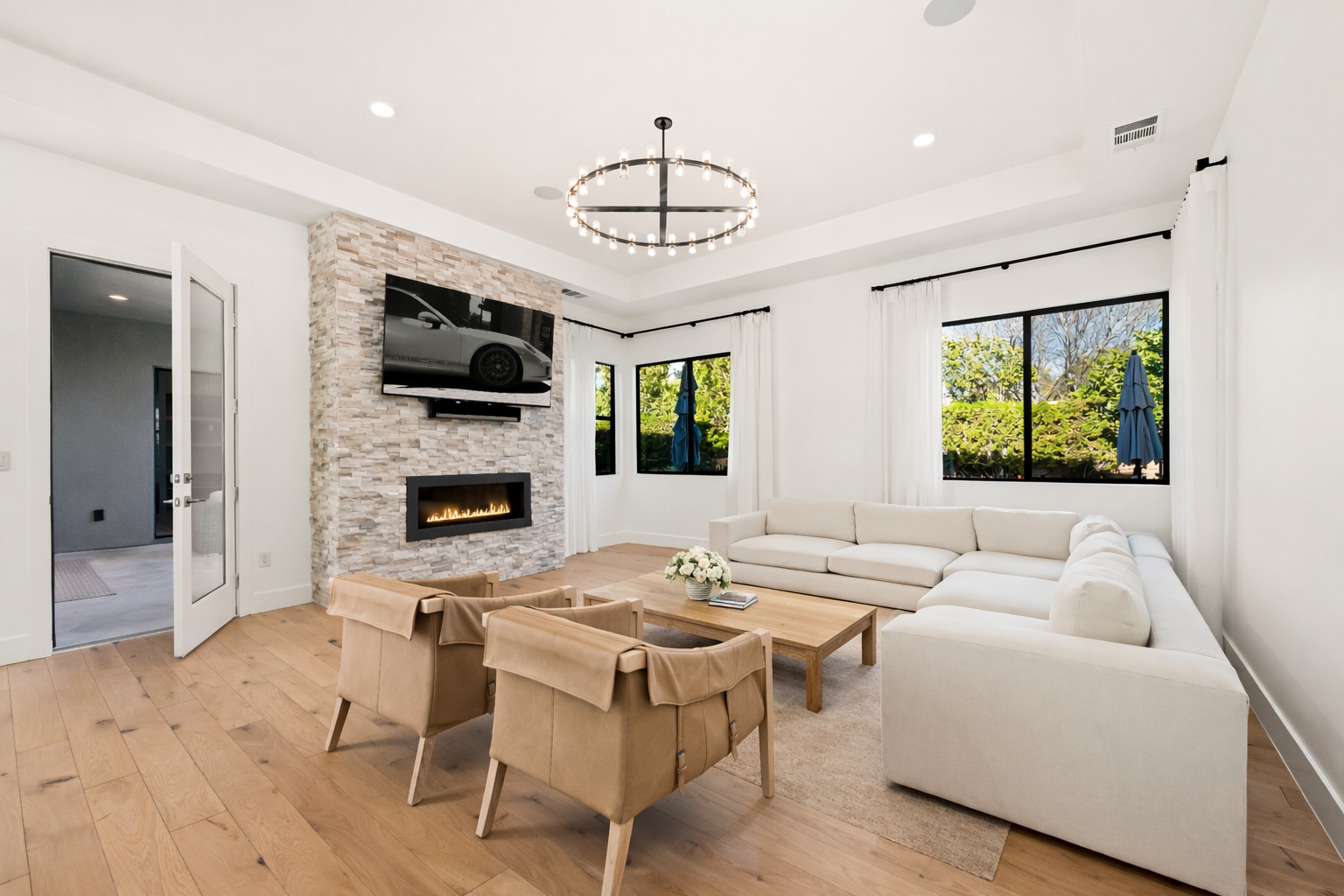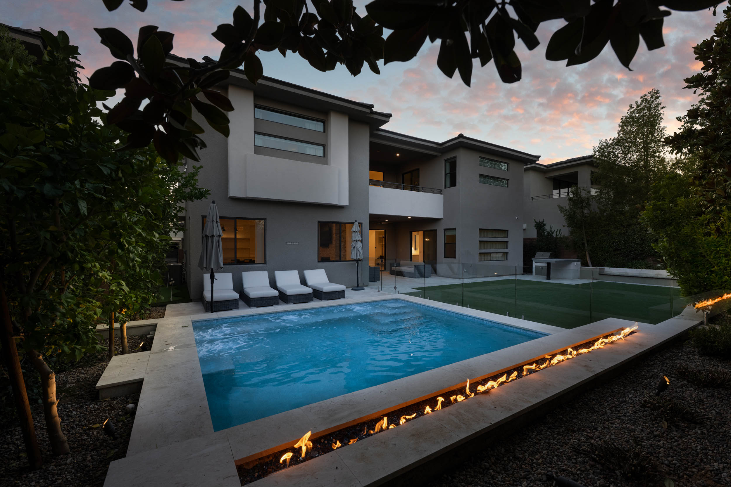An open dining space anchors the main living areas, framed by custom built-ins and sleek architectural details. Generously scaled living spaces open effortlessly to the outdoors, creating a true resort-style experience. The expansive primary suite is a private sanctuary, featuring a spacious bedroom, a separate sitting area ideal for relaxation or a quiet retreat, and a spa-inspired primary bathroom with a freestanding soaking tub, dual vanities, and refined tilework. Additional rooms continue the home’s cohesive design with three additional ensuite bedrooms. The backyard is a private retreat, complete with a modern pool and spa, fire feature, manicured landscaping, and multiple areas for lounging and entertaining—ideal for both intimate evenings and larger gatherings.