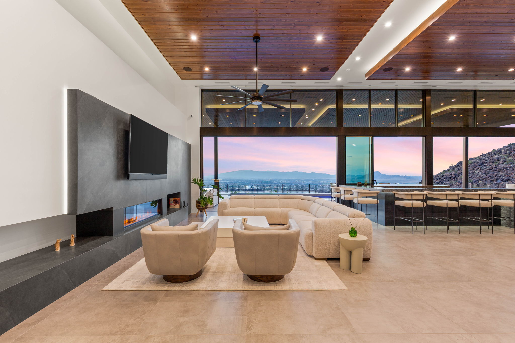 Upon arrival, a striking pivoting glass front door introduces a dramatic open layout defined by soaring ceilings, walls of pocketing glass, and a seamless indoor-outdoor flow. Throughout the home, sculptural wavy concrete serves as both architecture and artāits flowing form inspired by water and crafted through a long, delicate, almost sculptural process. This concrete is not merely a finish; it is the emotional and visual rhythm of the home, creating a calming, cohesive design language from entry to living spaces. Natural solid hardwood is intentionally woven throughout the residence, including beneath every eave and across interior ceilings, softening the modern lines and grounding the home in warmth and organic texture. In the temperature-controlled wine room, solid hardwood walls were purposefully selected to help regulate humidity, reduce the risk of cork drying, and resist moldāan elegant blend of beauty and function. The chefās kitchen anchors the home with top-tier stainless steel appliances, an oversized waterfall island, and abundant storage, while an adjacent bar connects both interior and exterior entertaining areas with a wine fridge, ice maker, and beverage refrigeration. Designed for both intimate living and grand-scale entertaining, the home offers approximately 3,000 square feet of covered outdoor living space and expansive view frontage that captures the Strip from multiple vantage points. The primary suite is a serene retreat, featuring its own fireplace, wet bar, dual custom closets (one with center island), automated blackout shades, and a spa-like bathroom with steam shower, soaking tub, dual vanities, and dual water closets. Five ensuite bedrooms provide flexibility, with the fifth currently configured as a private office. Wellness and entertainment are seamlessly integrated with a dedicated gym, private theater, and separate media/game area. Two laundry rooms enhance functionality, while the 4-car side-loading garage offers additional storage. Outdoors, the home unfolds into a resort-style environment designed for both celebration and solitude. The pool and spa are complemented by a sunken fire pit lounge, expansive covered terraces, and a full indoor-outdoor bar. A landscaped Zen hillsideādesigned specifically for meditation and tranquilityāadds a rare spiritual dimension to the property, alongside a private sauna tucked into the outdoor sanctuary. Located within Ascaya, one of Hendersonās most exclusive guard-gated communities, residents enjoy 24/7 security, a private clubhouse, fitness center, tennis and pickleball courts, and curated social experiences. Hale Heights is more than a residenceāit is a modern island in the desert, a sculptural work of art, and a private sanctuary above the city, designed with intention, emotion, and enduring beauty.