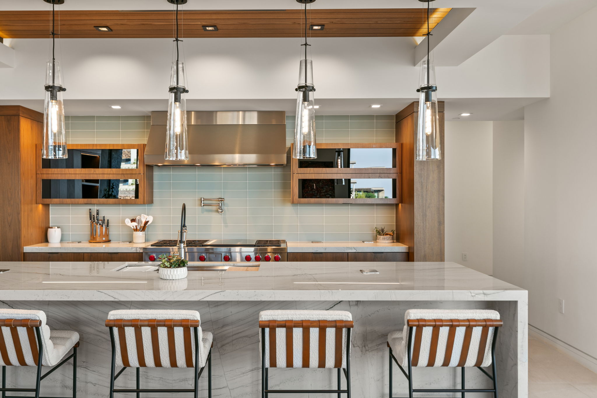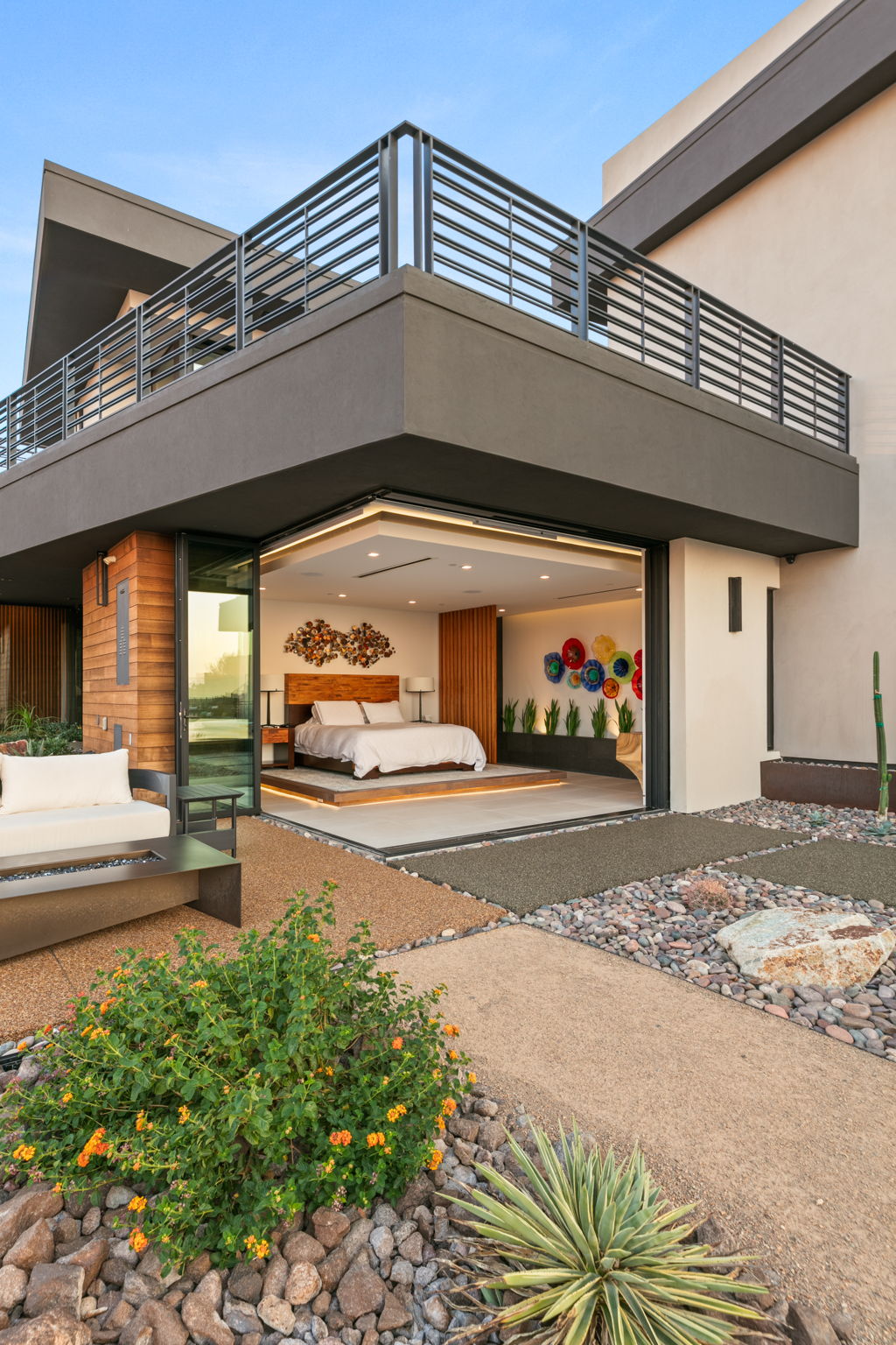 Upon arrival, the homeās dramatic front entrance greets you with striking water and fire features, setting the tone for the remarkable experience that lies within. Inside, the open floor plan is flooded with natural light, highlighting the homeās organic wood and stone elements, adding warmth and balance to its sleek, modern design. The home features 5 bedrooms, each with an ensuite bathroom, ensuring comfort and privacy for both residents and guests.