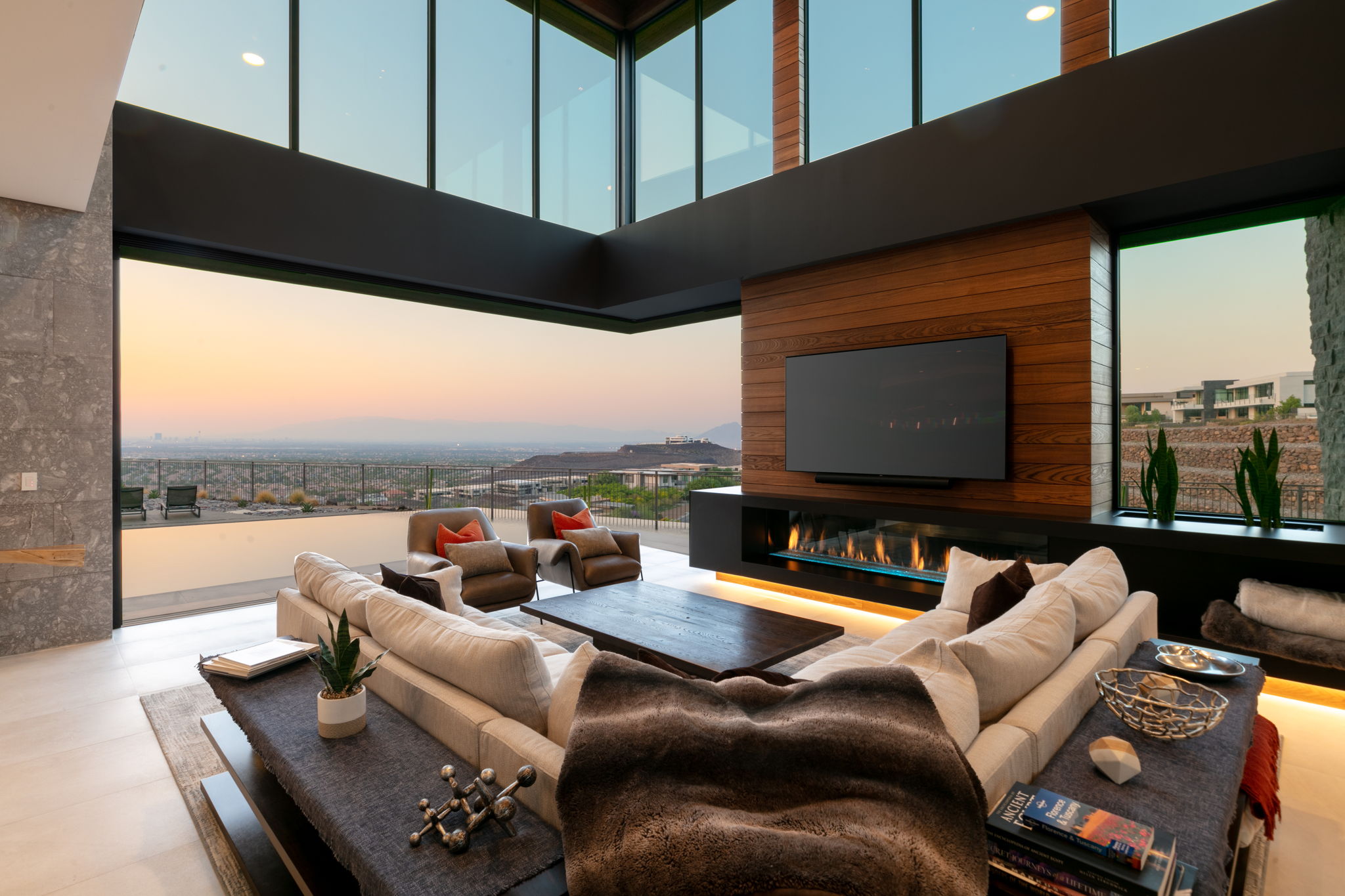 The primary suite, located on the main level, is nothing short of a private retreat. With pocket sliders that lead directly to the infinity-edge pool and spa, it effortlessly blends the indoors with the outdoors. The spa-like bathroom exudes luxury with its freestanding stone soaking tub, oversized multi-head shower, and river rock accents. A large, private window in the walk-in shower offers peaceful garden views, creating a serene bathing experience. The primary closet features custom built-ins and a large center island for ample storage. Designed for both grand entertaining and intimate gatherings, the home features a large chefās kitchen with an oversized waterfall island, upgraded stainless steel appliances, wood cabinetry, and a separate full prep kitchen. The adjacent casual dining area, with pocket sliding doors, opens to a fully covered outdoor kitchen with a spacious seating area, perfect for al fresco dining. In addition, a formal dining room offers an elegant space for more refined occasions, complemented by a large, temperature-controlled wine room. Multiple outdoor fire lounge areas, terraces, and an infinity-edge pool with spa offer breathtaking Strip views, enhancing the sense of living in a private luxury resort. Upstairs, a bar lounge loft area, encased in floor-to-ceiling windows, provides a perfect spot for relaxing with friends while taking in the views. A separate media room, complete with a mini bar, is ideal for movie nights or entertaining. The acoustically treated listening room is a special addition, providing an intimate space for music enthusiasts. The homeās 5-car garage and oversized driveway offer ample parking, while the thoughtful layout ensures privacy in every corner of the home. Whether enjoying quiet moments in the secluded outdoor areas or entertaining guests in one of the many spacious rooms, this property offers both peace and privacy. Situated in ASCAYA, one of the most coveted and exclusive luxury communities in Henderson, this home offers not only unparalleled views but also the prestige and privacy that come with living in a master-planned community known for its architectural excellence. ASCAYAās elevated location in the McCullough Range ensures that the panoramic vistas are not just reserved for the Strip, but extend to the surrounding desert landscape, offering a truly unique perspective. Homes like this rarely come on the market in ASCAYA. The combination of modern luxury, natural elements, privacy, and the sheer scale of its design make this property an extraordinary find. This estate is more than just a homeāitās a lifestyle, offering a daily experience of resort living, unparalleled views, and exquisite design. For those seeking a truly one-of-a-kind property that offers both seclusion and the ability to entertain on a grand scale, 6 Vista Crescent Court is an unmatched opportunity.