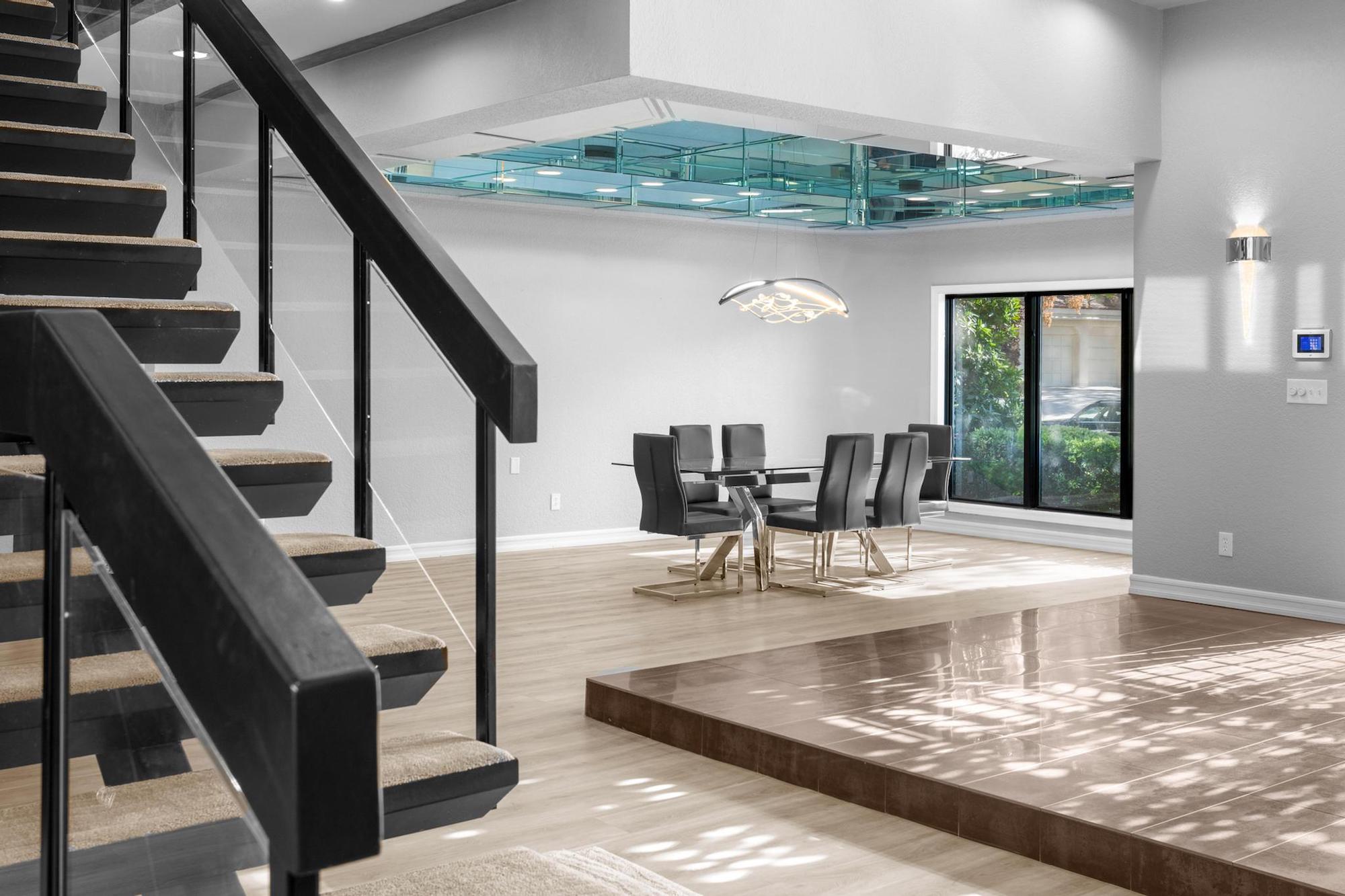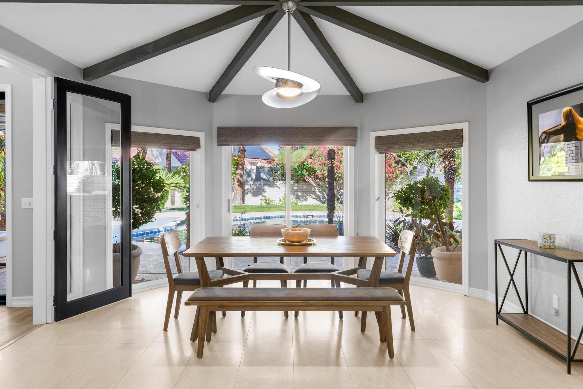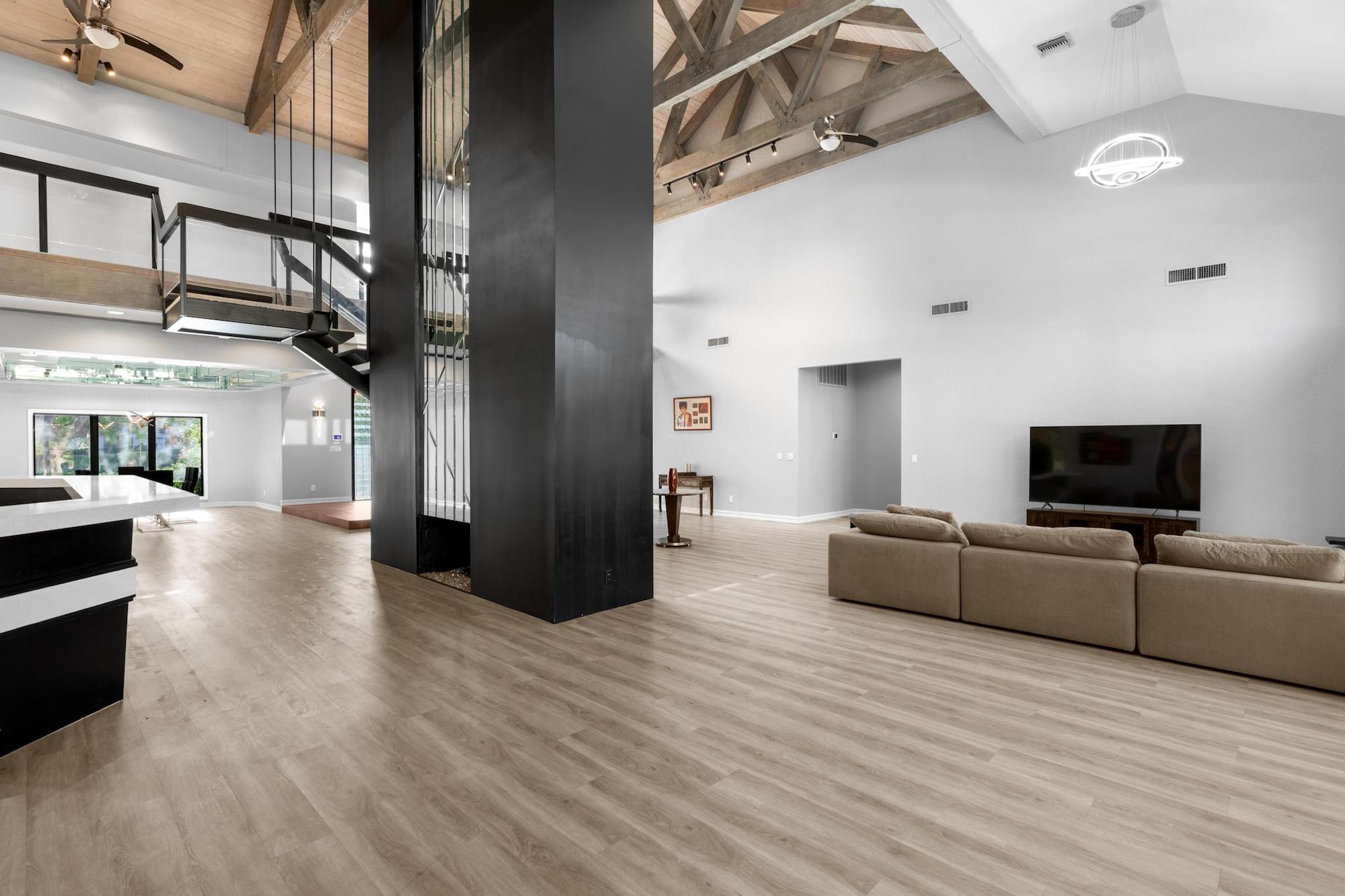 A raised front foyer opens to the dining area and great room. Soaring ceilings highlighted by wooden beams accent the expansive great room that features a floating staircase, fire feature and wet bar. Floor to ceiling windows give way to the shaded backyard veranda with a lounge and barbecue area, heated pool, hot tub, and water feature. The kitchen has a raised ceiling, custom built in cabinetry, large island, and a spacious breakfast nook off the kitchen that includes a wall of windows with views of the private backyard oasis. This one-of-a-kind home gives the perfect balance of gorgeous open spaces for entertaining and luxurious, private retreats.