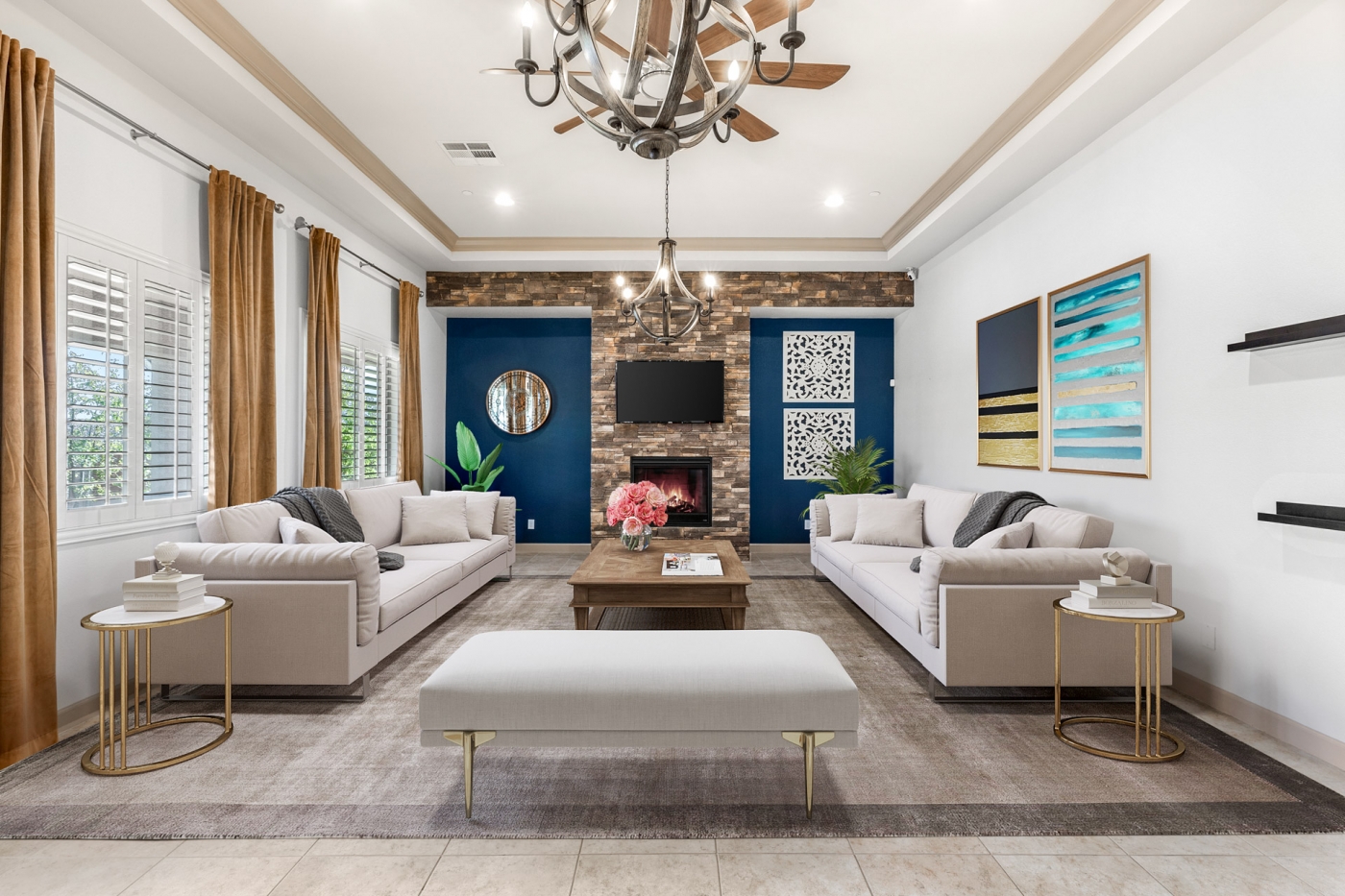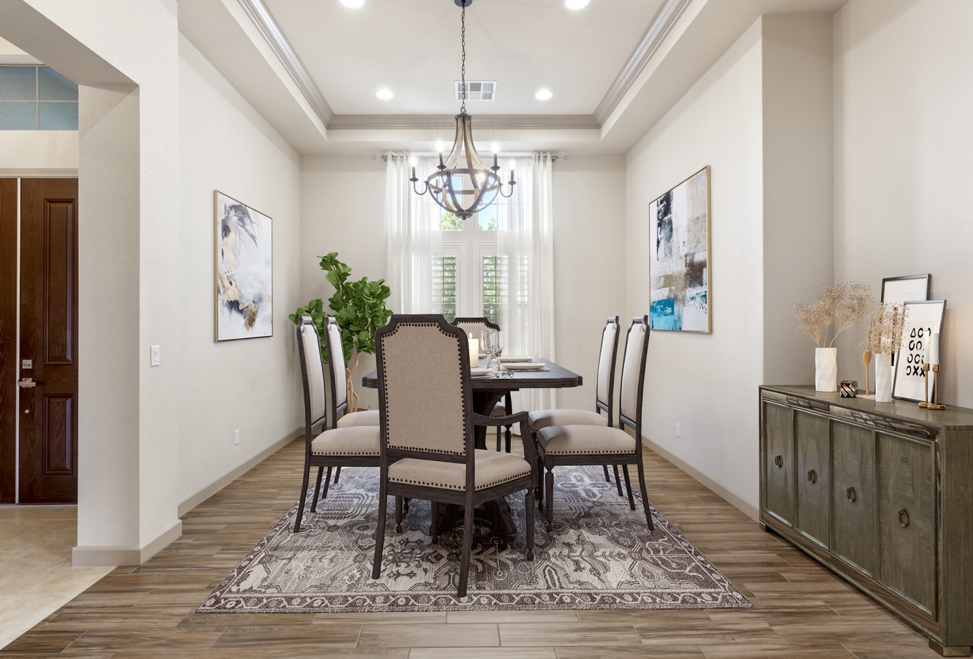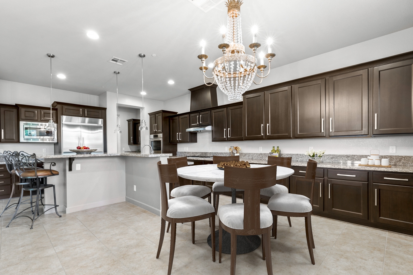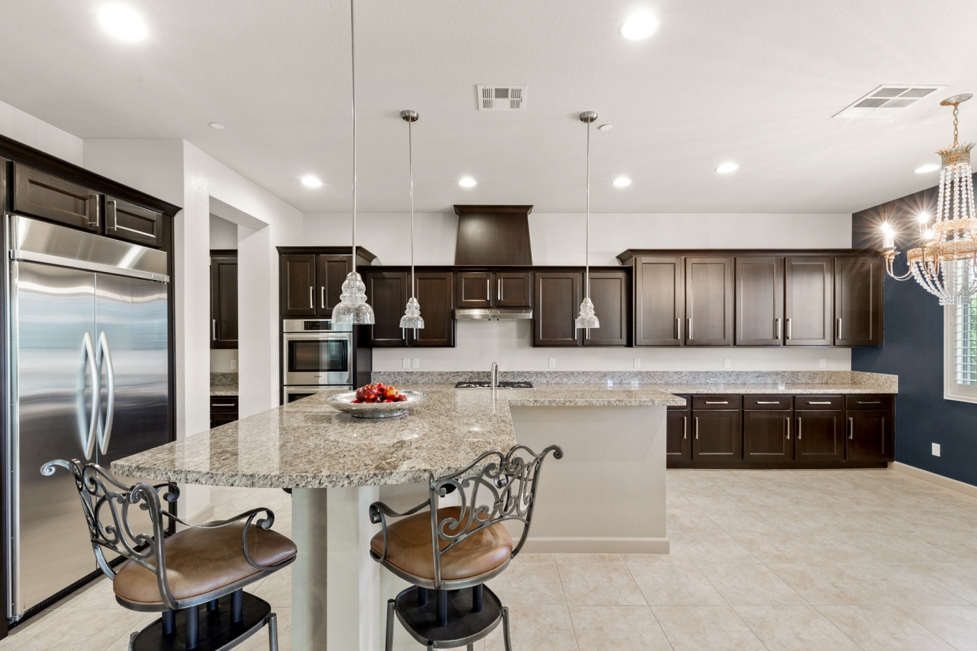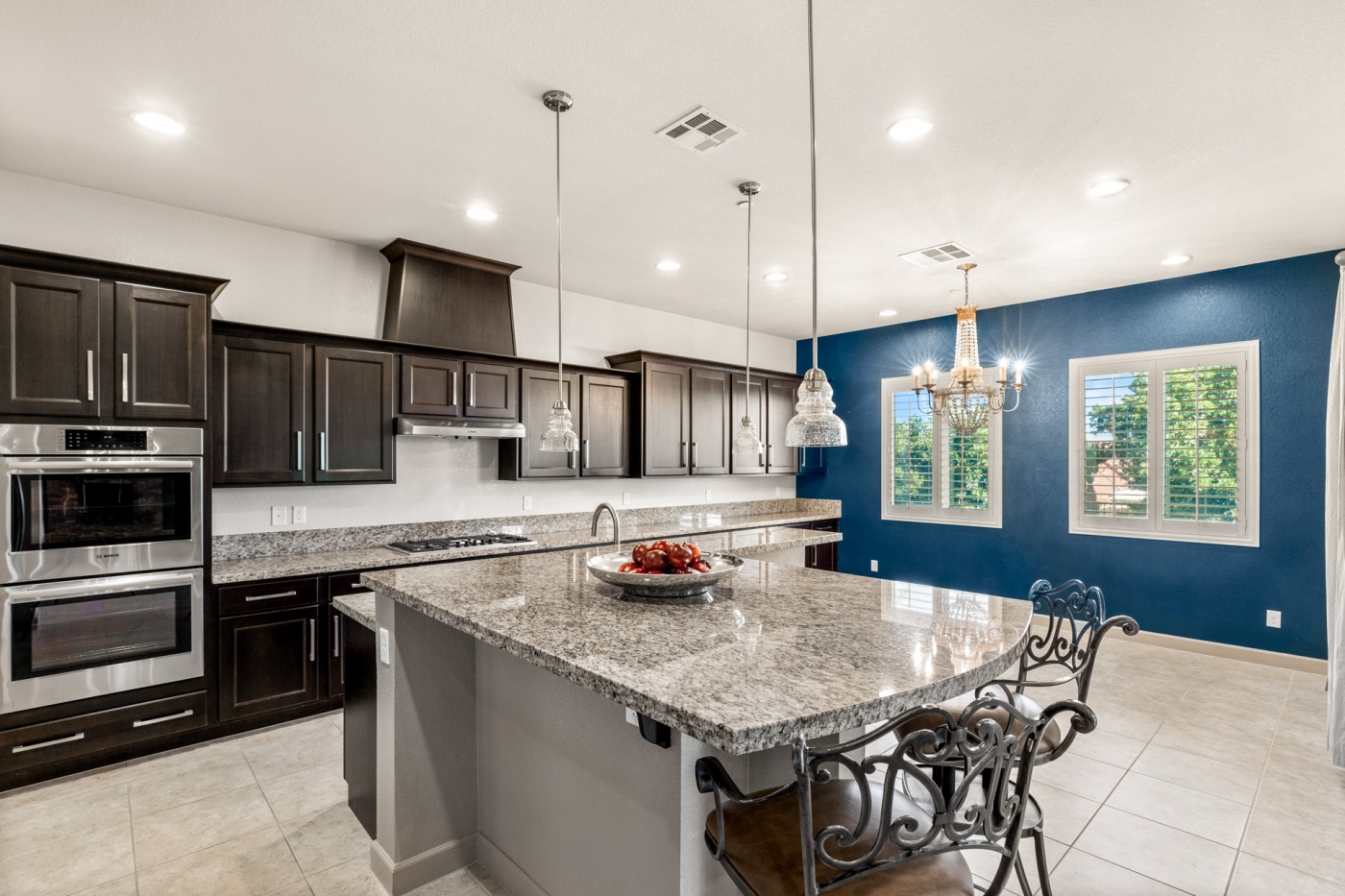 With four bedrooms, four baths, and a separate office, the home has a total of 4,252 square feet. The decor is primarily neutral, but with accent walls in deep hues to add distinctive contrast to fresh white walls. The kitchen opens directly off a great room with a stone fireplace and features distinctive dark wood cabinetry with granite counters. A cozy dining nook with a backyard view is highlighted by a stunning chandelier. There is a center island with plenty of room for barstool seating and a huge walk-in pantry.