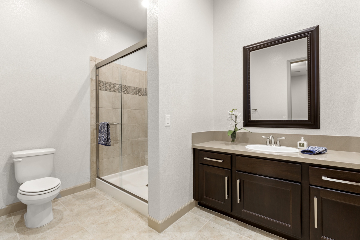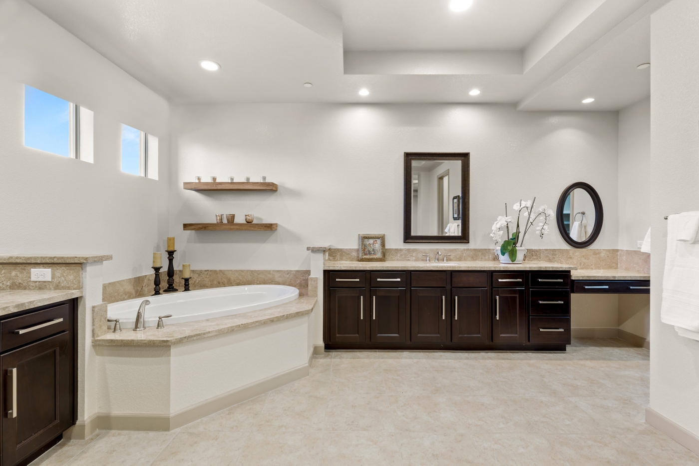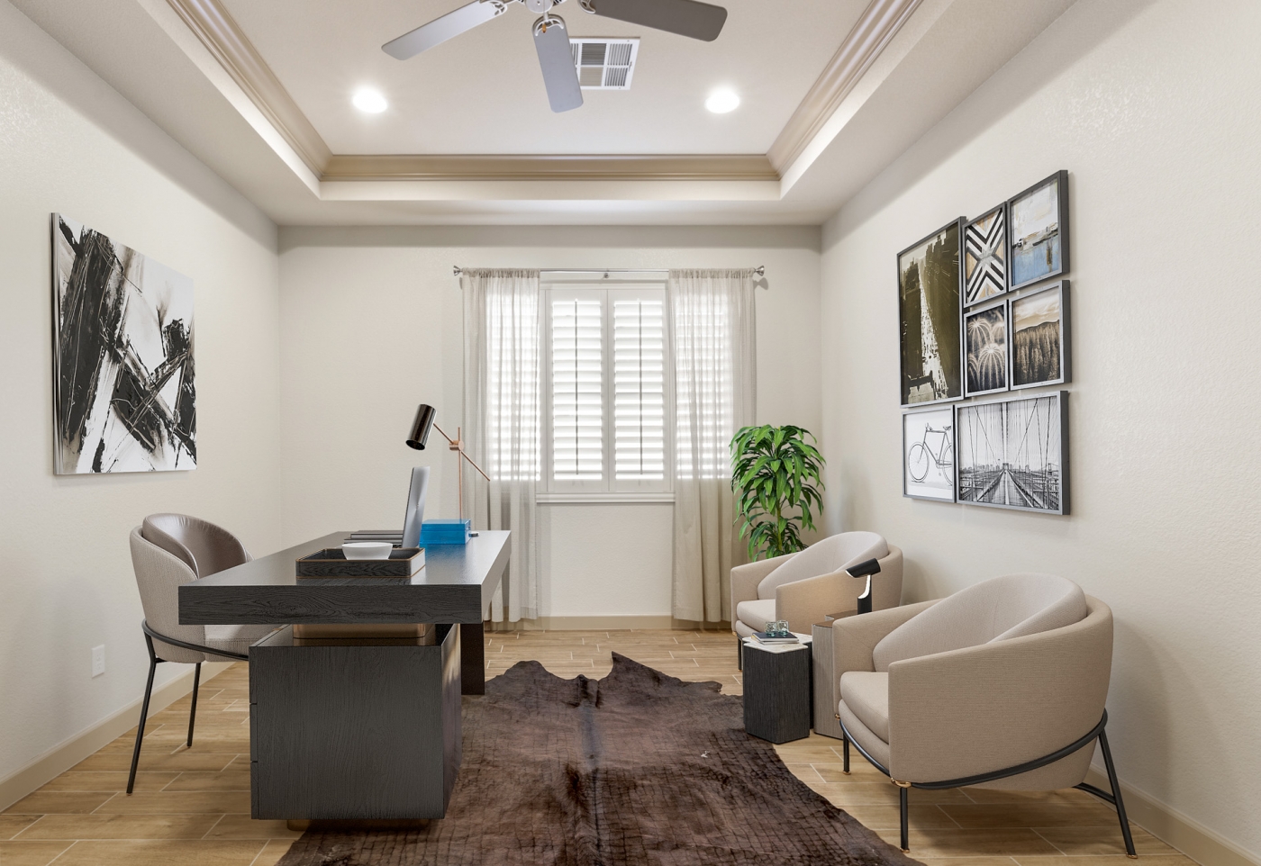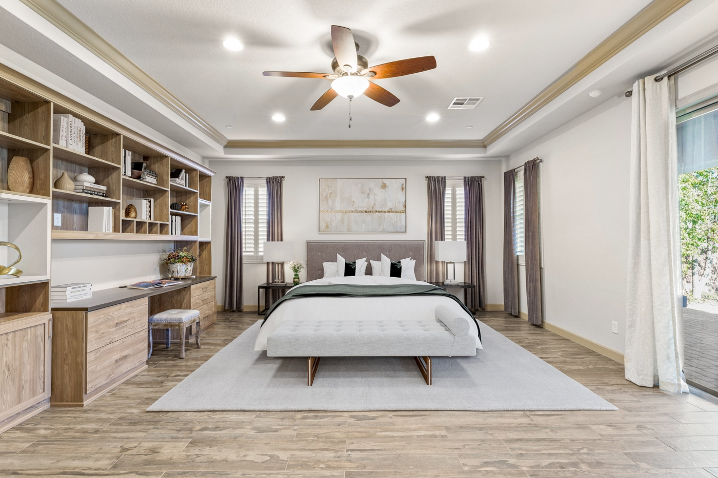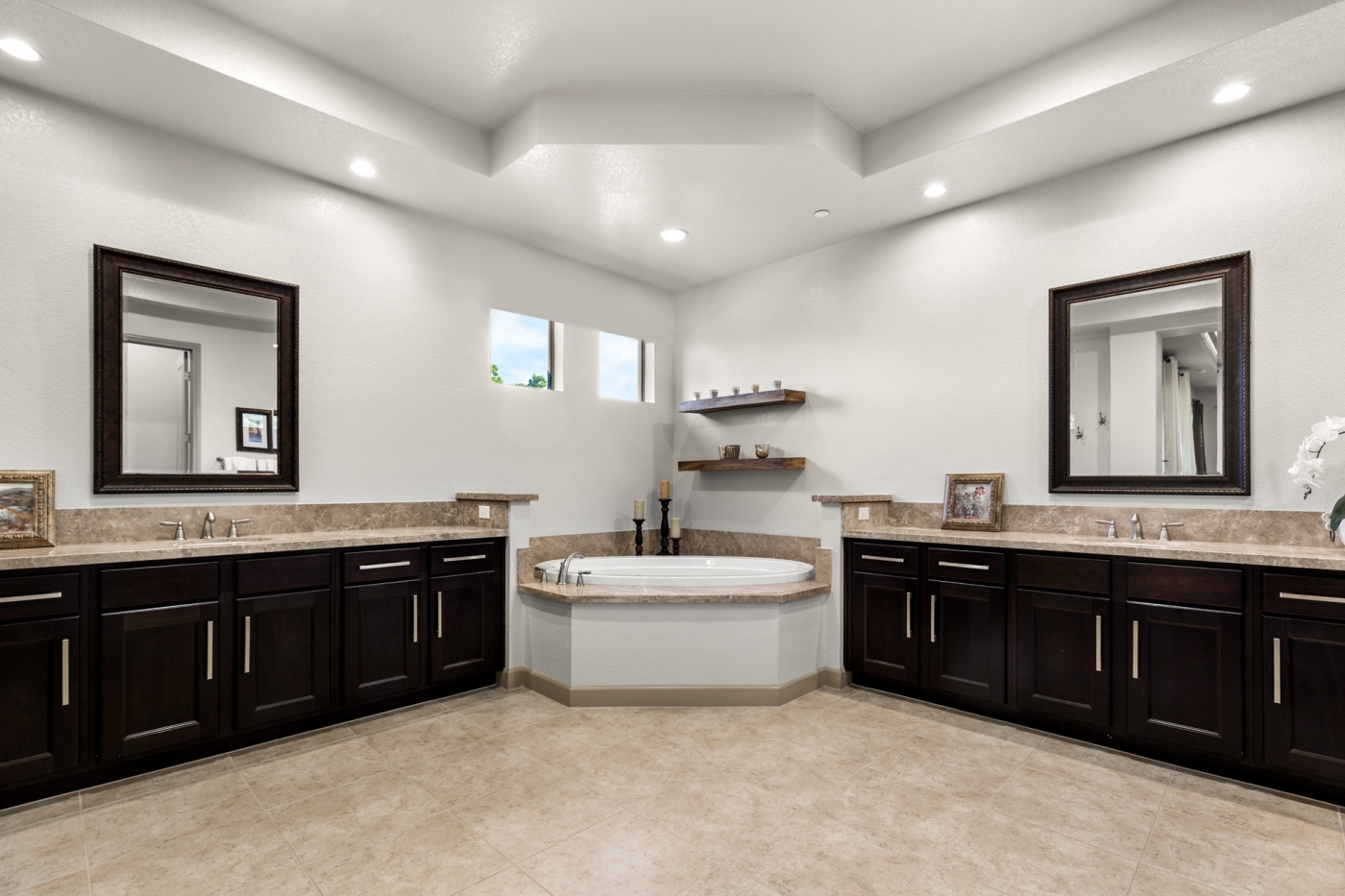 With four bedrooms, four baths, and a separate office, the home has a total of 4,252 square feet. The decor is primarily neutral, but with accent walls in deep hues to add distinctive contrast to fresh white walls. The kitchen opens directly off a great room with a stone fireplace and features distinctive dark wood cabinetry with granite counters. A cozy dining nook with a backyard view is highlighted by a stunning chandelier. There is a center island with plenty of room for barstool seating and a huge walk-in pantry.