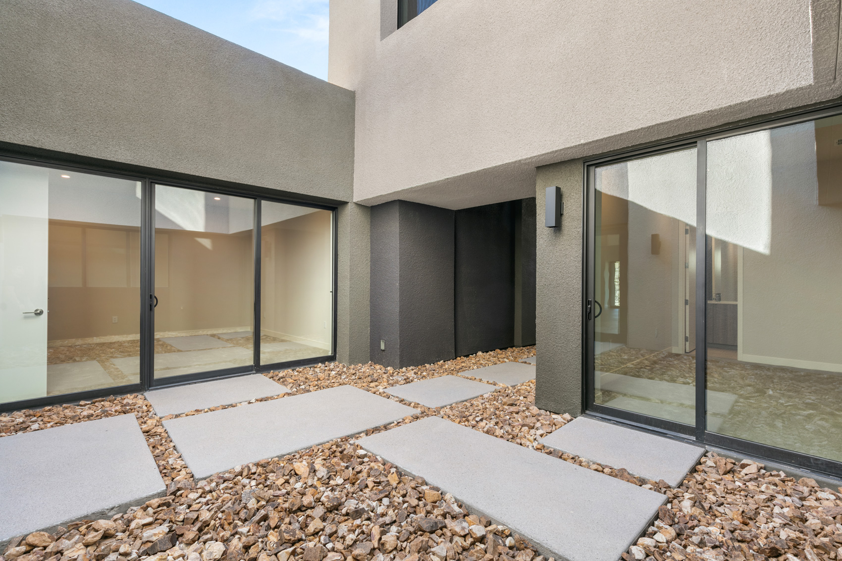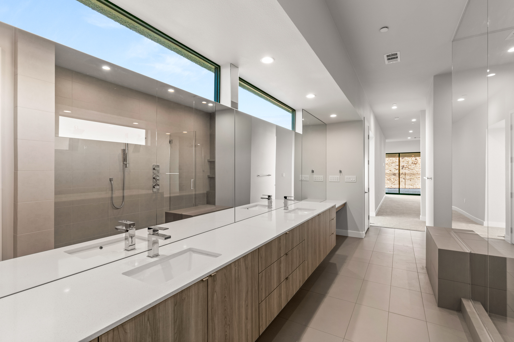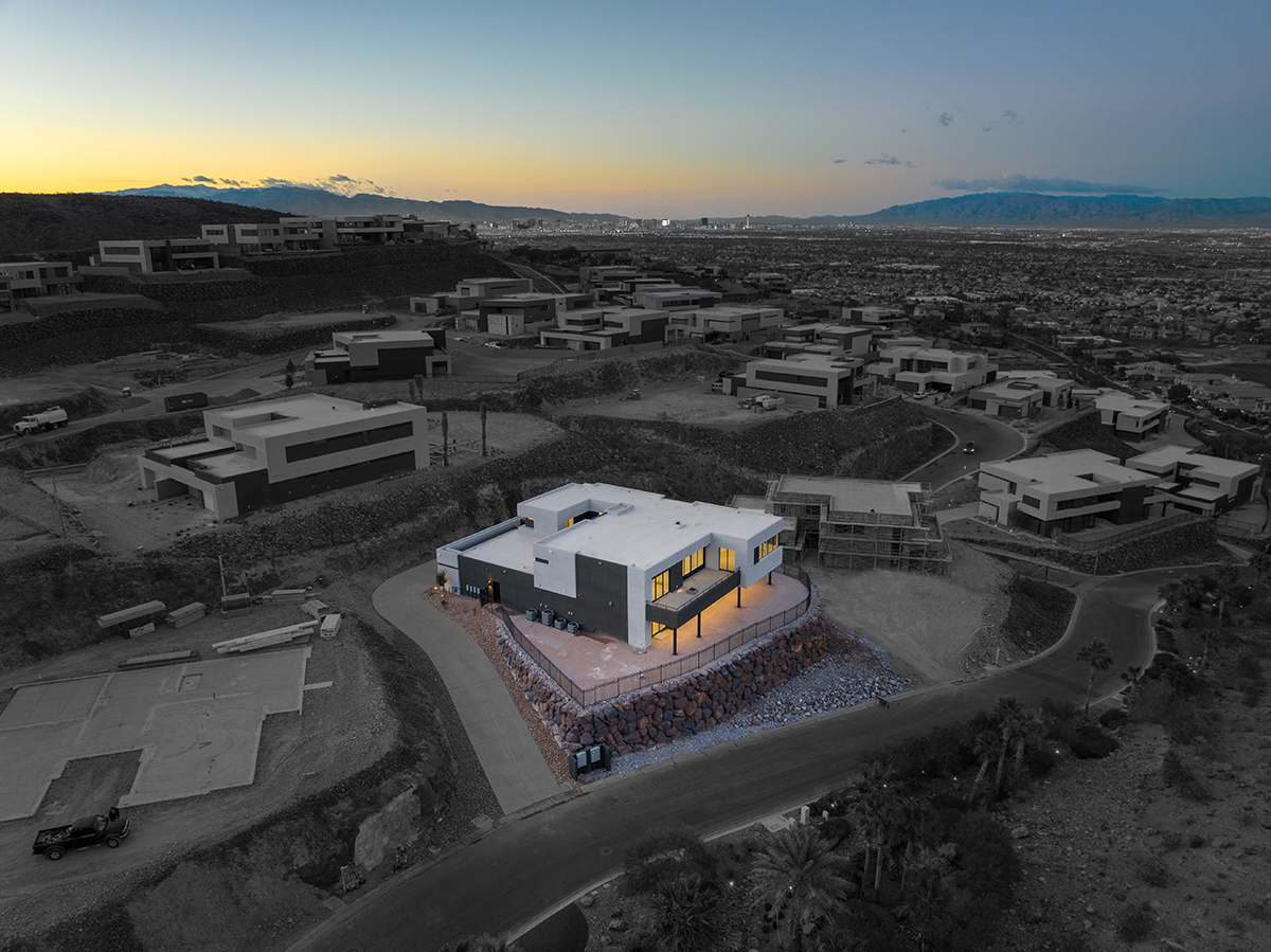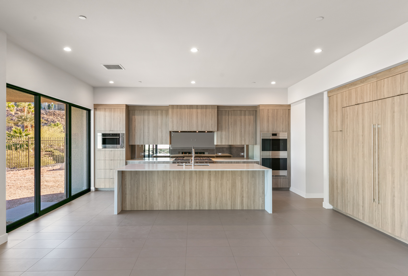 This is an award-winning Blue Heron Home that has been recently built in a desert contemporary style. It is high up on the mountainside and accessible through a private driveway that adds to the sense of privacy and spaciousness. The house offers a simple yet welcoming retreat on more than half an acre of land.