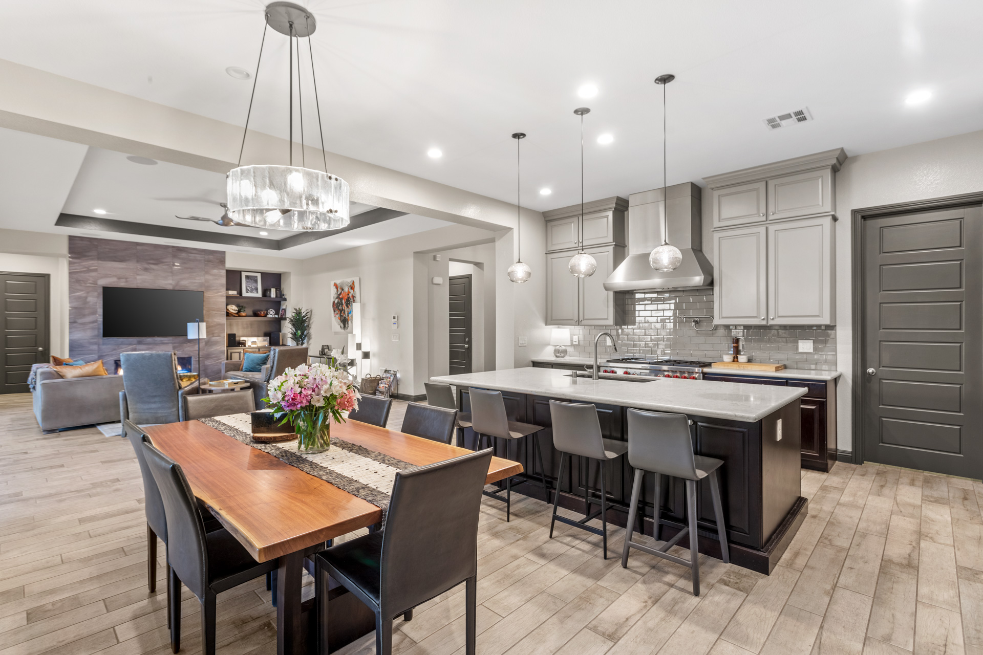 The exquisite floor plan is rich with elegant touches. A welcoming entry opens to a sensational foyer, multiple tray ceilings throughout, and an enormous great room with a fireplace. The kitchen is spectacular, with stainless steel appliances, an island, and a walk-in pantry. The timeless materials of stone, wood, tiles, and organic colors, give this kitchen a classic elegance and enduring grace.