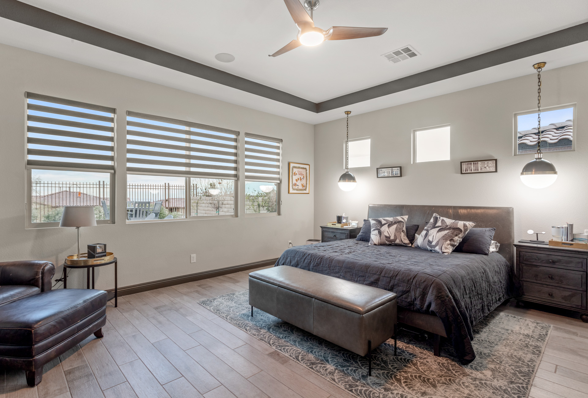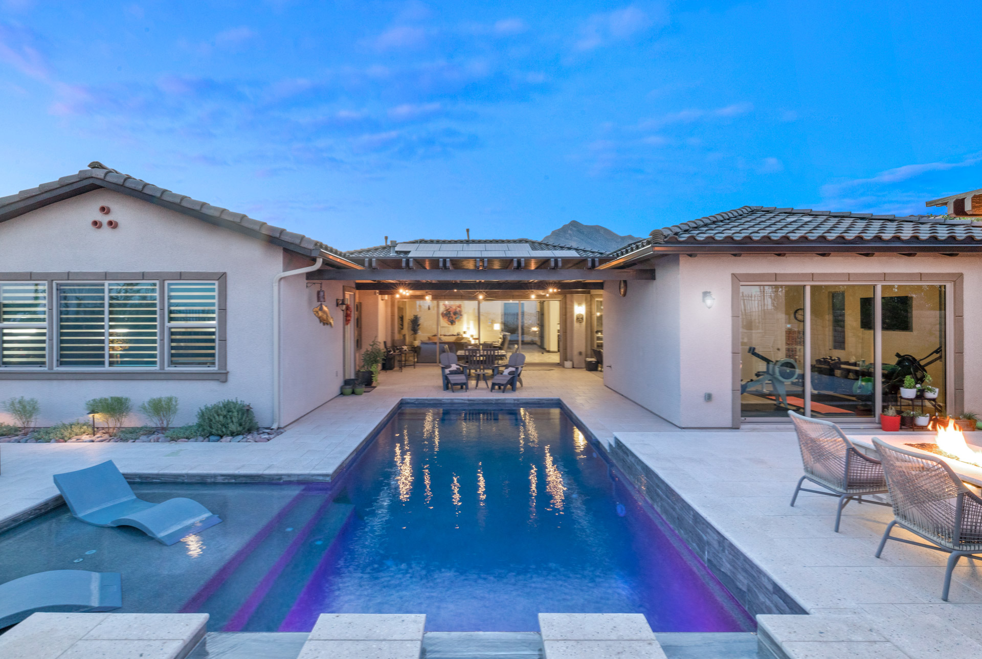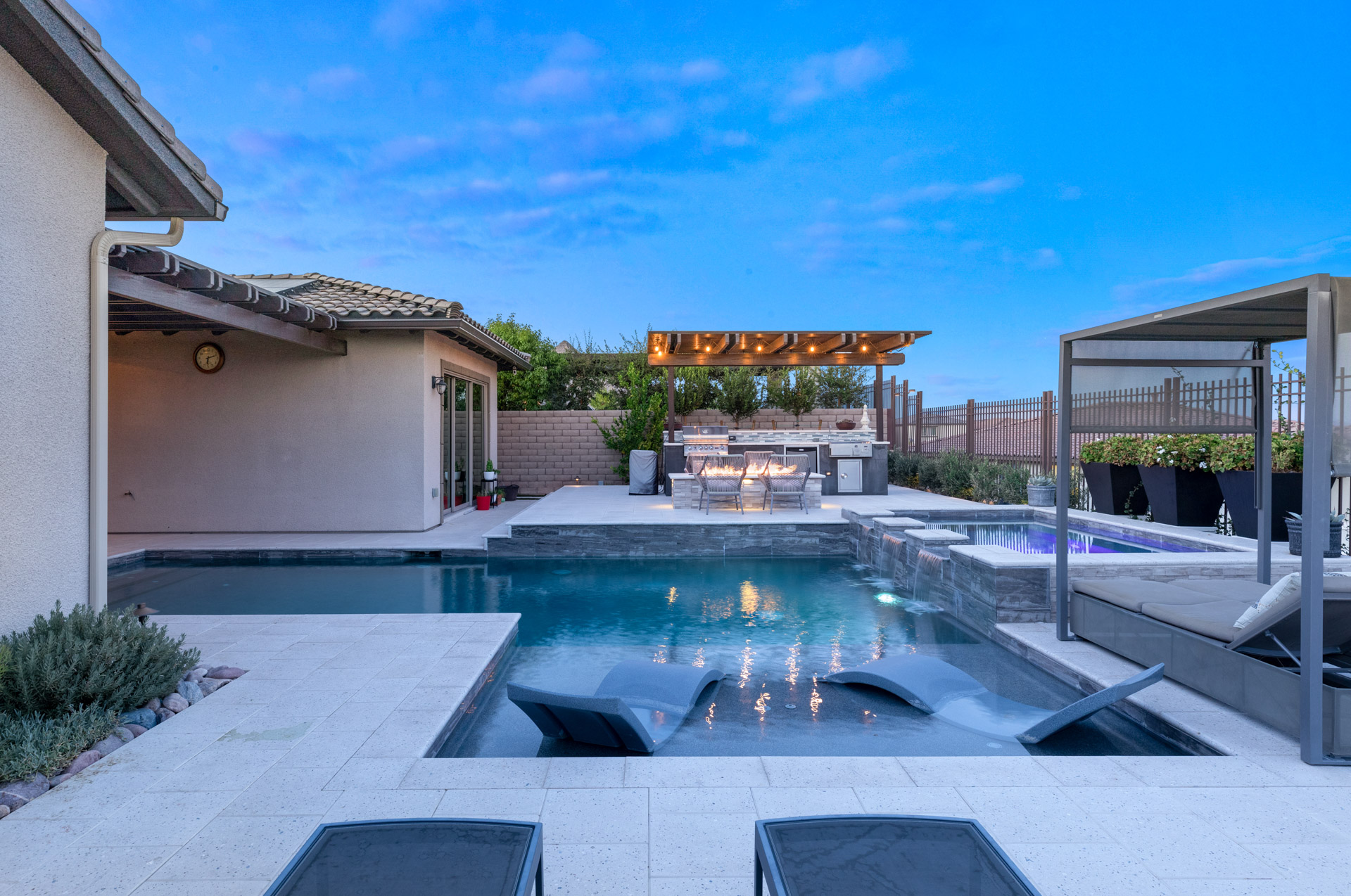 The exceptional master bathroom has a large custom shower with a drying area. Perfect for entertaining, the indoor/outdoor experience continues in your backyard. Here you can swim, relax on the tanning ledge in your pool, or soak in your hot tub. With your extended covered patio, you can even sit in the shade. Your elevated observation deck is another area in your backyard to enjoy. You can sit around your fire pit, create fantastic meals with your custom outdoor kitchen, and enjoy the beautiful views of the Las Vegas Strip. Ahh⦠heaven!