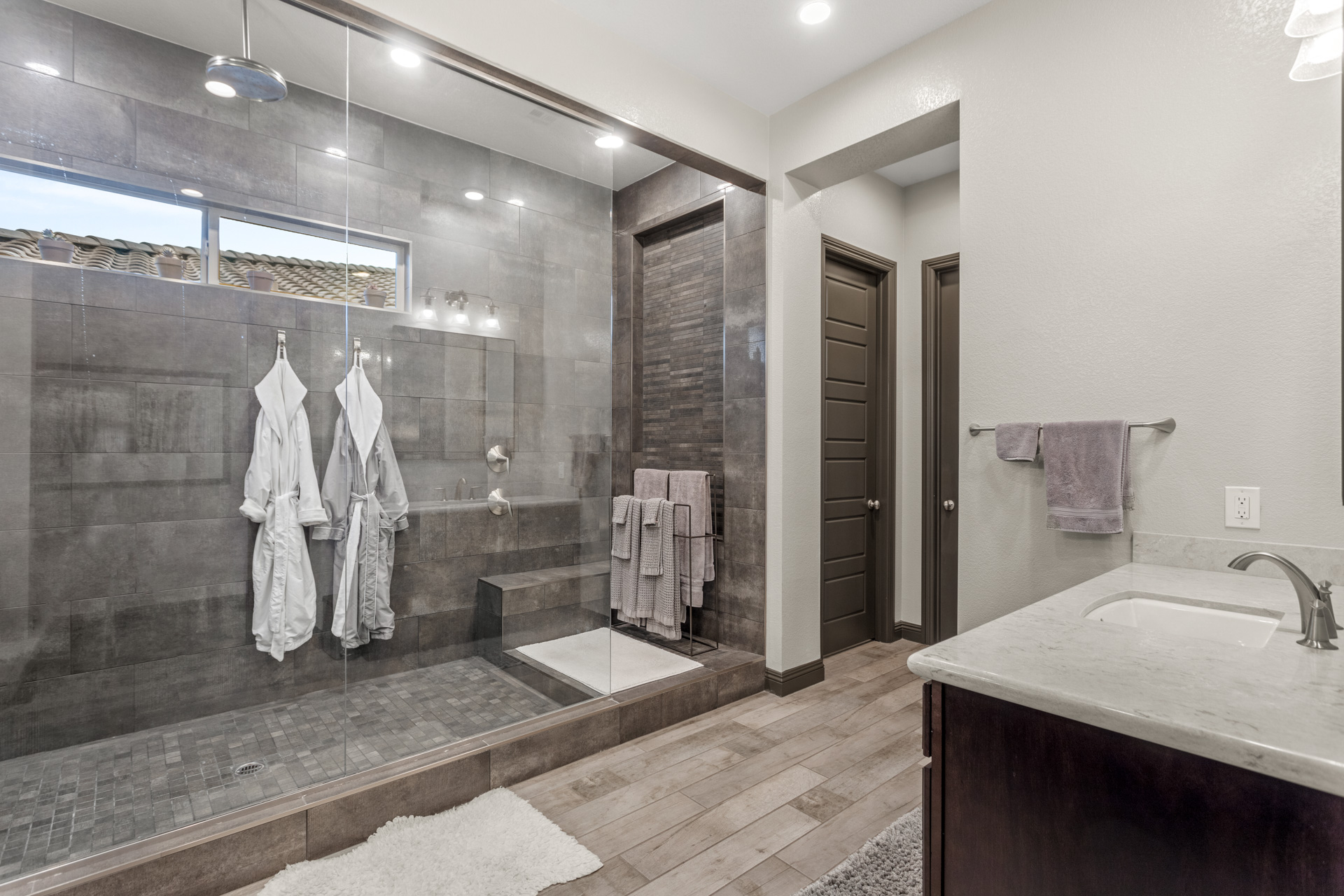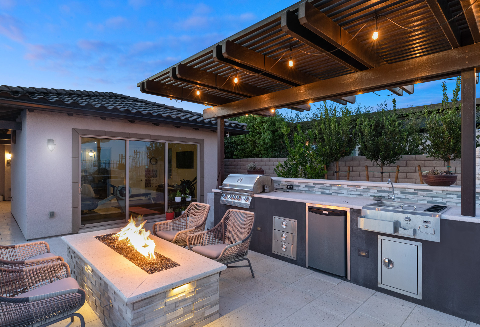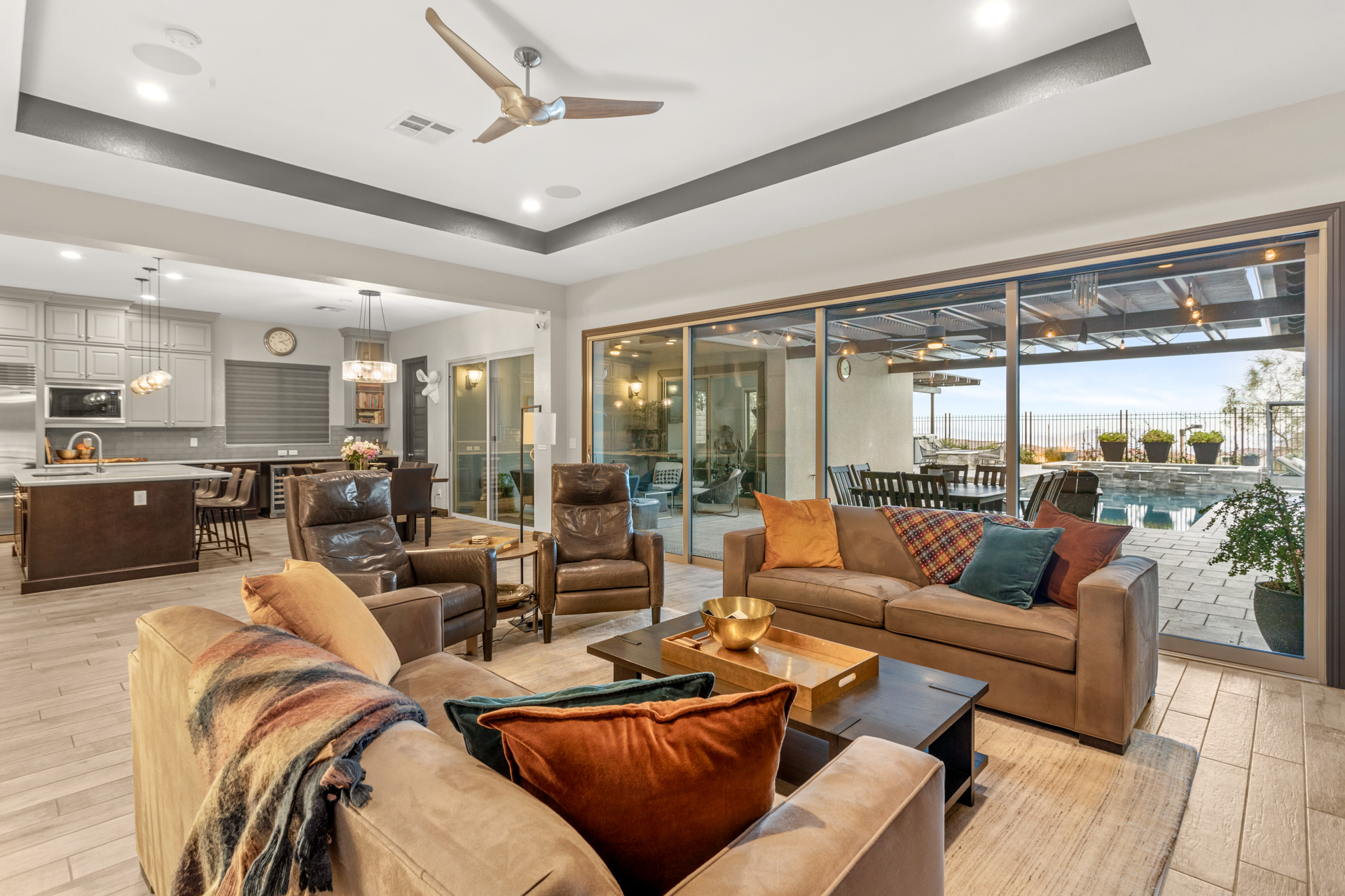 The exceptional master bathroom has a large custom shower with a drying area. Perfect for entertaining, the indoor/outdoor experience continues in your backyard. Here you can swim, relax on the tanning ledge in your pool, or soak in your hot tub. With your extended covered patio, you can even sit in the shade. Your elevated observation deck is another area in your backyard to enjoy. You can sit around your fire pit, create fantastic meals with your custom outdoor kitchen, and enjoy the beautiful views of the Las Vegas Strip. Ahh⦠heaven!