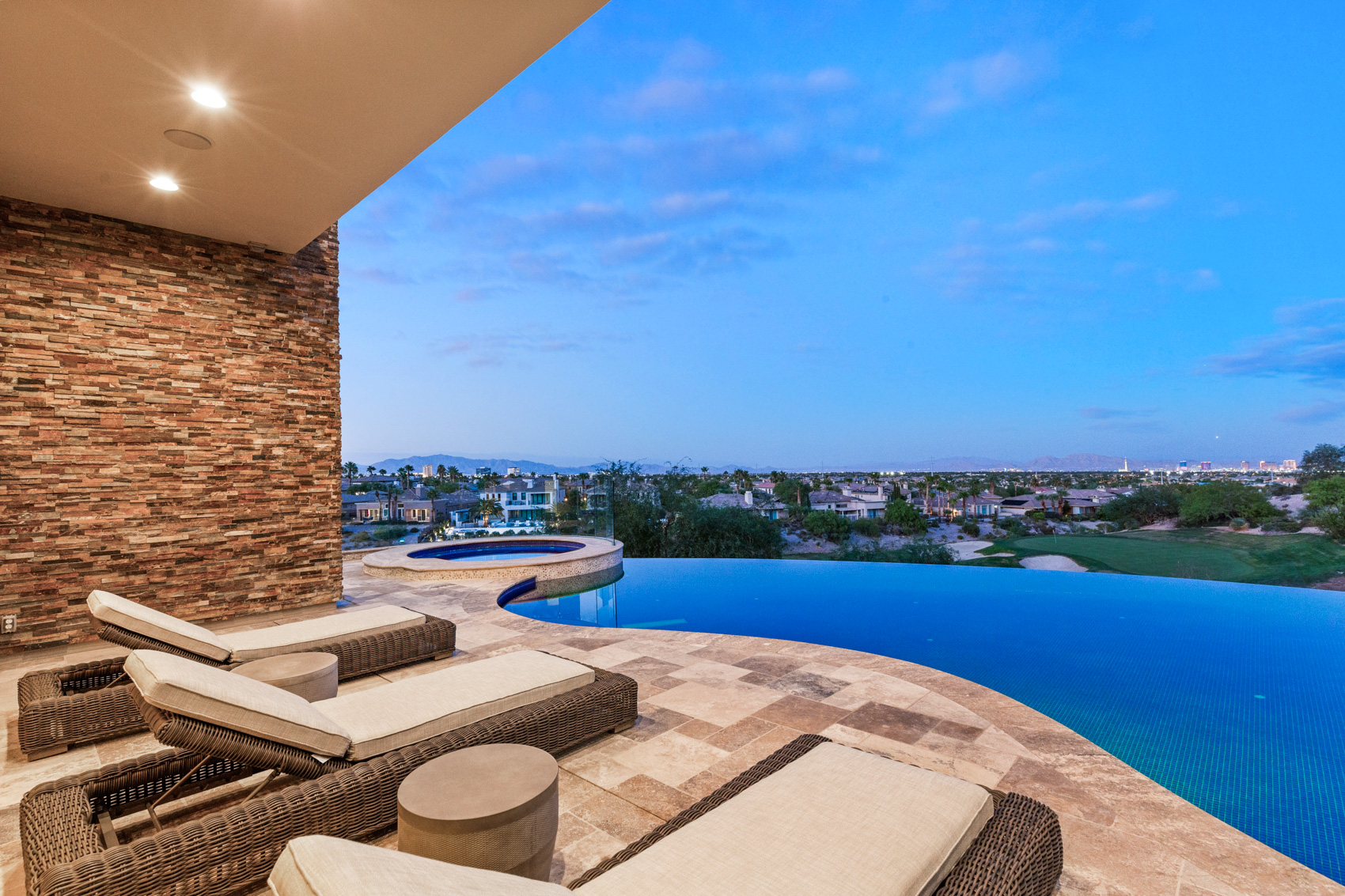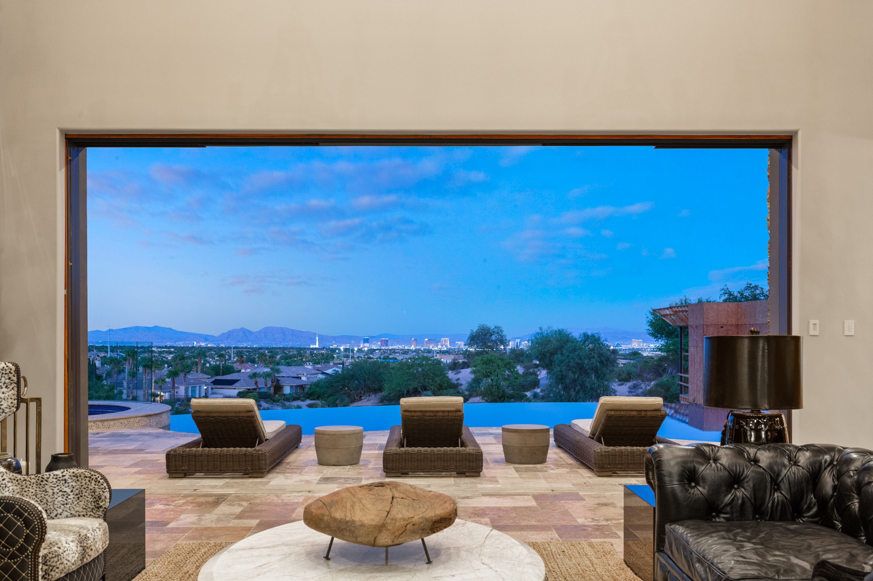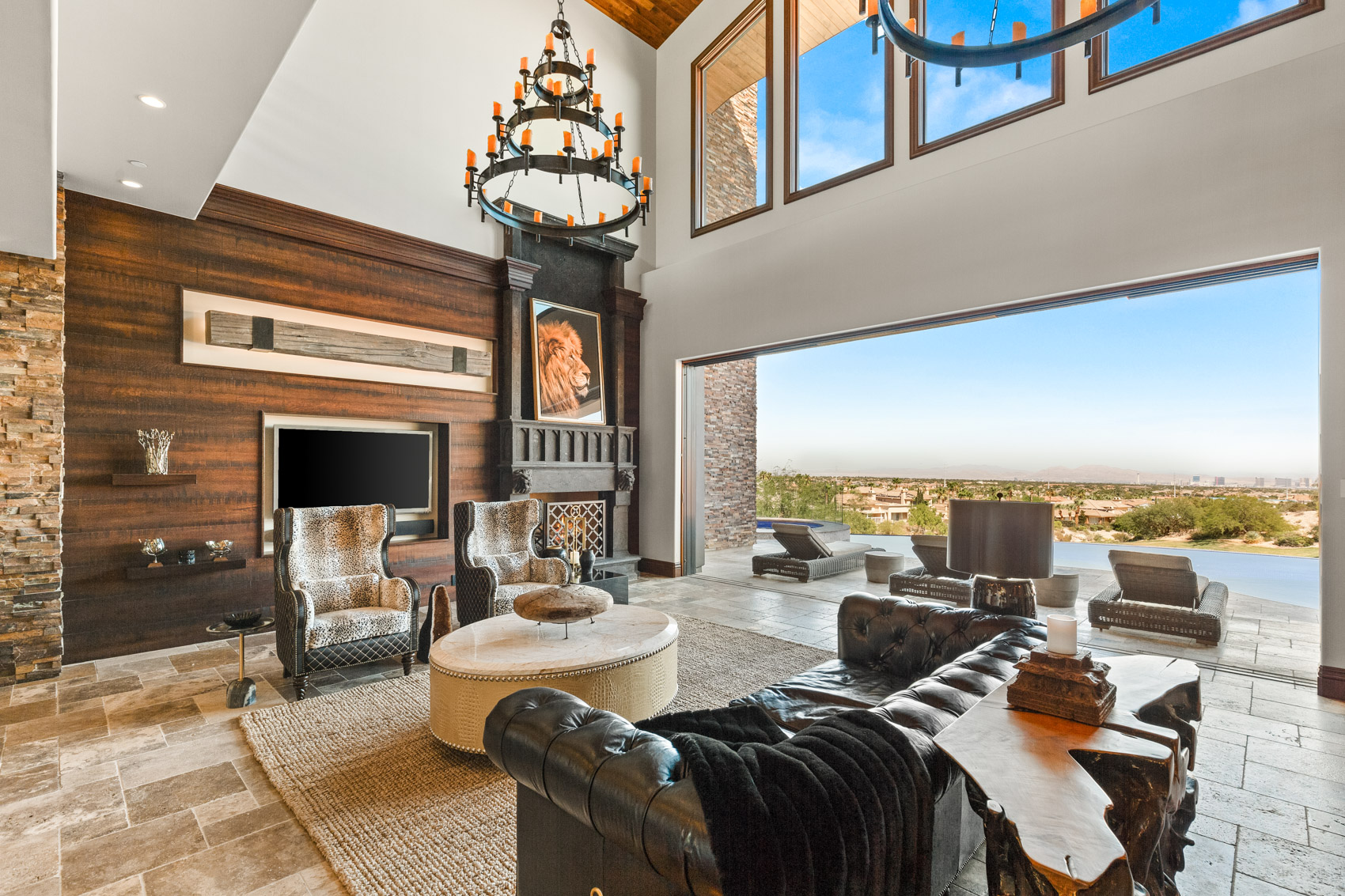Step inside to discover soaring vaulted ceilings that create an expansive atmosphere, while 20-foot pocketing glass sliders open to reveal breathtaking panoramic views of the Las Vegas Strip, mountains, and the nearby golf course. The integration of indoor and outdoor living is seamless, making this home ideal for both intimate gatherings and large-scale entertaining. The heart of the home is the chef's kitchen, a culinary haven equipped with top-of-the-line appliances, custom cabinetry, and a separate prep kitchen that caters to your every culinary need. Whether preparing a casual meal or hosting a grand feast, this kitchen is designed to impress. The living spaces are further defined by rustic finishes that add warmth to the contemporary design, creating an inviting ambiance throughout. Entertainment takes center stage in this estate, with a soundproof movie theater that can easily be converted into a professional recording studio. The theater is tied into a soundproofed basement that features a performance stage and a lounge area complete with a full bar. A hidden room accessible through the bar adds an element of intrigue and offers endless possibilities for customization. The outdoor spaces are equally extraordinary, offering a variety of areas designed for relaxation and entertainment. The infinity pool, with solar heating, seems to merge with the horizon, providing a serene retreat with spectacular views. The lower patio is equipped with a built-in evaporative cooler, ensuring comfort even during the hottest months. Multiple outdoor fire pits and a granite-clad outdoor kitchen make alfresco living an everyday luxury. Various separate outdoor entertaining spaces provide flexibility for gatherings of all sizes, allowing you to host anything from a casual barbecue to an elegant soirƩe. The estate is equipped with modern conveniences that enhance its appeal, including an elevator that ensures easy access to all three levels, an IQAir filtration system that maintains the highest air quality throughout the home, and an AMX home automation system that puts control of lighting, climate, security, and entertainment at your fingertips. The primary suite serves as a private sanctuary, with expansive windows that offer uninterrupted views of the surrounding landscape. The en-suite bathroom is a spa-like retreat, featuring a soaking tub with butted glass windows that allow you to relax while taking in the breathtaking scenery. Multiple balconies throughout the home ensure that these views are never far from sight, allowing you to enjoy the beauty of the outdoors from virtually every room. Nestled on approximately 2/3 of an acre, 64 Promontory Ridge Drive represents a rare opportunity to own a piece of Las Vegas luxury in The Ridges' most exclusive neighborhood. Homes of this caliber, with such a unique blend of design, technology, and location, seldom come to market. Here, you are not just purchasing a home; you are investing in an extraordinary living experience, where every day feels like a retreat into sophistication and serenity. This estate is more than just a residence; it is a statement of luxury, a sanctuary of comfort, and a stage for unforgettable moments. Discover the ultimate in contemporary living at 64 Promontory Ridge Drive, where your dream home awaits.