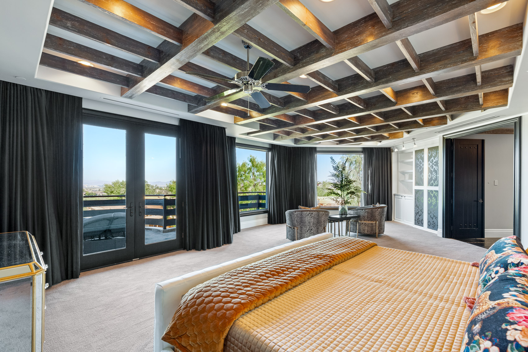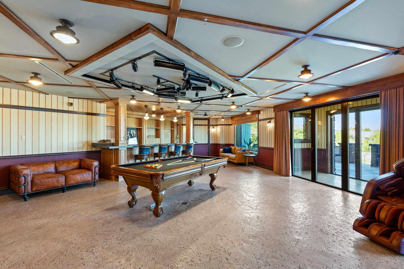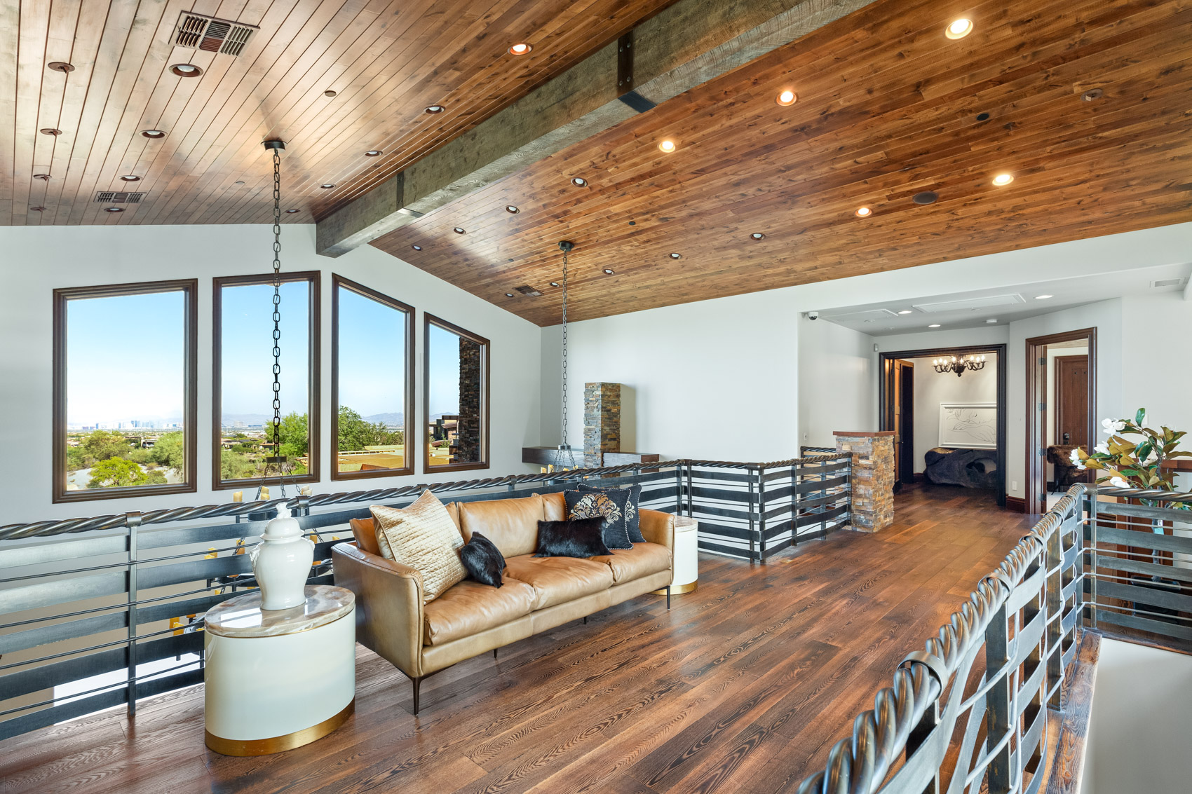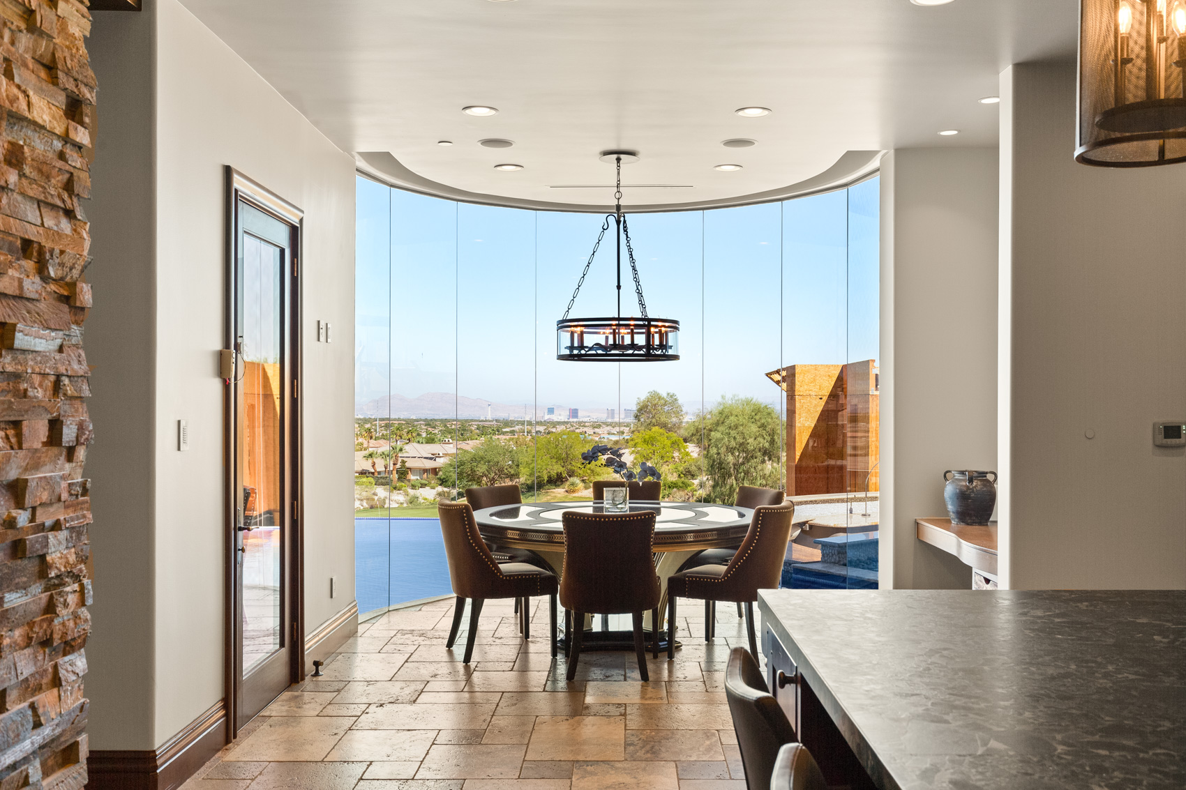 Step inside to discover soaring vaulted ceilings that create an expansive atmosphere, while 20-foot pocketing glass sliders open to reveal breathtaking panoramic views of the Las Vegas Strip, mountains, and the nearby golf course. The integration of indoor and outdoor living is seamless, making this home ideal for both intimate gatherings and large-scale entertaining. The heart of the home is the chef's kitchen, a culinary haven equipped with top-of-the-line appliances, custom cabinetry, and a separate prep kitchen that caters to your every culinary need. Whether preparing a casual meal or hosting a grand feast, this kitchen is designed to impress. The living spaces are further defined by rustic finishes that add warmth to the contemporary design, creating an inviting ambiance throughout. Entertainment takes center stage in this estate, with a soundproof movie theater that can easily be converted into a professional recording studio. The theater is tied into a soundproofed basement that features a performance stage and a lounge area complete with a full bar. A hidden room accessible through the bar adds an element of intrigue and offers endless possibilities for customization. The outdoor spaces are equally extraordinary, offering a variety of areas designed for relaxation and entertainment. The infinity pool, with solar heating, seems to merge with the horizon, providing a serene retreat with spectacular views. The lower patio is equipped with a built-in evaporative cooler, ensuring comfort even during the hottest months. Multiple outdoor fire pits and a granite-clad outdoor kitchen make alfresco living an everyday luxury. Various separate outdoor entertaining spaces provide flexibility for gatherings of all sizes, allowing you to host anything from a casual barbecue to an elegant soirƩe. The estate is equipped with modern conveniences that enhance its appeal, including an elevator that ensures easy access to all three levels, an IQAir filtration system that maintains the highest air quality throughout the home, and an AMX home automation system that puts control of lighting, climate, security, and entertainment at your fingertips. The primary suite serves as a private sanctuary, with expansive windows that offer uninterrupted views of the surrounding landscape. The en-suite bathroom is a spa-like retreat, featuring a soaking tub with butted glass windows that allow you to relax while taking in the breathtaking scenery. Multiple balconies throughout the home ensure that these views are never far from sight, allowing you to enjoy the beauty of the outdoors from virtually every room. Nestled on approximately 2/3 of an acre, 64 Promontory Ridge Drive represents a rare opportunity to own a piece of Las Vegas luxury in The Ridges' most exclusive neighborhood. Homes of this caliber, with such a unique blend of design, technology, and location, seldom come to market. Here, you are not just purchasing a home; you are investing in an extraordinary living experience, where every day feels like a retreat into sophistication and serenity. This estate is more than just a residence; it is a statement of luxury, a sanctuary of comfort, and a stage for unforgettable moments. Discover the ultimate in contemporary living at 64 Promontory Ridge Drive, where your dream home awaits.