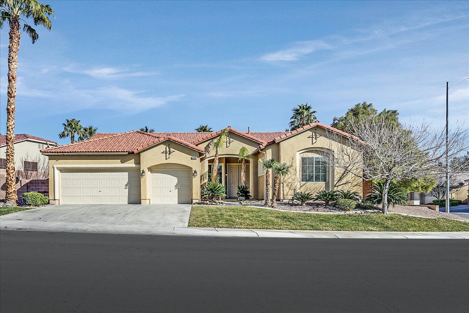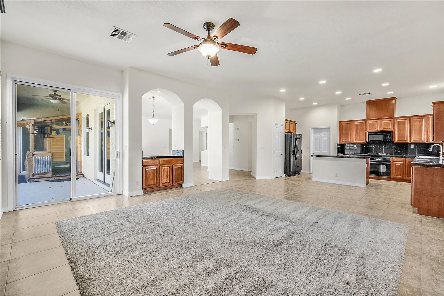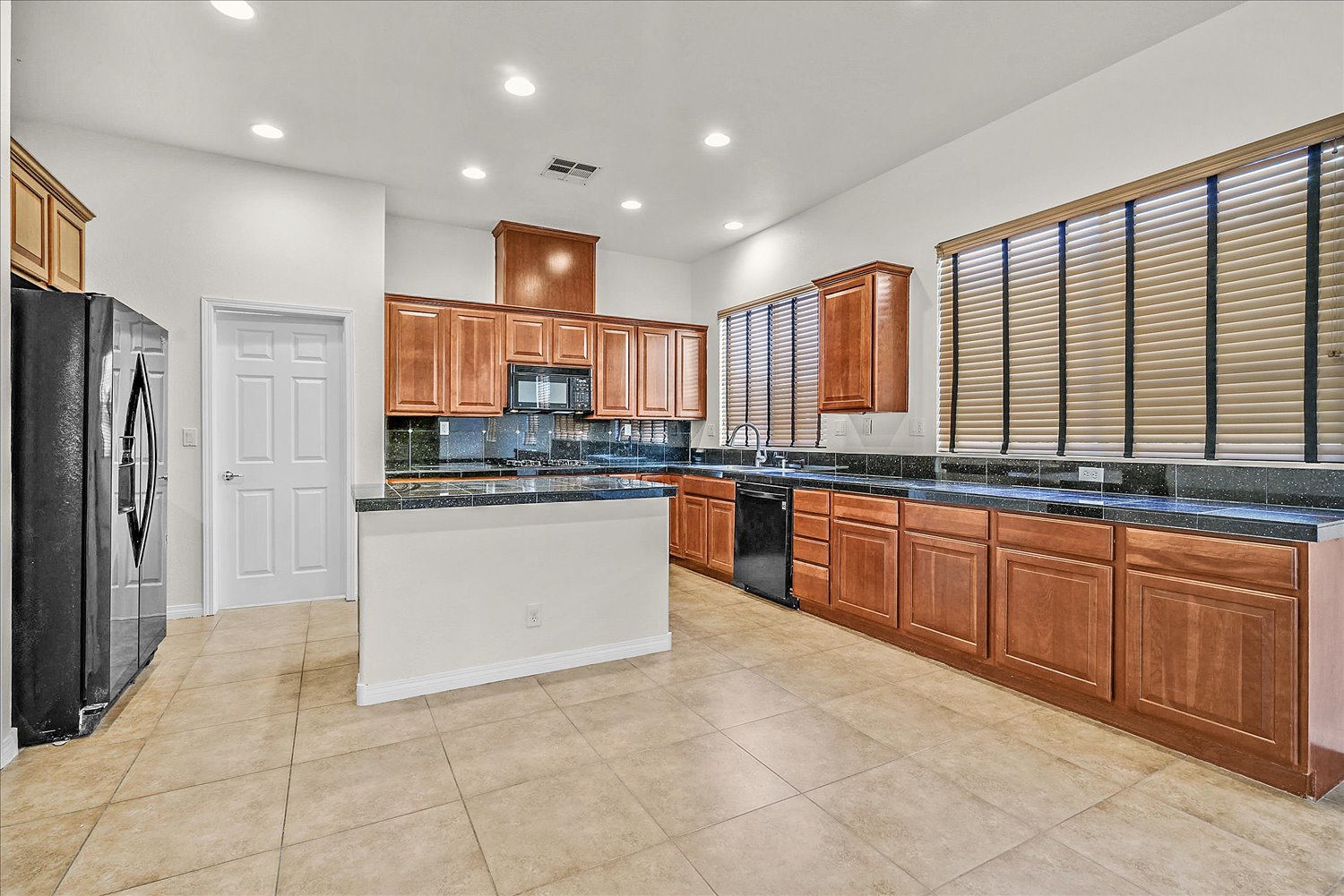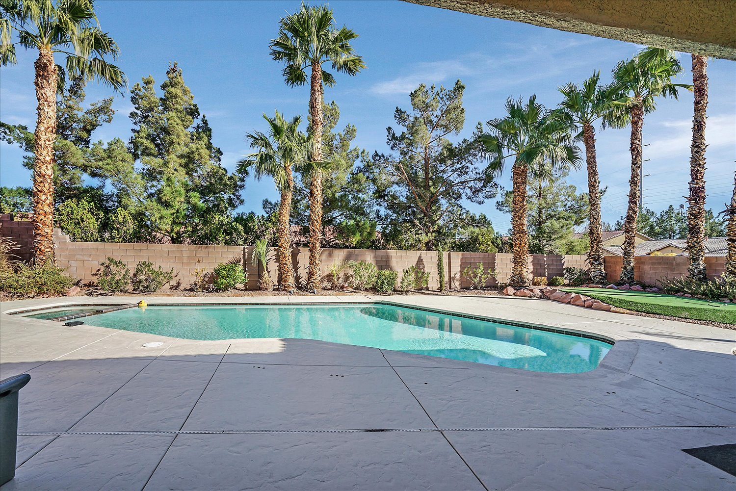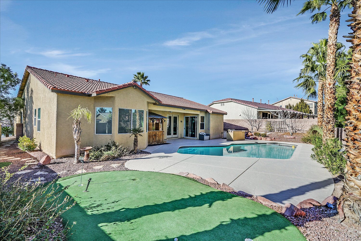 A large kitchen with an island and black appliances. Epoxy flooring in the 3 car garage. Beautiful backyard with a putting green and sparkling pool.