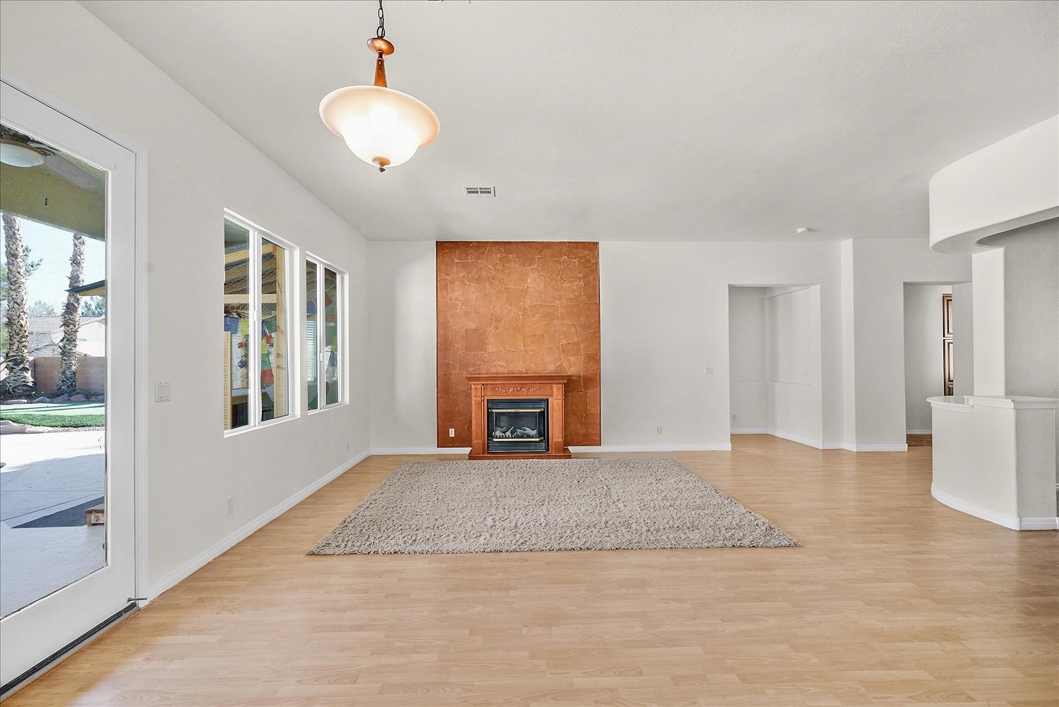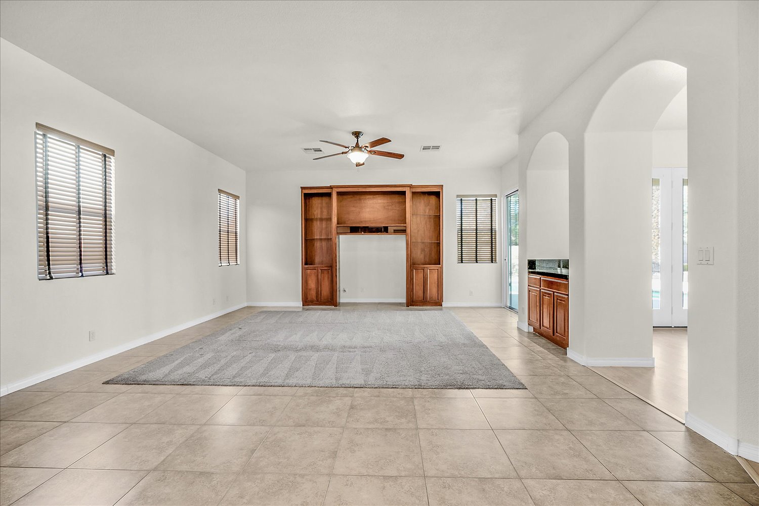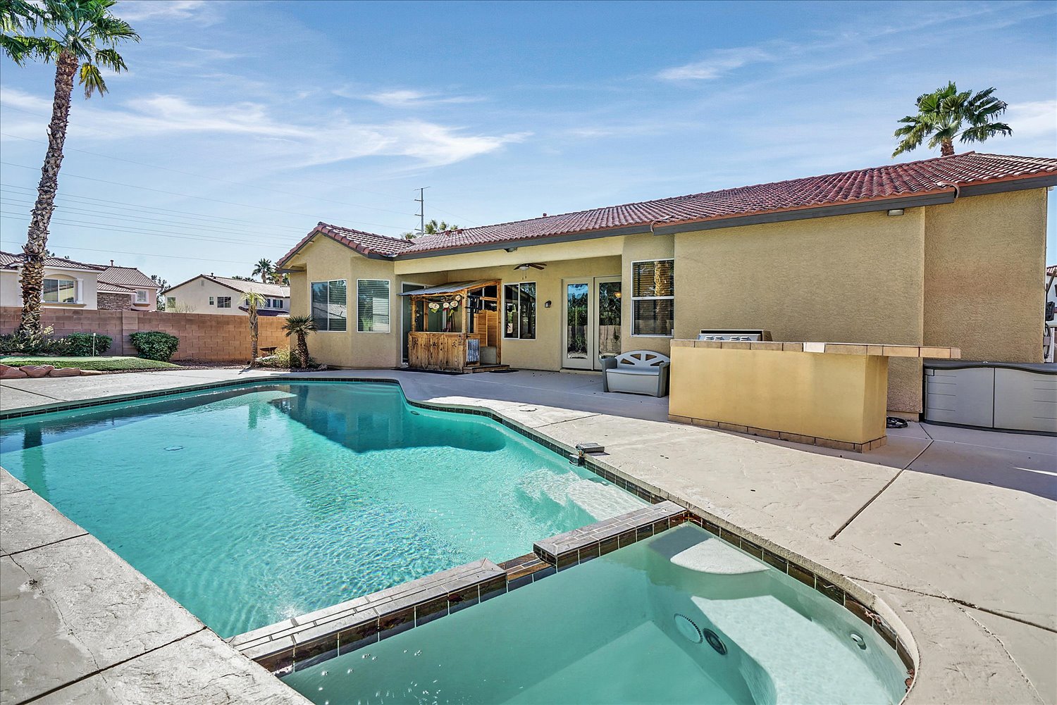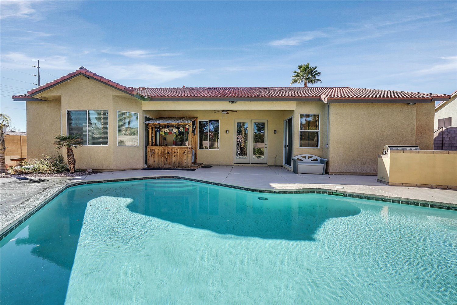 Pristine single story home on the corner lot with a pool/spa. The home features open floor plan with a fire place, 3 bedrooms, 3 bathrooms, and a den. Den has a built in book cases with a desk.