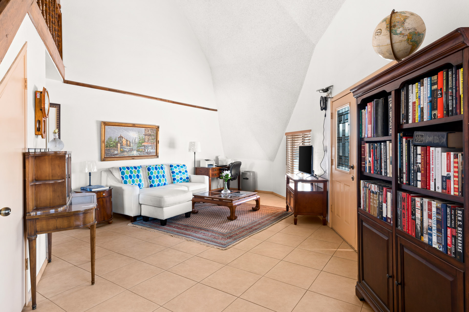 The energy efficient geodesic dome home is a well-preserved time capsule with 2 bedrooms, 2 bathrooms, a living room, den, kitchen, and laundry room.