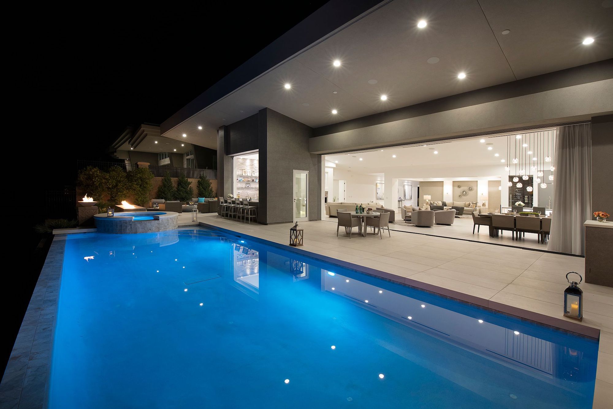 Rich & modern materials throughout with a bright and open floor plan offering a large pocketing door that opens up to the backyard w/infinity-edge pool, built-in BBQ, fire pots & lounge area. The great room creates the ideal entertainment area w/seamless transition from the media/game room to the dining & Indoor/outdoor bar.
