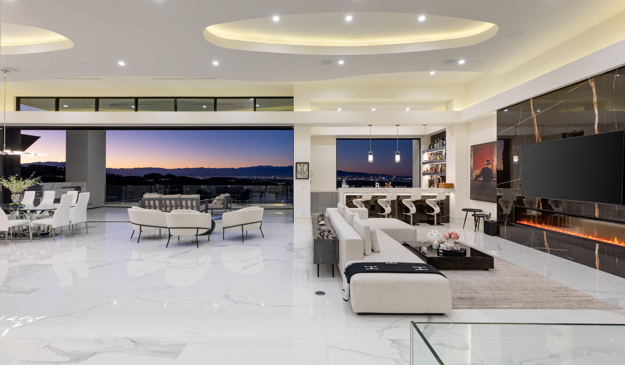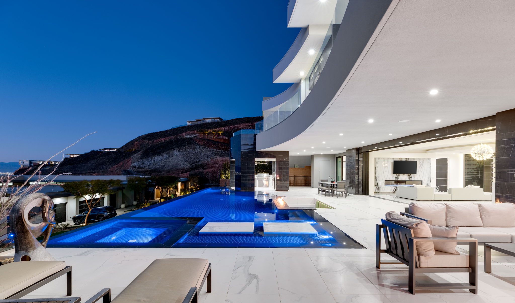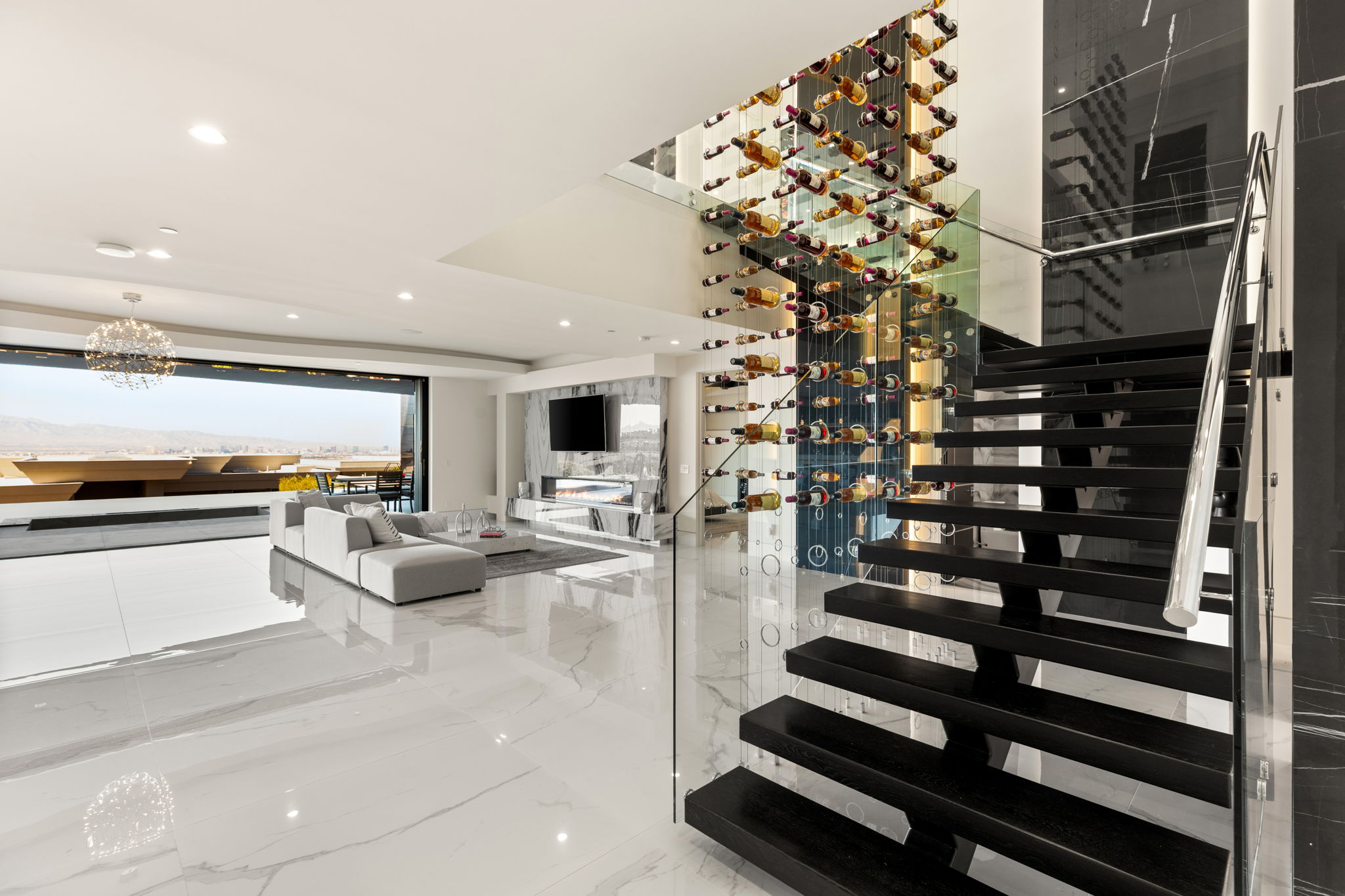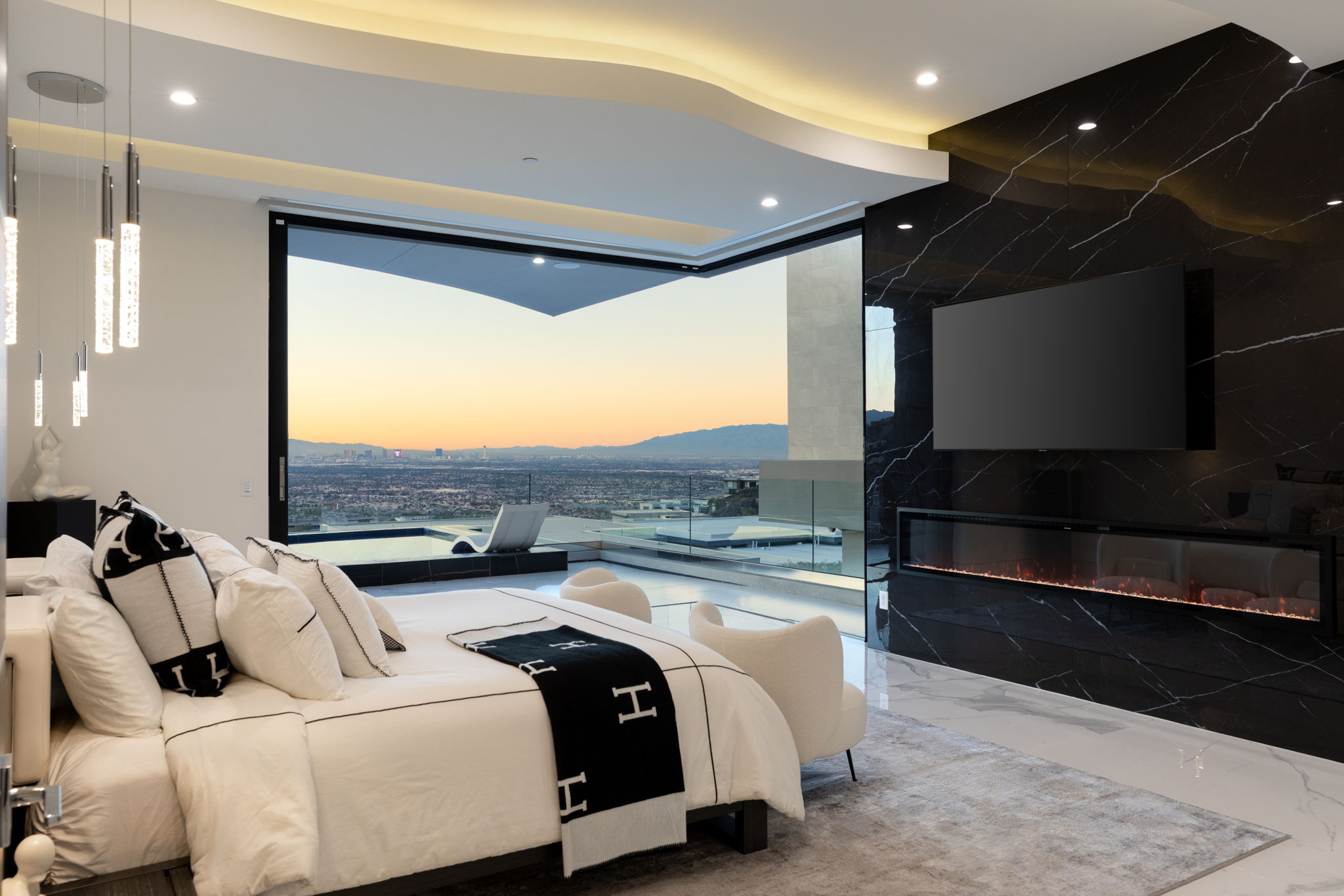 Stacking pocket doors vanish to reveal expansive covered outdoor living: mosaic-tiled infinity-edge pool/spa, sunken conversation lounge, outdoor kitchen w/ pizza oven, firelit seating, and cascading waterfalls. Glass-enclosed office w/ private entry. Main-level primary retreat captures sweeping city/Strip views and opens to a private spa terrace; dual walk-in closets and a spa bath w/ rain-steam shower, soaking tub, and floating vanities. Extras: climate-controlled wine cellar, elevator, 4 linear electric fireplaces, 2 entertainer bars, and full gym.