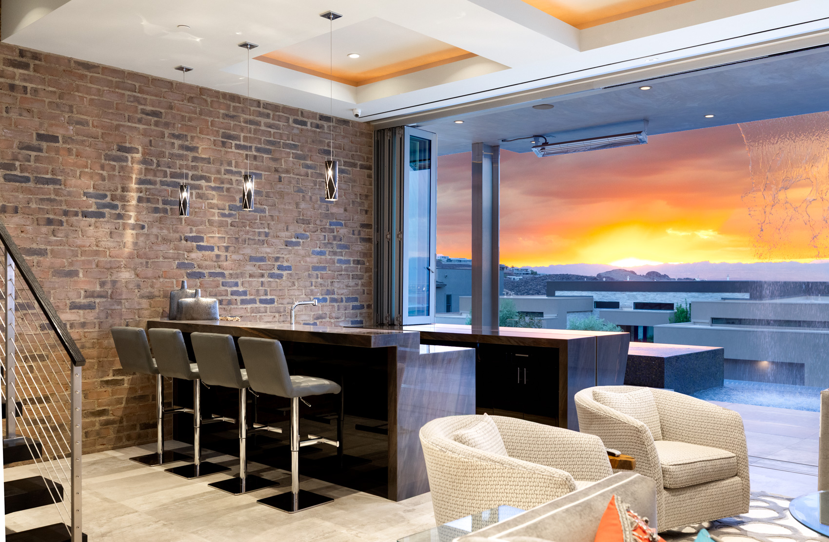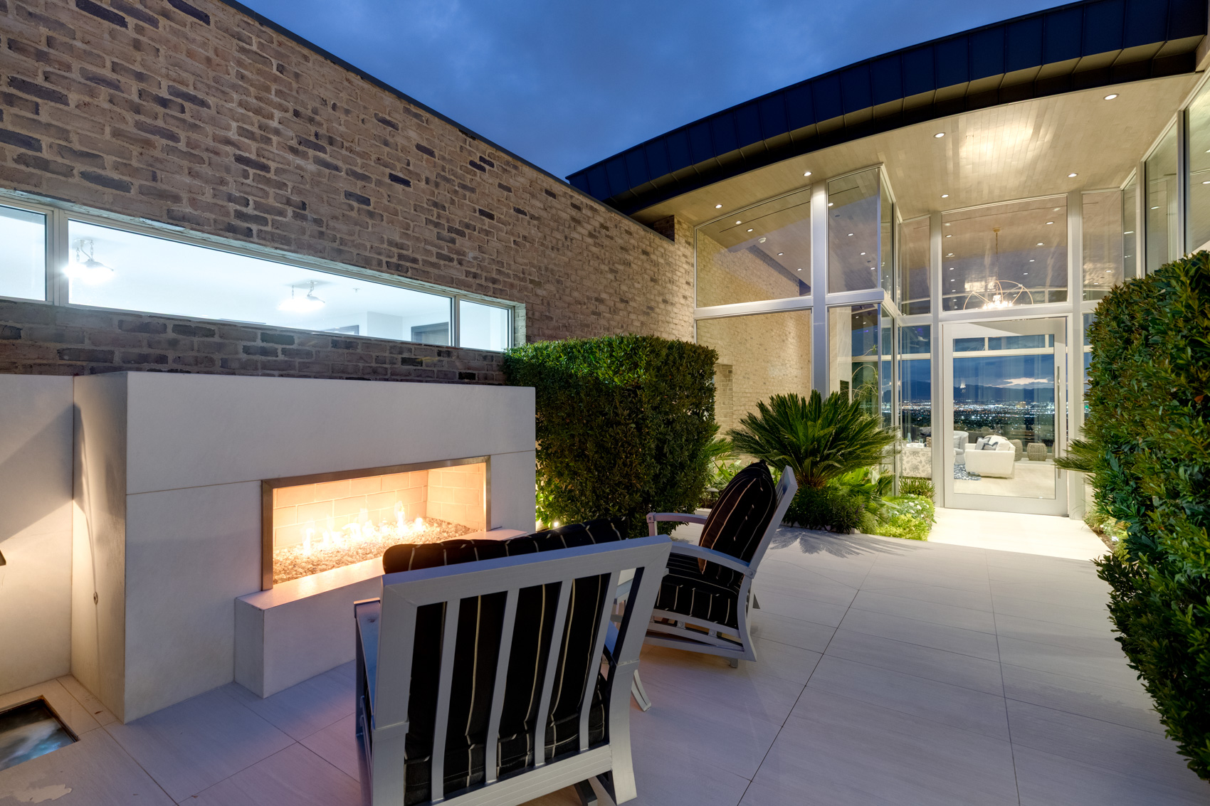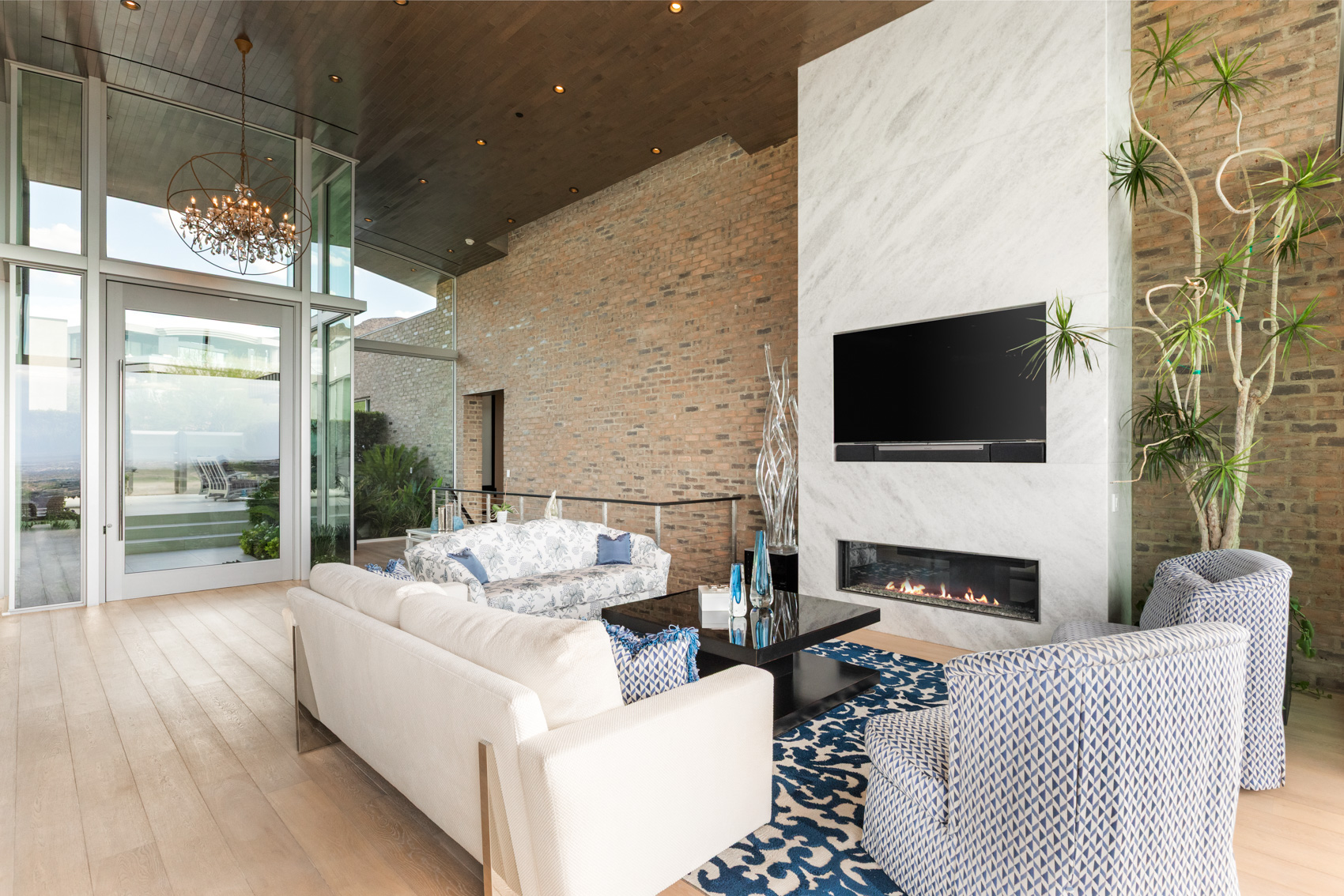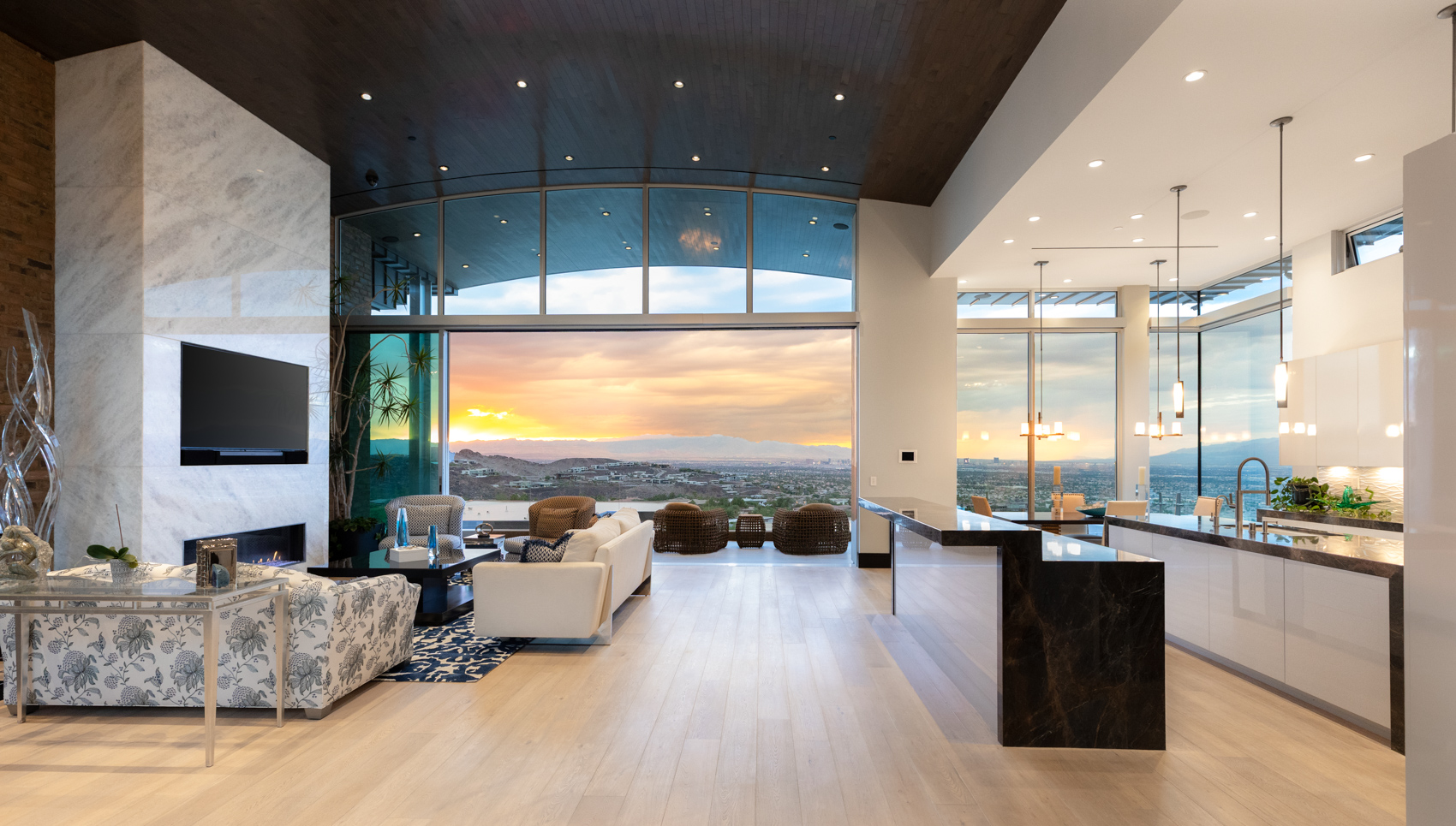 The approach to the property is as captivating as the home itself. A private courtyard entry, complete with its own fireplace, sets a welcoming yet refined tone. Step inside, and the great room immediately impresses with its soaring ceilings, intricate millwork, and a dramatic marble fireplace anchoring the space. Walls of glass showcase spectacular vistas while a five-hundred-thousand-dollar custom window and door package ensures every angle is designed to maximize light, openness, and uninterrupted panoramas.