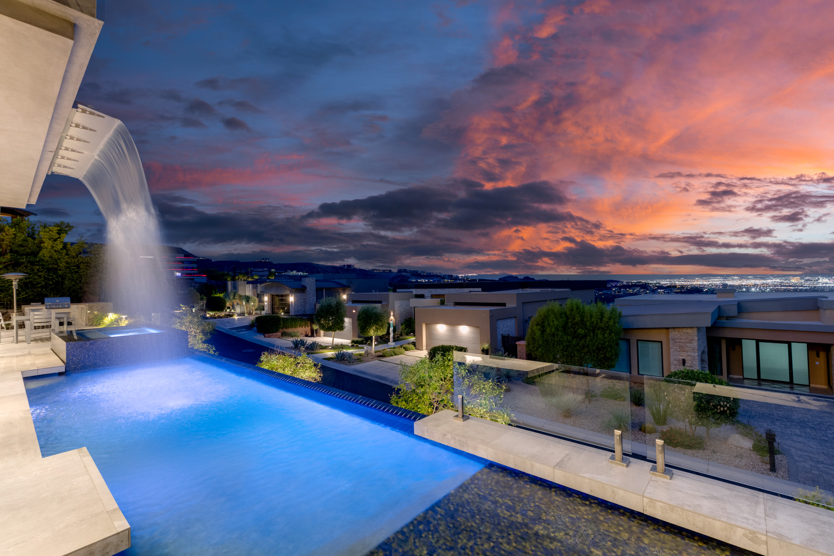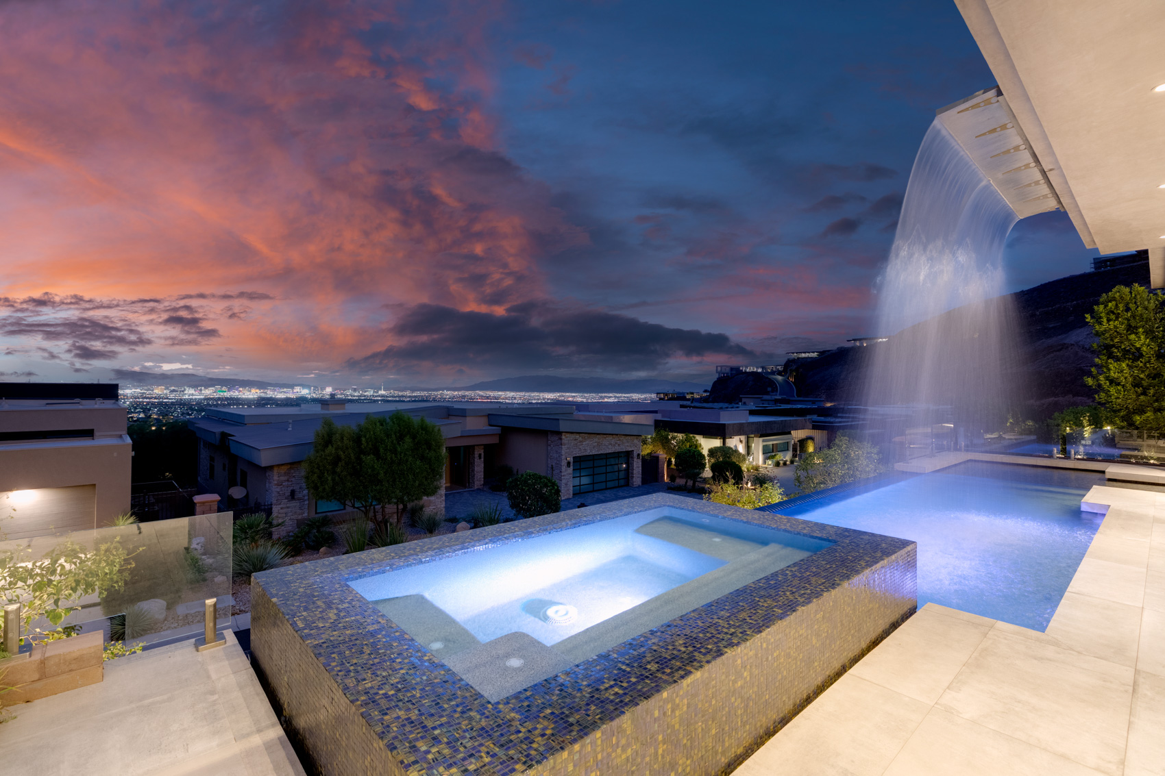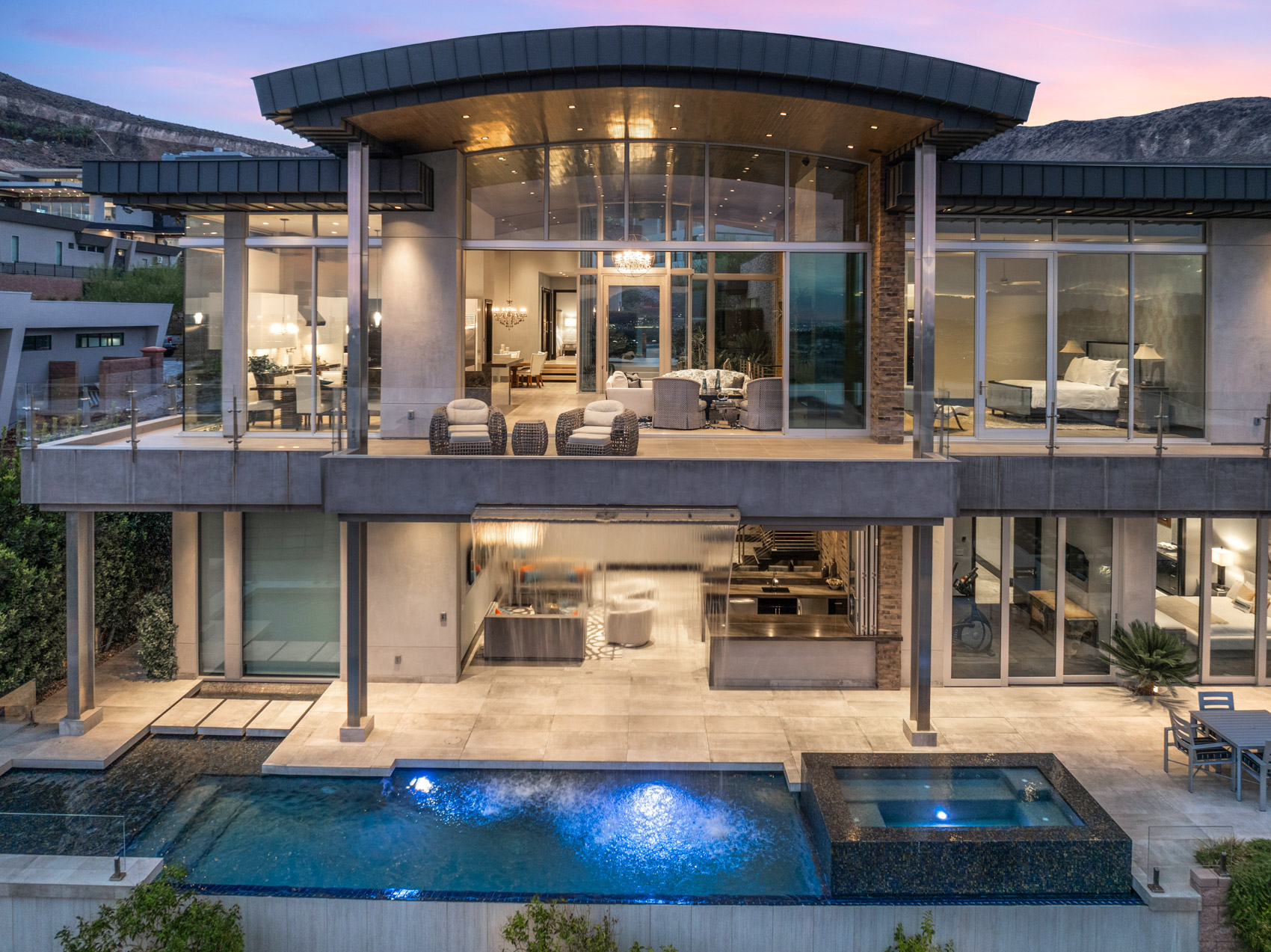 At the heart of the home lies a chefās kitchen created for both entertaining and everyday indulgence. Appointed with a Wolf eight-burner range with griddle, stainless steel hood, pot filler, and luxury appliances, the kitchen balances function and beauty with ease. Expansive slab surfaces and a striking design aesthetic pair seamlessly with a breakfast nook and a formal dining room, inviting gatherings both large and small. An elevator provides effortless access to the homeās exceptional lower-level retreat. Here, a spacious family room becomes the hub of relaxation and entertainment, featuring a wet bar and accordion doors that open completely to the outdoors. This level offers a unique perspective on the resort-style pool above, where a dramatic waterfall cascades into the sparkling waterāviewable from below. The effect is both architectural and natural, creating a show-stopping centerpiece for the backyard. The primary suite is a private sanctuary designed for ultimate comfort and indulgence. A spa-inspired bathroom features a stone shower with body jets, a heated towel rack, skylight, and boutique-style closet, along with a refrigerator for added convenience. Guest suites are equally well-appointed, each with private bathrooms, ensuring every visitor enjoys a sense of luxury and privacy. Additional highlights of this extraordinary property include a private theater, a dedicated office, and lushly landscaped grounds that enhance the sense of retreat. Outdoors, the design continues to impress with a vanishing-edge pool and spa, a summer kitchen perfect for entertaining, and multiple spaces for dining, lounging, or simply soaking in the iconic Las Vegas views. Every detail of 677 Tranquil Rim Court has been carefully curated to balance sophistication with livability. From the extensive slab finishes and full-slab showers to the seamless integration of indoor and outdoor spaces, the estate is a showcase of modern luxury in one of Hendersonās most sought-after communities. This is more than a residenceāit is an experience. With its elevated position, architectural pedigree, and resort-like amenities, 677 Tranquil Rim Court captures the very essence of desert contemporary living while offering an unparalleled vantage point over the dazzling lights of the Strip.