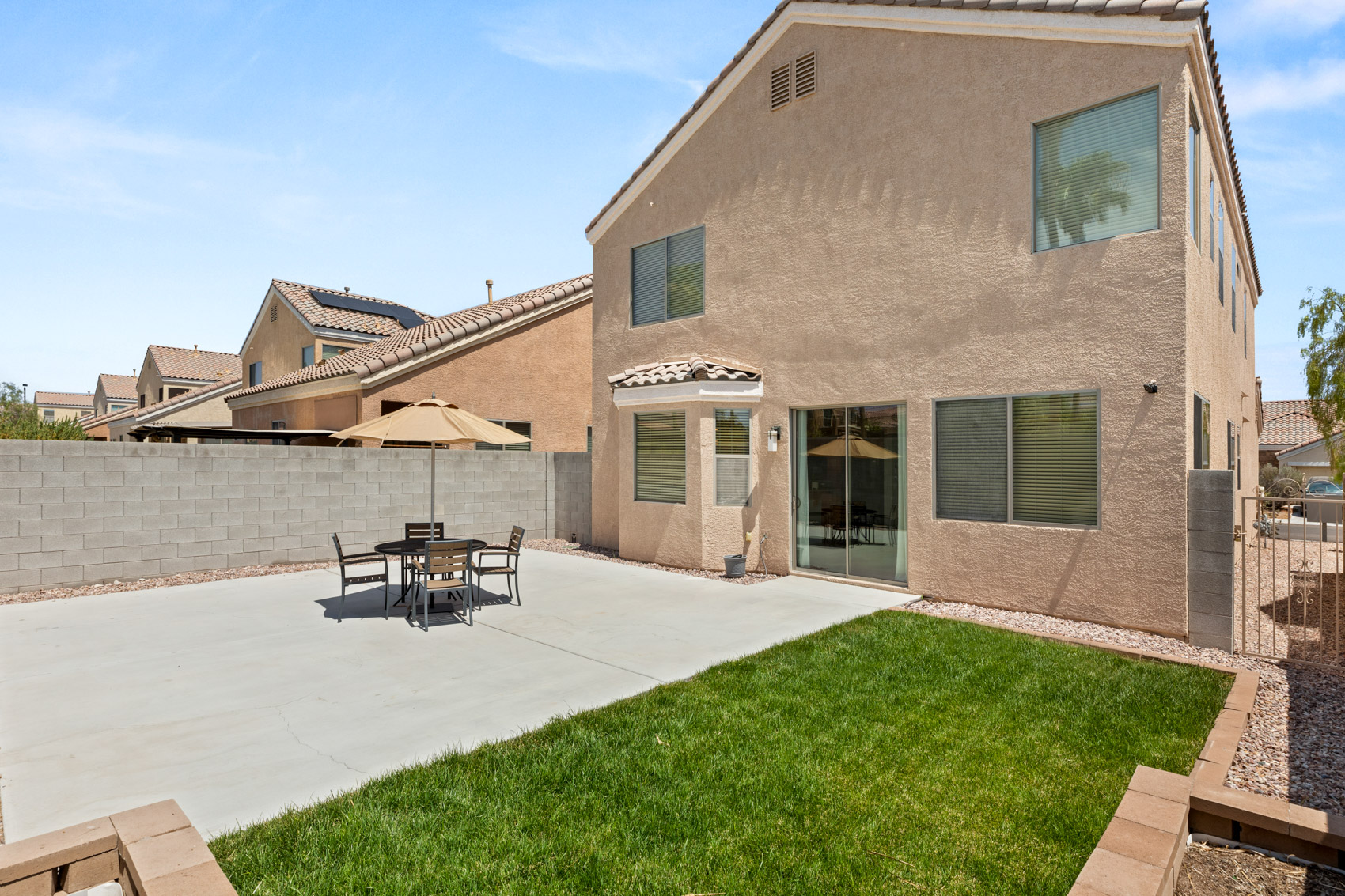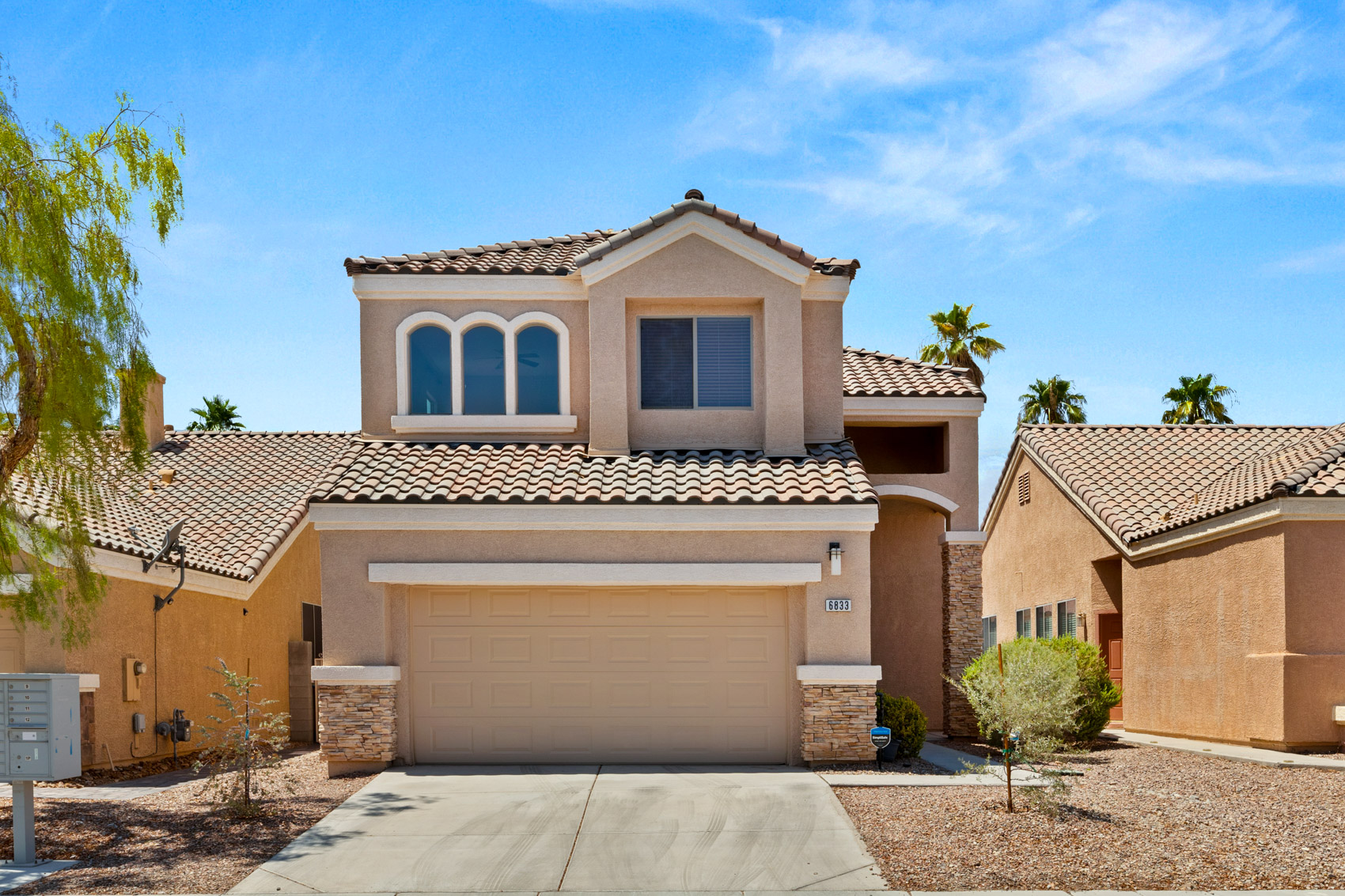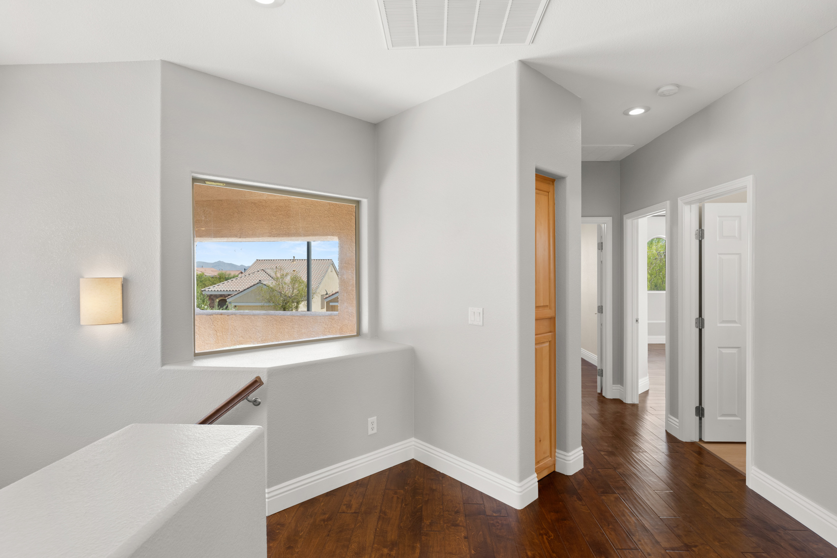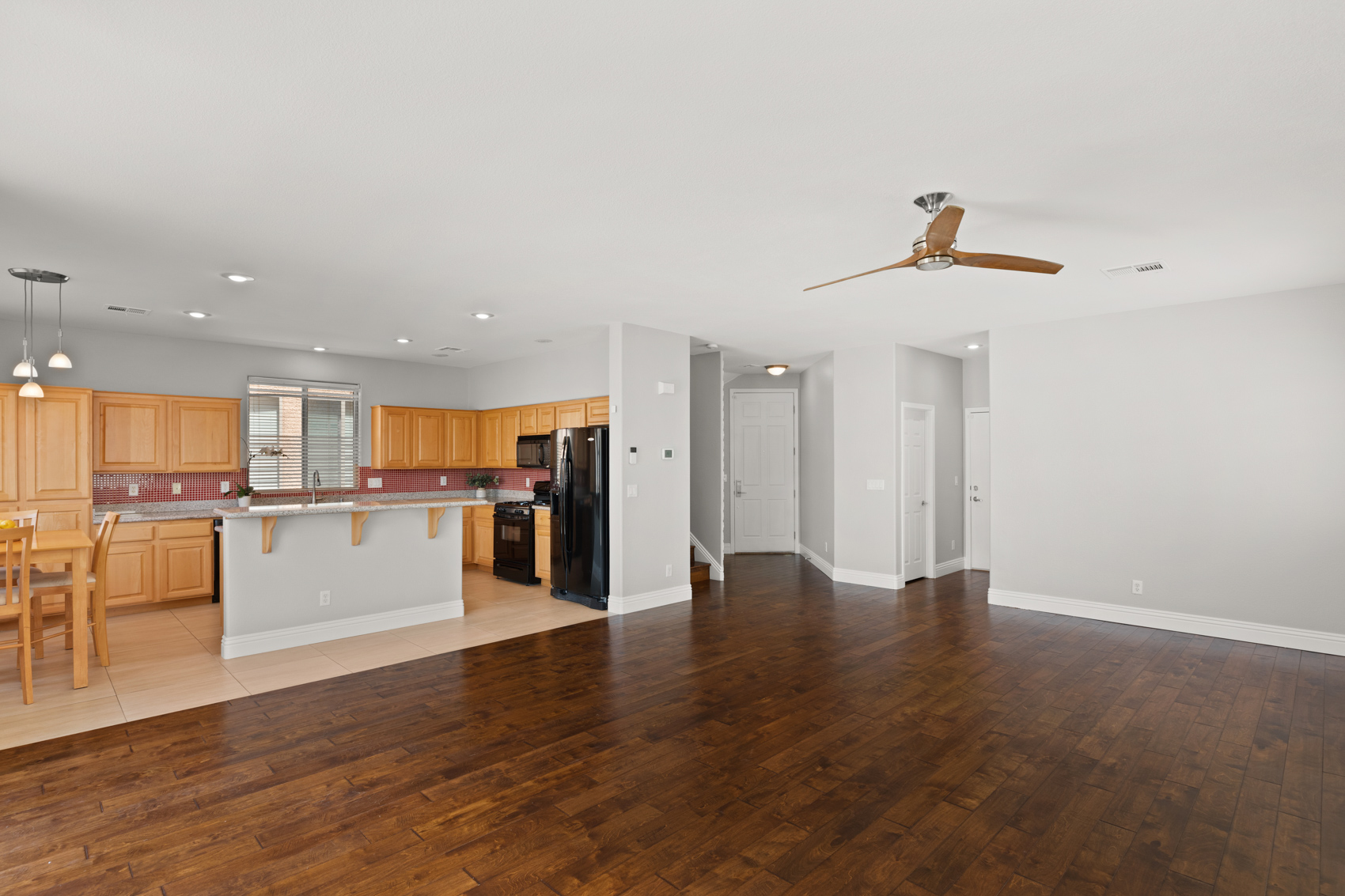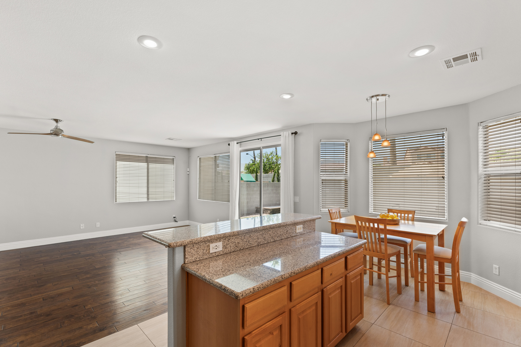 Discover this stunning two story home nestled in the heart of Centennial Hills! The gorgeous stone entryway leads into an inviting great room and kitchen area with elegant custom hand scraped wood flooring throughout. The kitchen is equipped with beautiful granite countertops, ample cabinets, and an island with storage and perfect for casual dining.