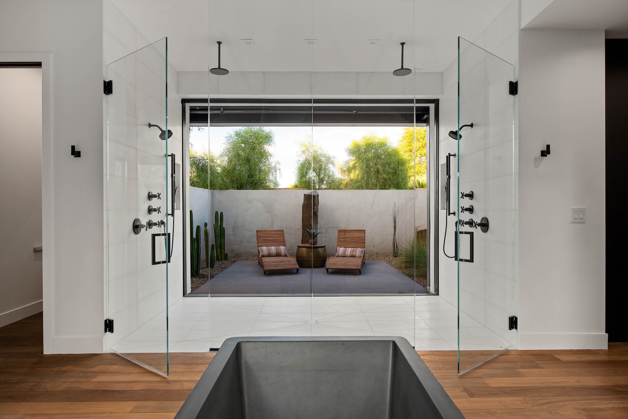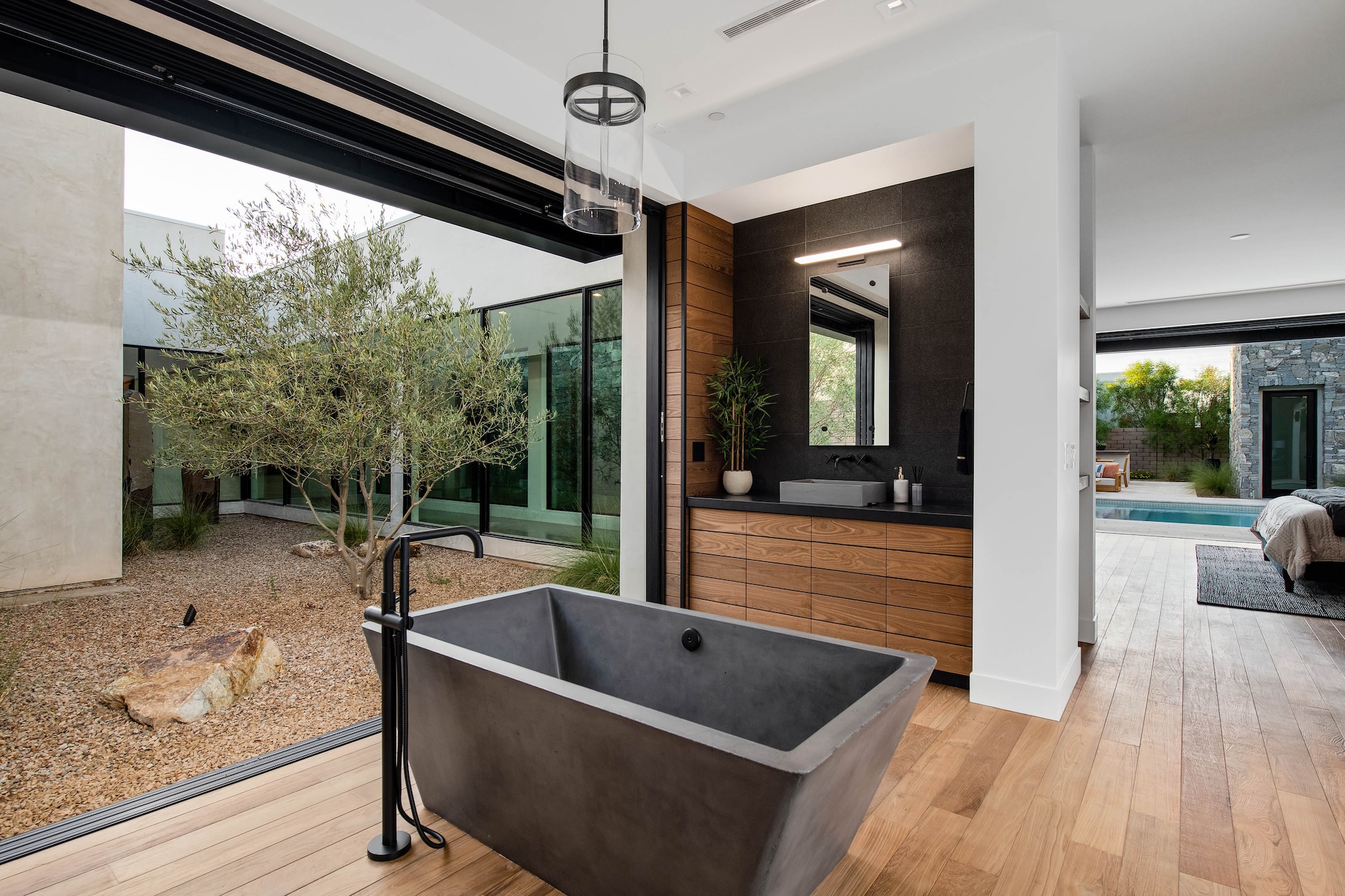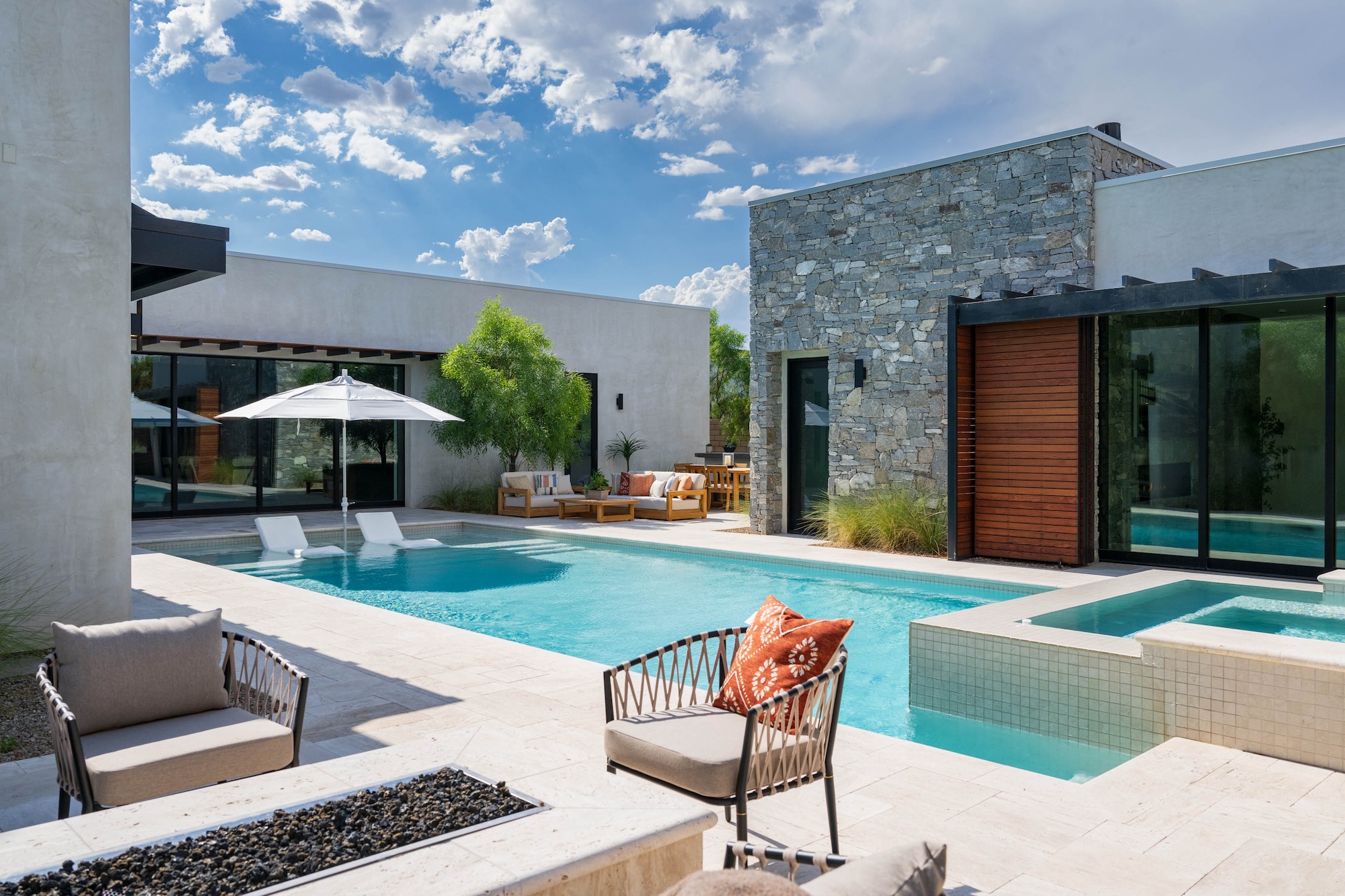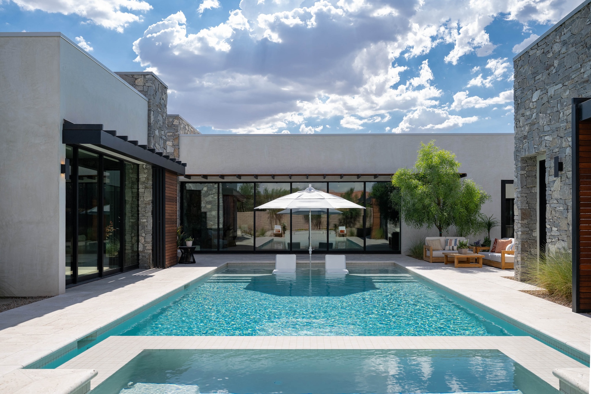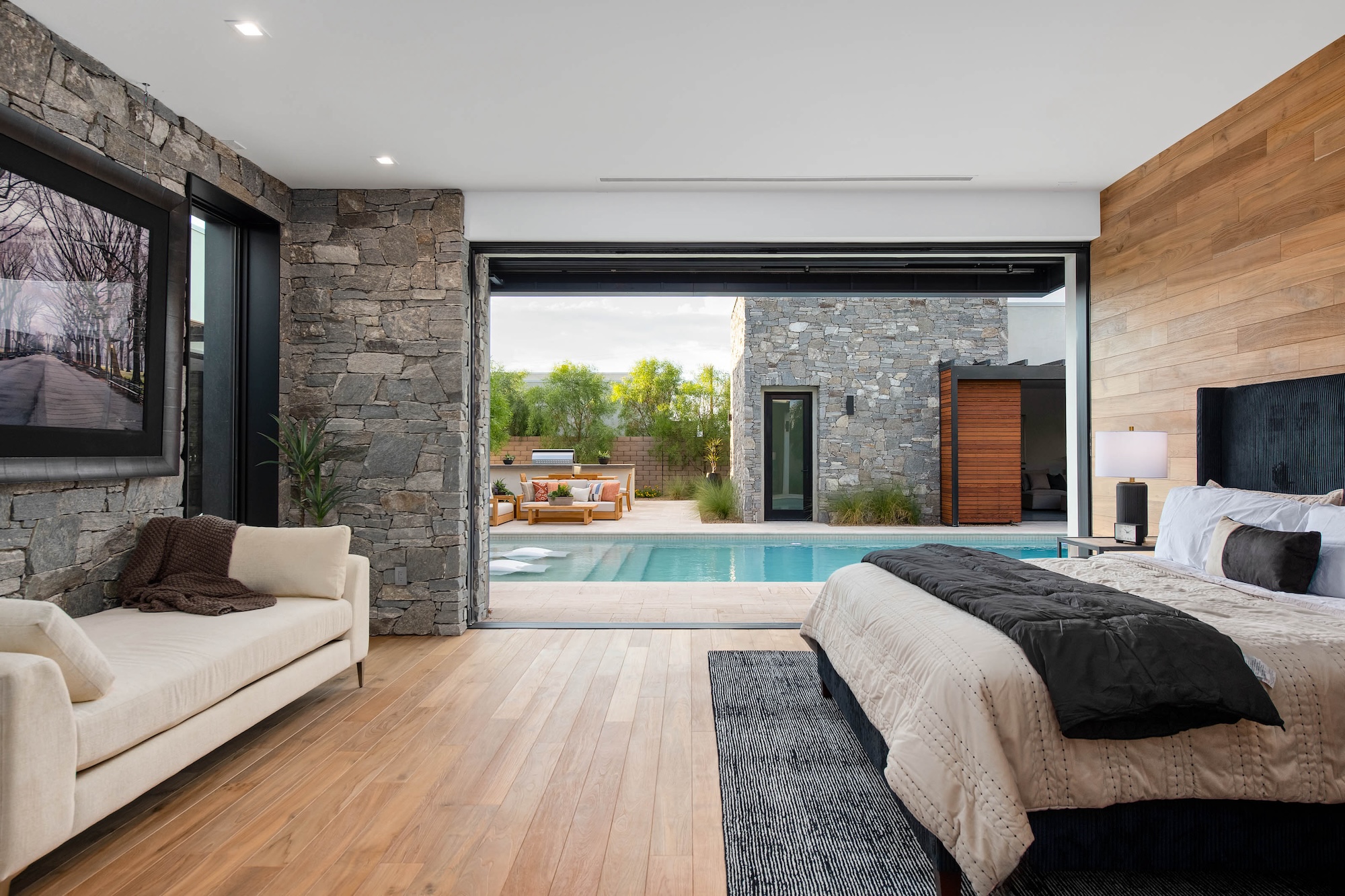 Architectural Brilliance by Peter Lik Peter Lik's visionary touch permeates every inch of this custom home, reflecting his deep-seated passion for industrial architecture and organic modern design. Having captured the world's most breathtaking natural vistas and architecturally significant landmarks, Lik channels his artistic prowess into creating homes that inspire awe. The "Azure" model at 6844 Milos Road is a testament to this unique fusion of nature's beauty and cutting-edge design. --- Organic, Modern Living on a Single Level Spanning a generous 4,826 square feet, this single-story residence offers a seamless flow of space, providing both grandeur and intimacy. The open-concept layout ensures that every room is bathed in natural light, with pocket doors in every room that effortlessly blend the indoors with the outdoors, inviting the beauty of the surrounding landscape into your living space. --- Luxurious Living Spaces - Main Residence: The main home boasts three en-suite bedrooms, each a private sanctuary of comfort and style. The primary suite is a standout, accessed via a stunning glass hallway that sets the stage for a dramatic entrance. Here, you'll find motorized wood shutters that offer both privacy and a connection to the outdoors, an indoor/outdoor shower that transforms your daily routine into a spa-like experience, and a boutique-style closet that caters to your every storage need. - Guest House: The additional 712-square-foot guest house is a versatile space that ensures your guests enjoy their stay in comfort. Equipped with a kitchenette featuring a dishwasher, sink, microwave, and refrigerator, it provides all the conveniences of a full home in a compact, elegant package. --- Exquisite Outdoor Living Nestled on nearly half an acre, the expansive backyard is a haven for outdoor living and entertainment. Dive into the pool or unwind in the spa while enjoying the tranquility of your private oasis. The built-in BBQ area is perfect for hosting summer gatherings, while two fire features add a touch of warmth and ambiance to evening soirƩes under the stars. --- Exceptional Location and Convenience Set within a gated community that epitomizes exclusivity and security, this residence is a mere 10 minutes from the Las Vegas Strip. Revel in the proximity to world-class entertainment, dining, and shopping, while enjoying the serenity of a secluded neighborhood. With easy access to the international airport, travel becomes a breeze, making 6844 Milos Road the perfect home for those who seek both luxury and convenience. --- Discover the Jewel Homes Difference Jewel Homes, under the meticulous guidance of Peter Lik, has set new standards in residential design and construction. Each home is crafted with an eye for detail and a commitment to excellence, ensuring that your living experience is nothing short of extraordinary. The homes are situated in premium locations, offering the perfect blend of urban convenience and suburban tranquility. --- Make 6844 Milos Road Your Home Experience a lifestyle of unparalleled luxury and sophistication at 6844 Milos Road. This residence is more than just a home; it's a masterpiece designed for those who appreciate the finer things in life. Contact us today to schedule a private viewing and step into a world where art and architecture come together to create something truly magnificent. .