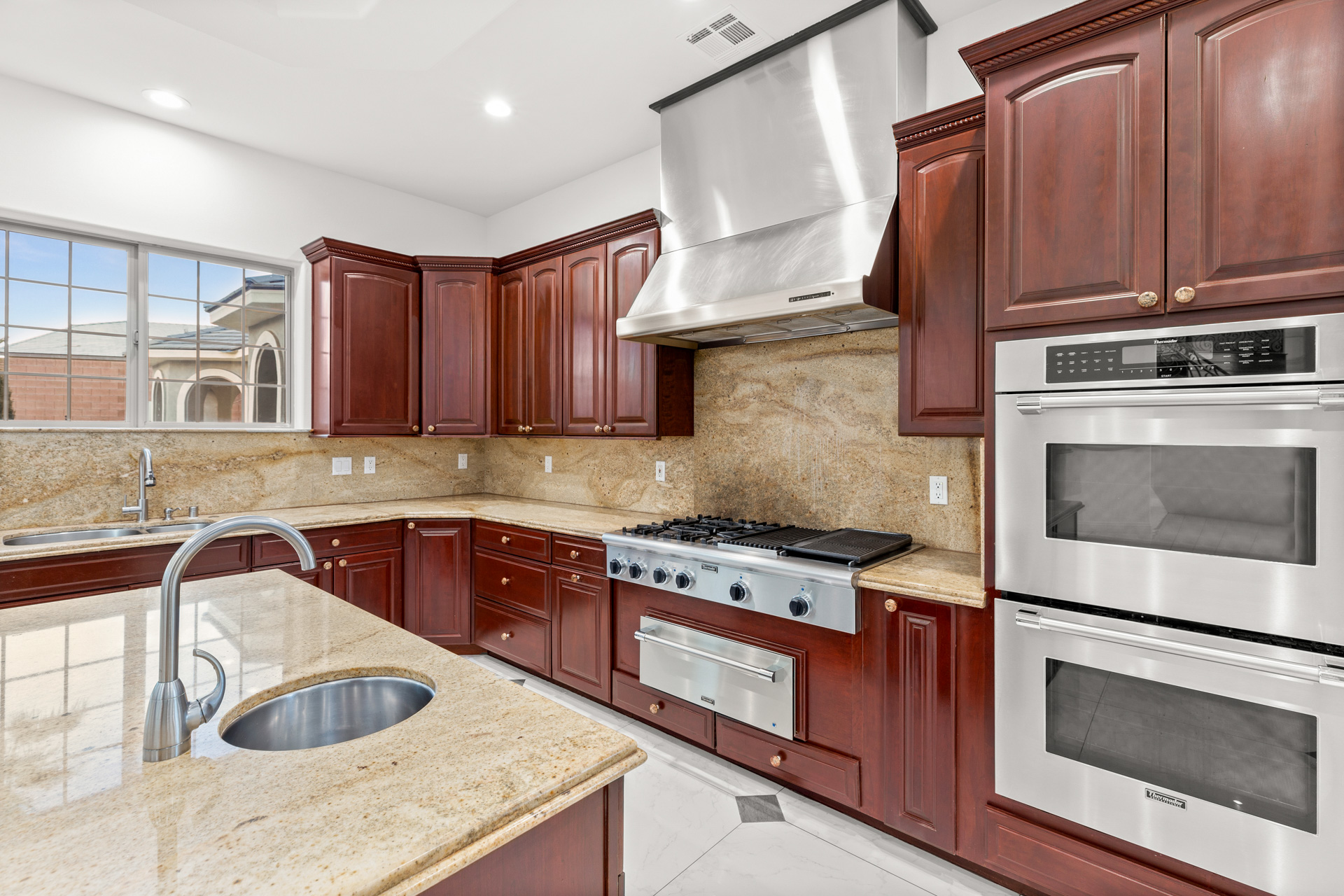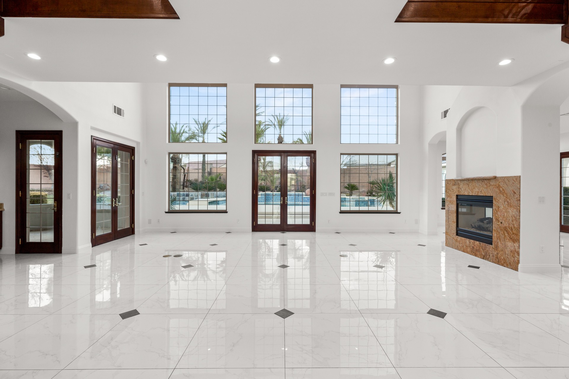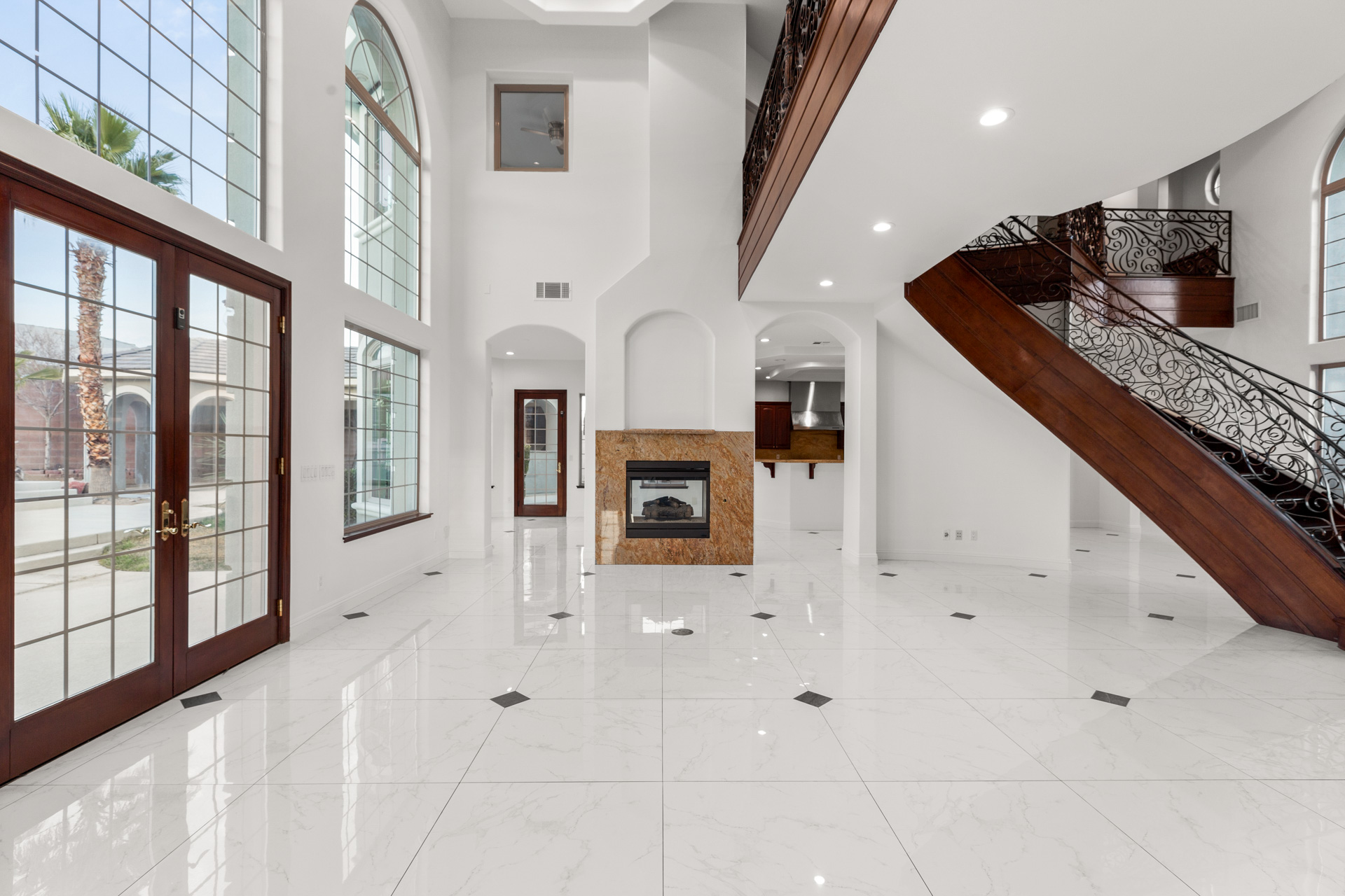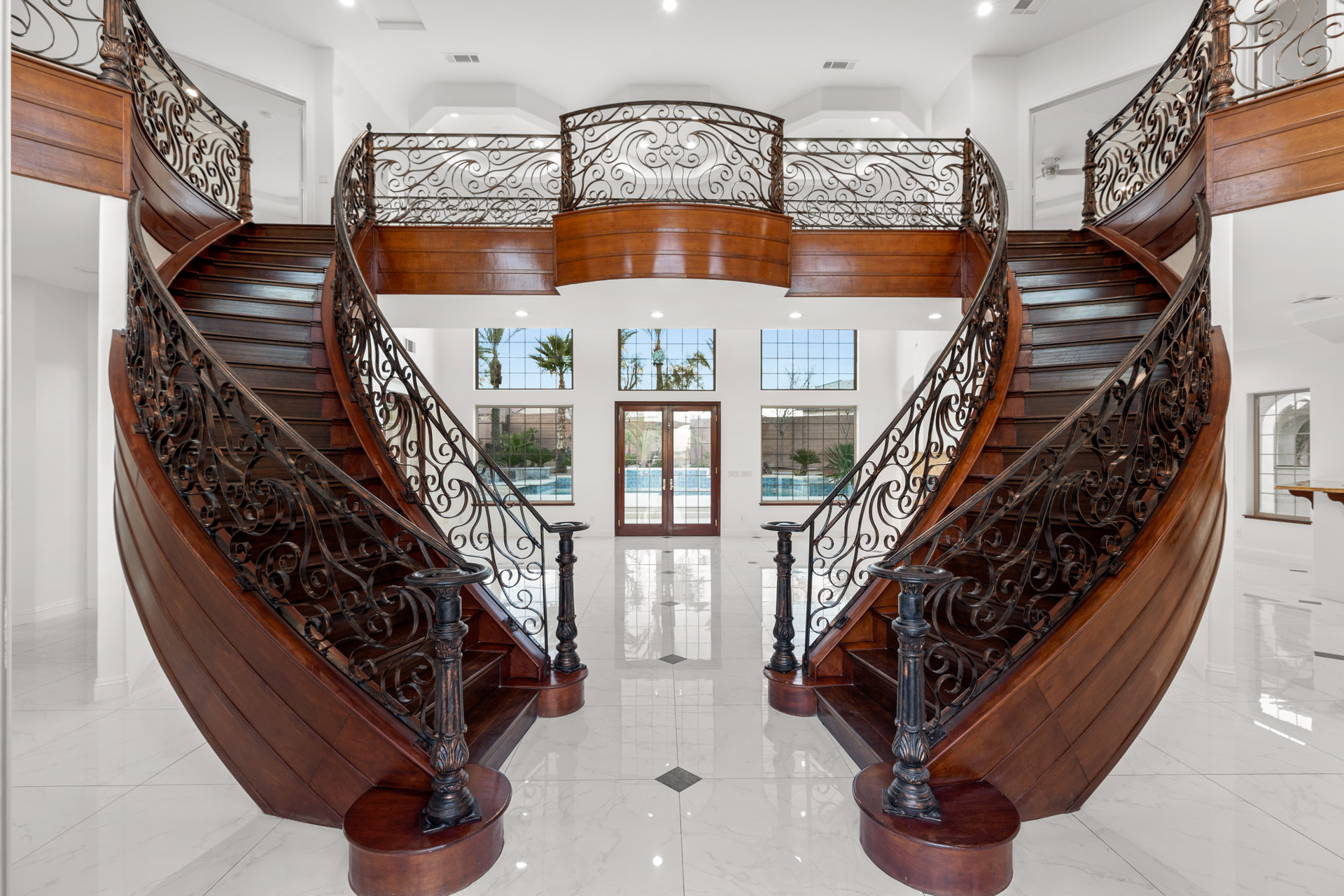 The entry foyer features an elegant double staircase and high ceilings for that WOW factor upon entering. High level custom finishes are used throughout, including Travertine floors, granite countertops, and stainless steel appliances. Additional features include a wet bar, two laundry rooms, and a walk-in pantry. All bedrooms are master-sized with en suite bathrooms.