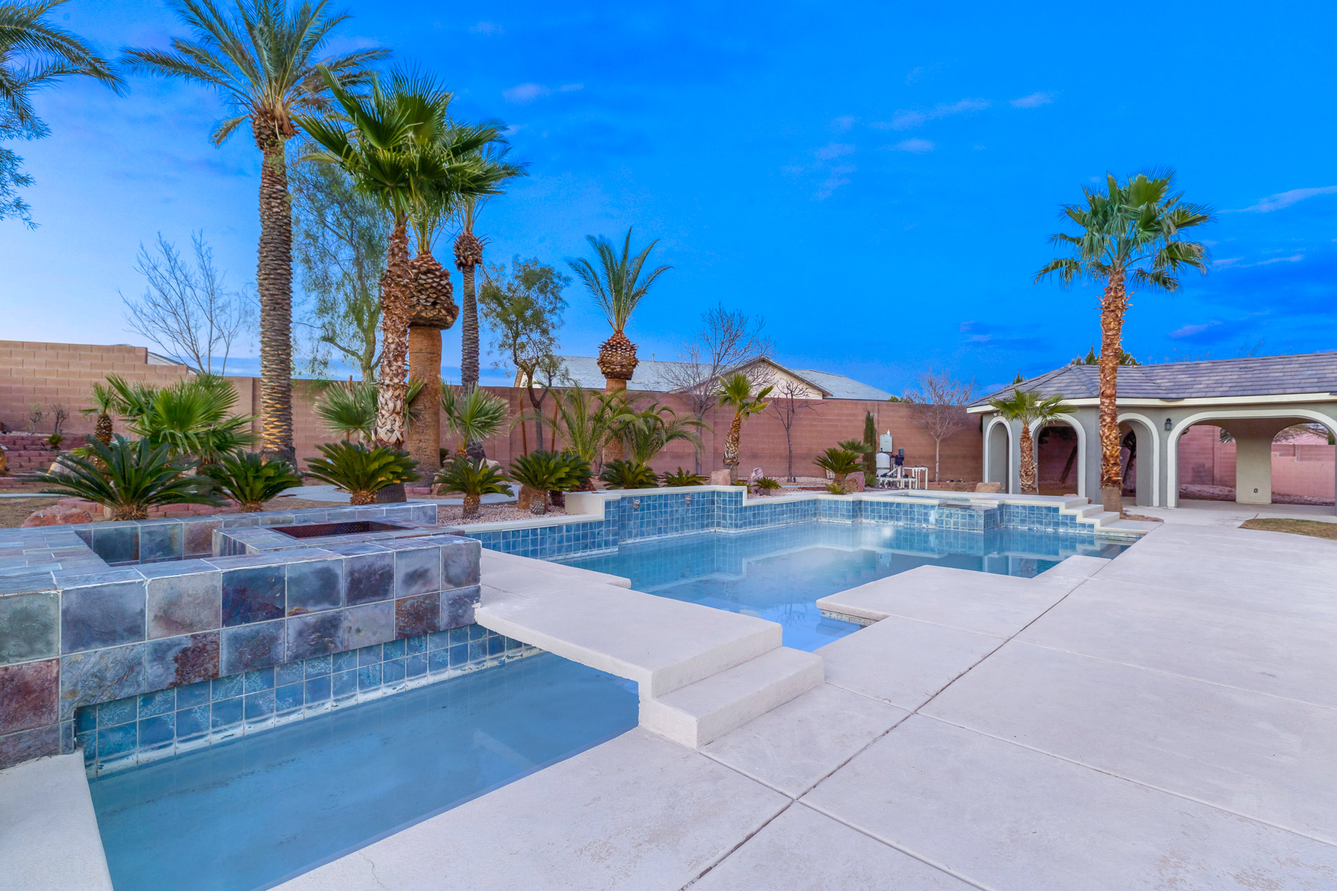 There is gated RV/boat parking along with a 3 car garage and large carport. The backyard offers a huge pool and spa, in-ground fire pit, and separately covered pool/lounge pavilion with a built-in BBQ.