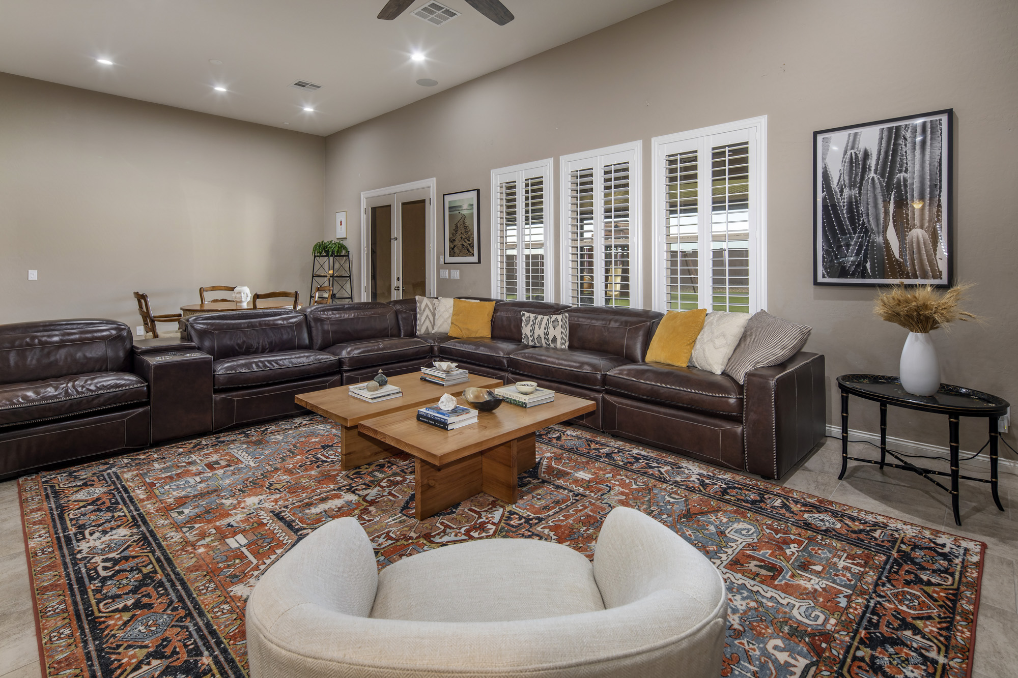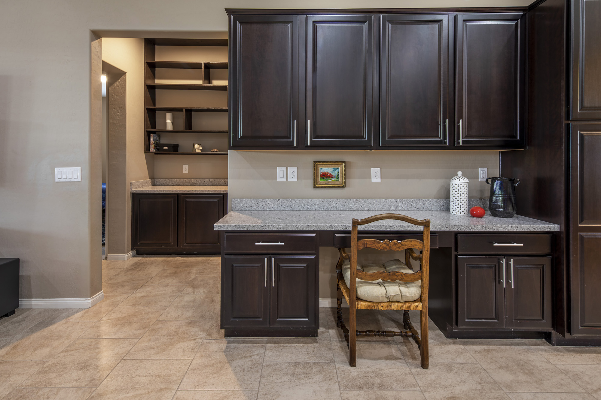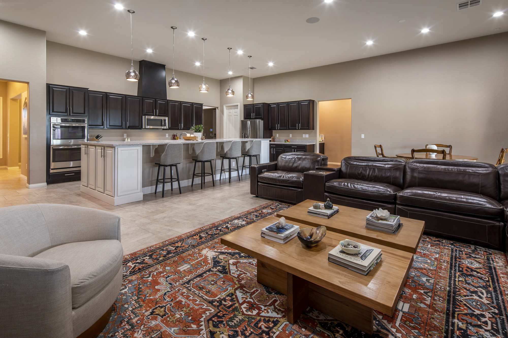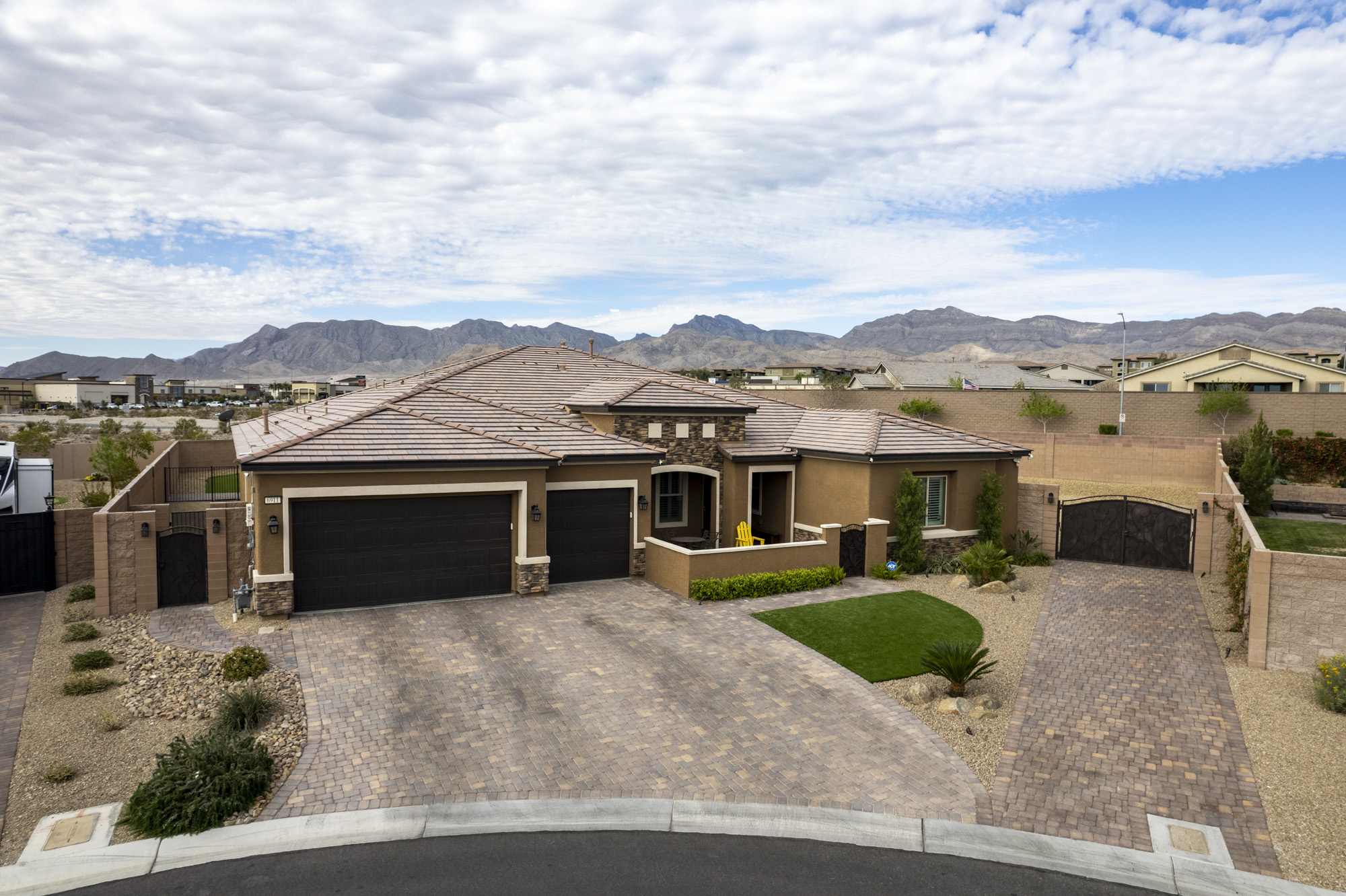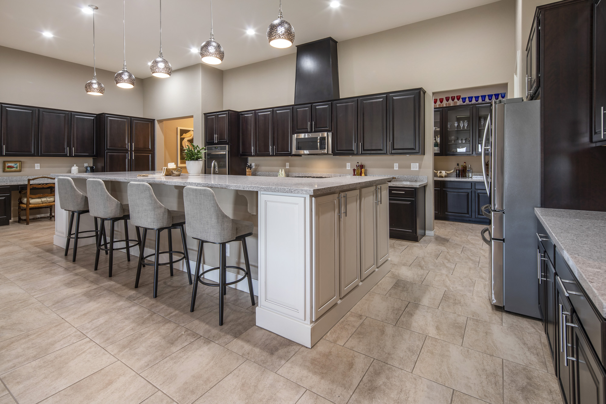 The property is encircled by amazing views of mountains and offers true privacy in the backyard. The entry foyer opens to a large entertaining great room and the chefās kitchen with an amazing oversized kitchen island. The elegant butler pantry area leads to a nice dining room that could be a second office addition to a den/office that is privatized with French doors.