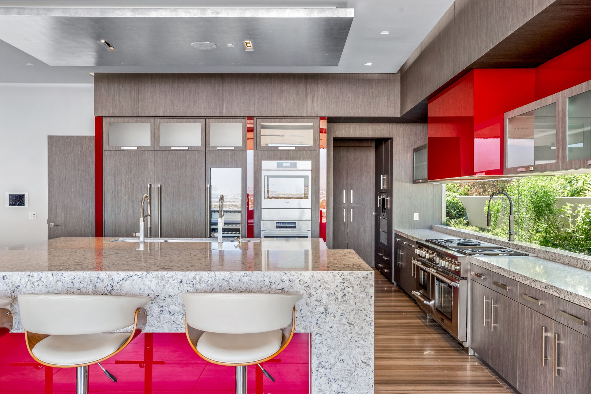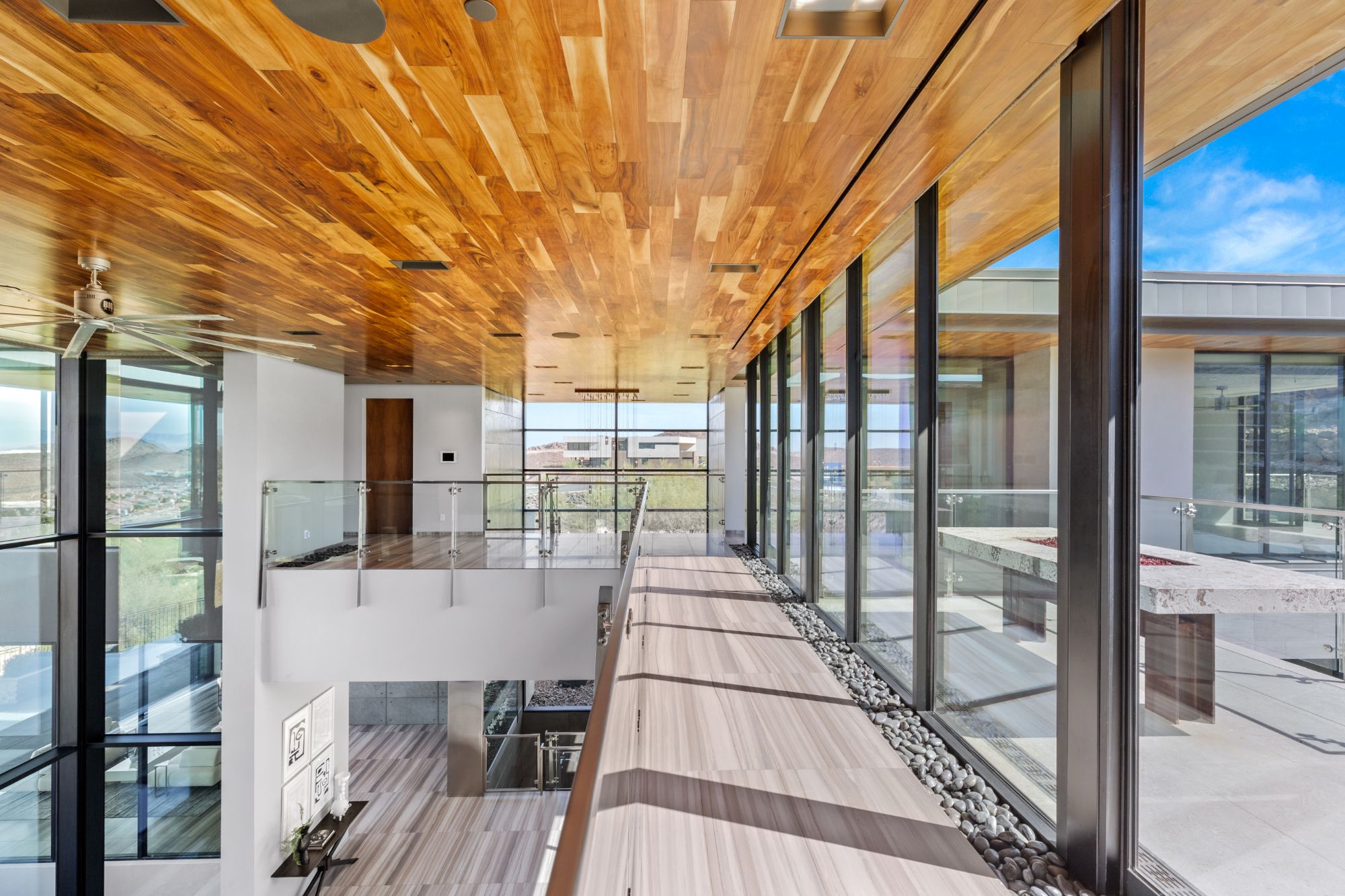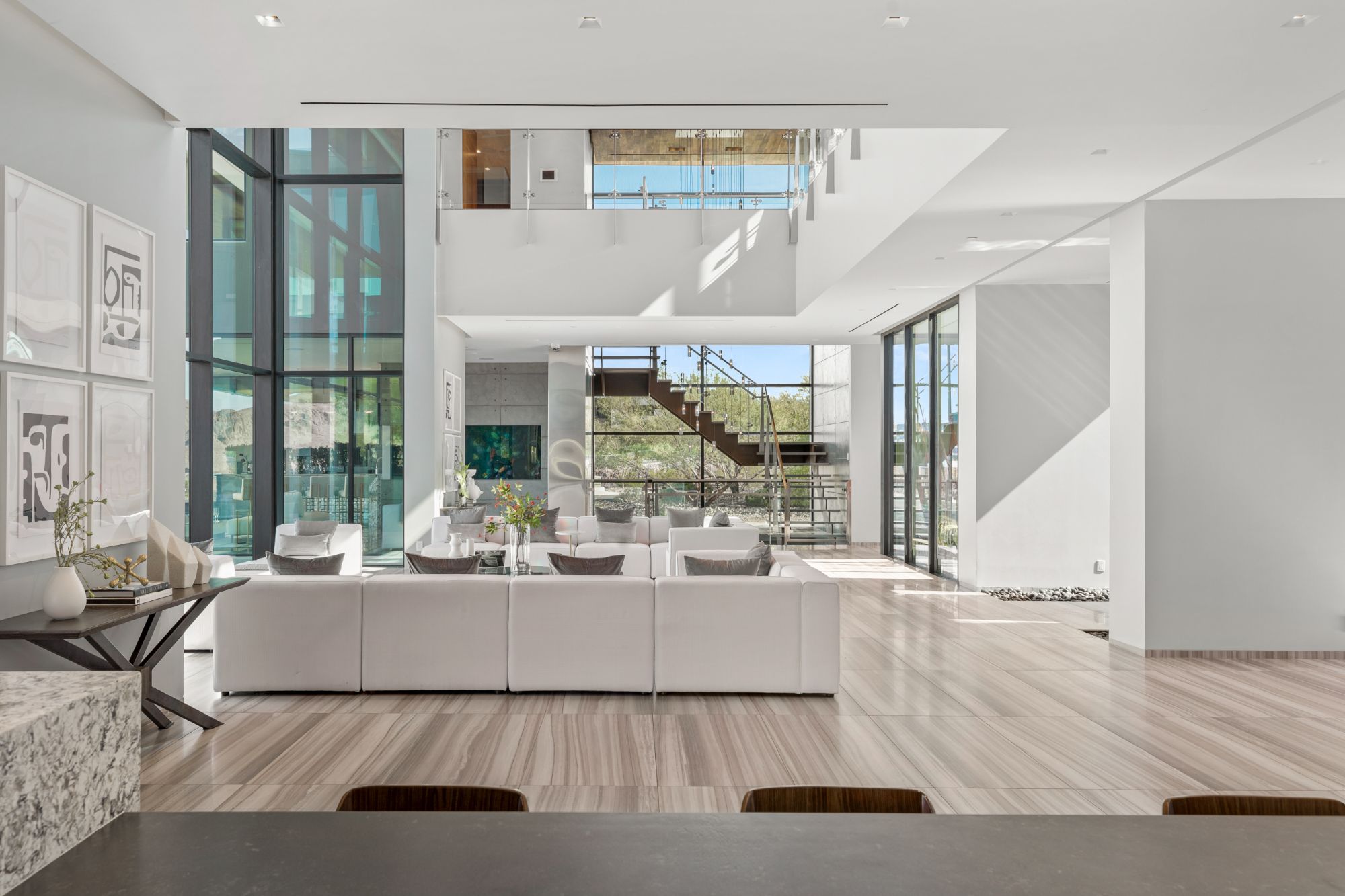 Indoor and outdoor appeal have been masterfully blended, seamlessly merging both industrial and natural elements. As one enters the home through a private courtyard with an illusional floating pathway over a koi pond, soaring spaces and geometric elements add to the feeling of lightness. The disappearing glass walls throughout the property further blend the indoor space with the outdoor beauty of the surrounding landscape. It is easy to be captivated by the unrivaled outdoor views of the valley, but the interior architecture is equally as mesmerizing.