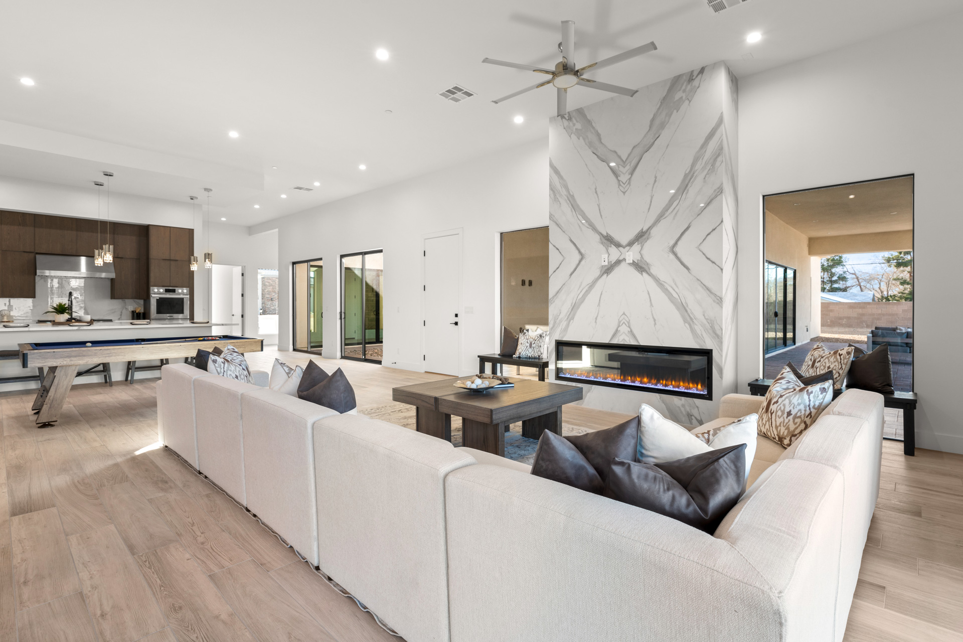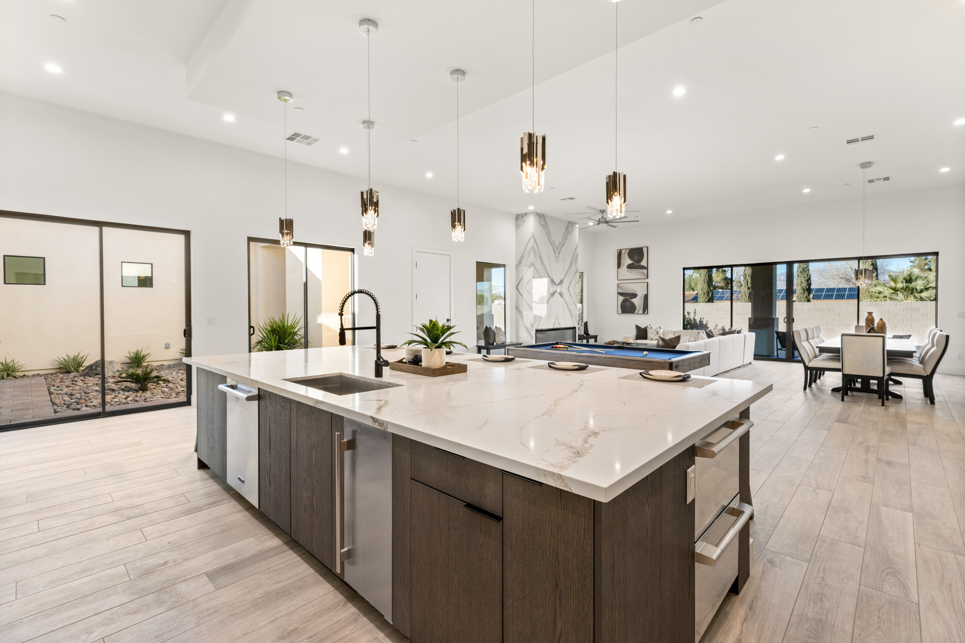 The gourmet kitchen is complete with sleek cabinetry and stainless-steel appliances, and a massive center island. The primary bedroom features a walk-in closet with a bench and access to a saferoom.