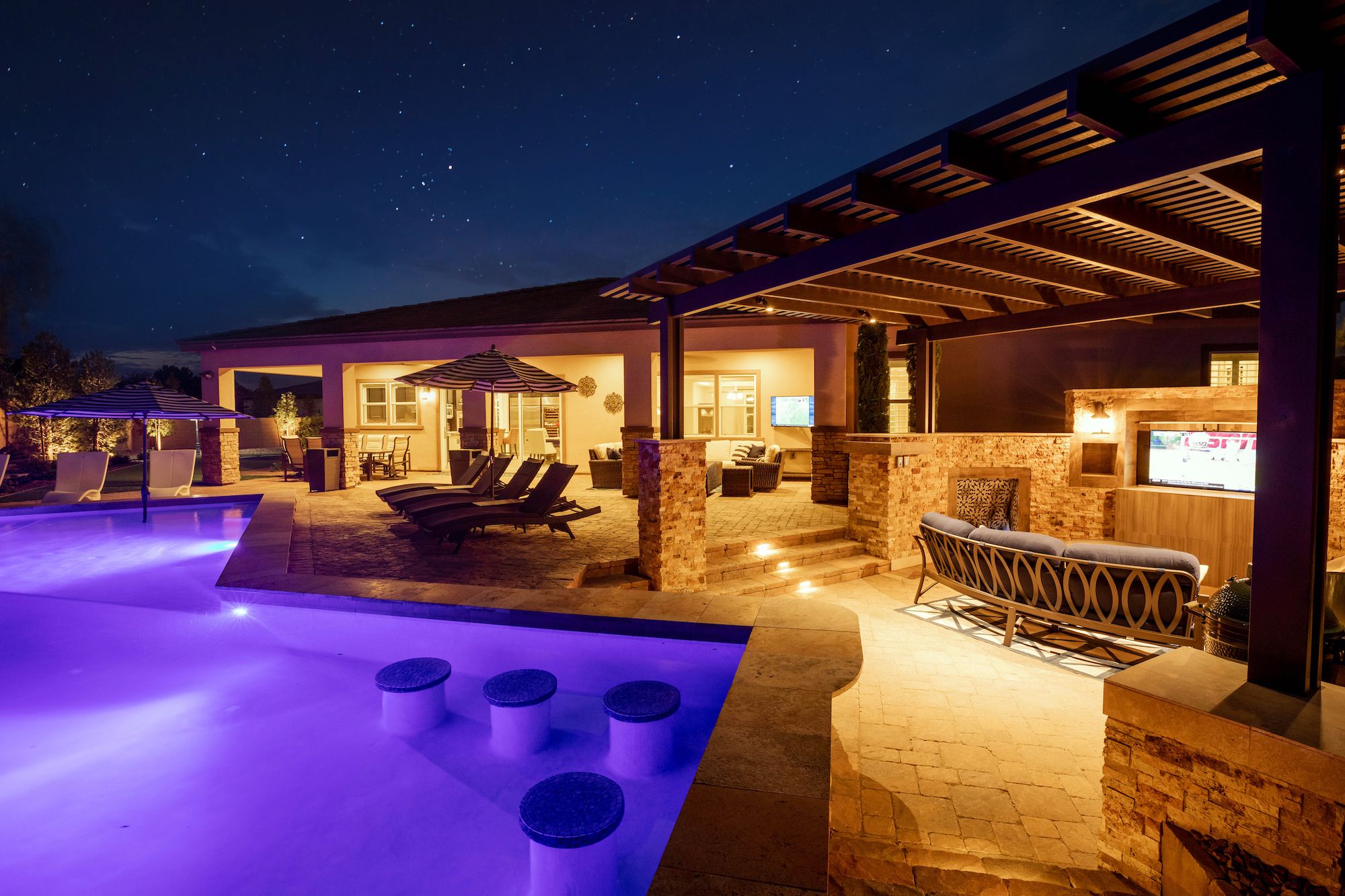 This 3,608 square foot single-story home in the desirable Savona community has 4 bedrooms, 3 baths, and garage space for 4 vehicles. The half-acre lot offers a courtyard, covered patios, gazebo, outdoor kitchen, RV parking, and a resort-style backyard oasis.