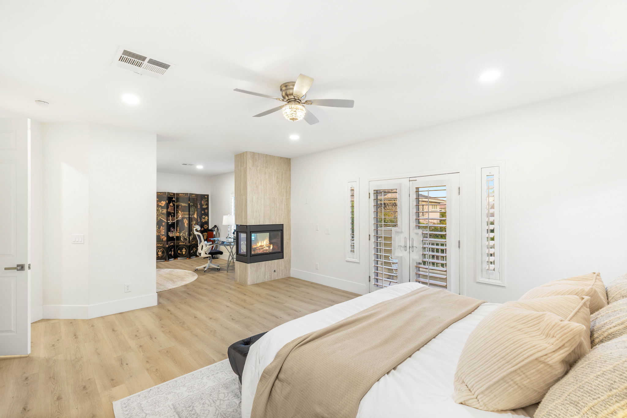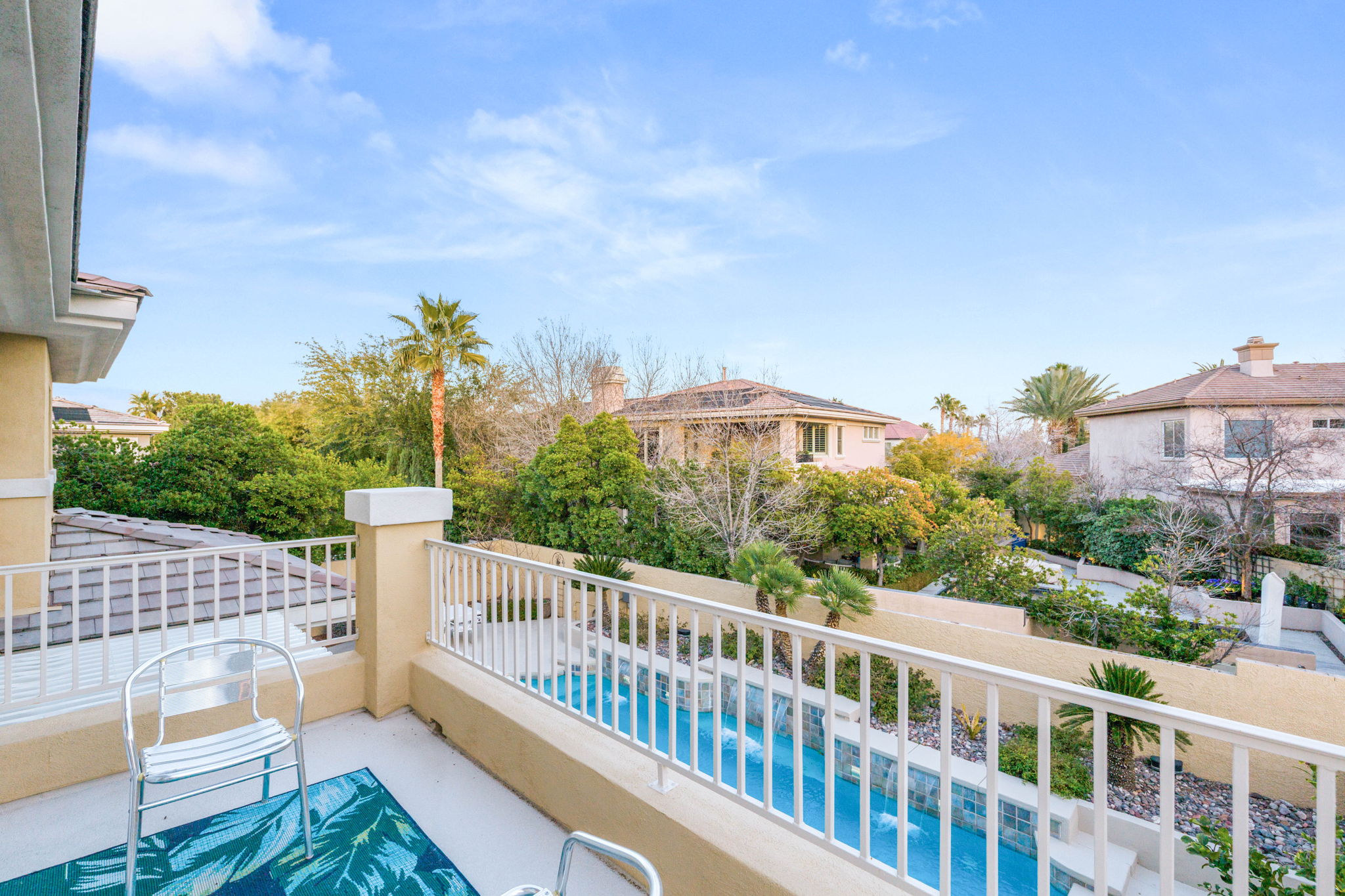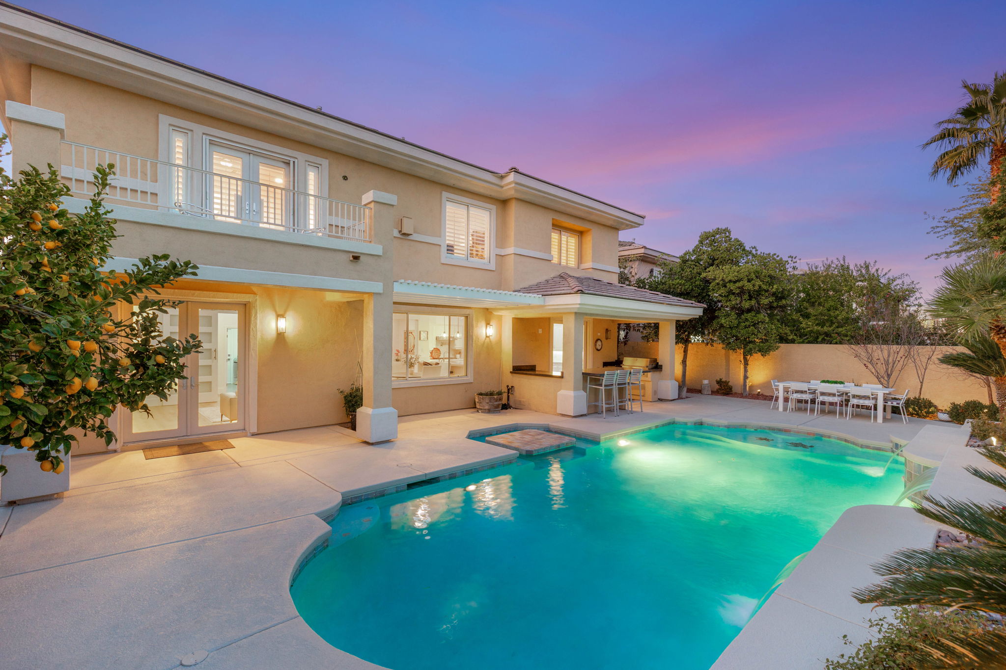 The spacious primary suite includes a private balcony, a sitting area with a dual-sided fireplace, and a spa-like bathroom with dual walk-in customized luxury closets, a designer walk-in shower, and a freestanding soaking tub. The backyard is ideal for entertaining with lush landscaping, two covered patios, a bamboo garden, an outdoor kitchen, and a resort-style pool. Recent upgrades include new HVAC systems, pool heater, water softener, and hot water heater. Experience an elevated lifestyle in a prime location just minutes from Tivoli Village, Boca Park, the JW Marriott, and more.
