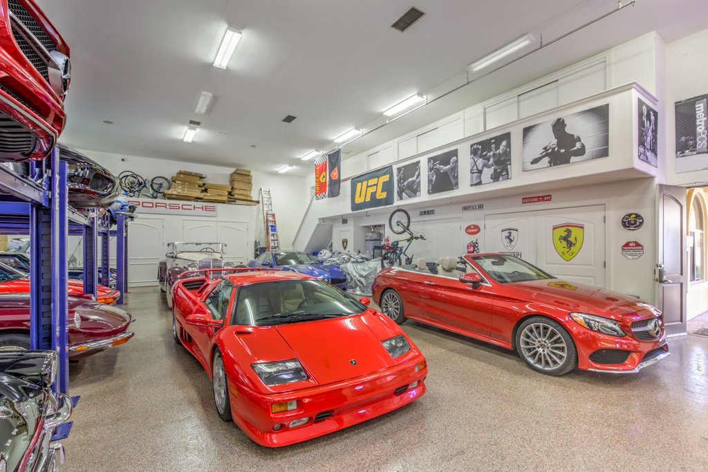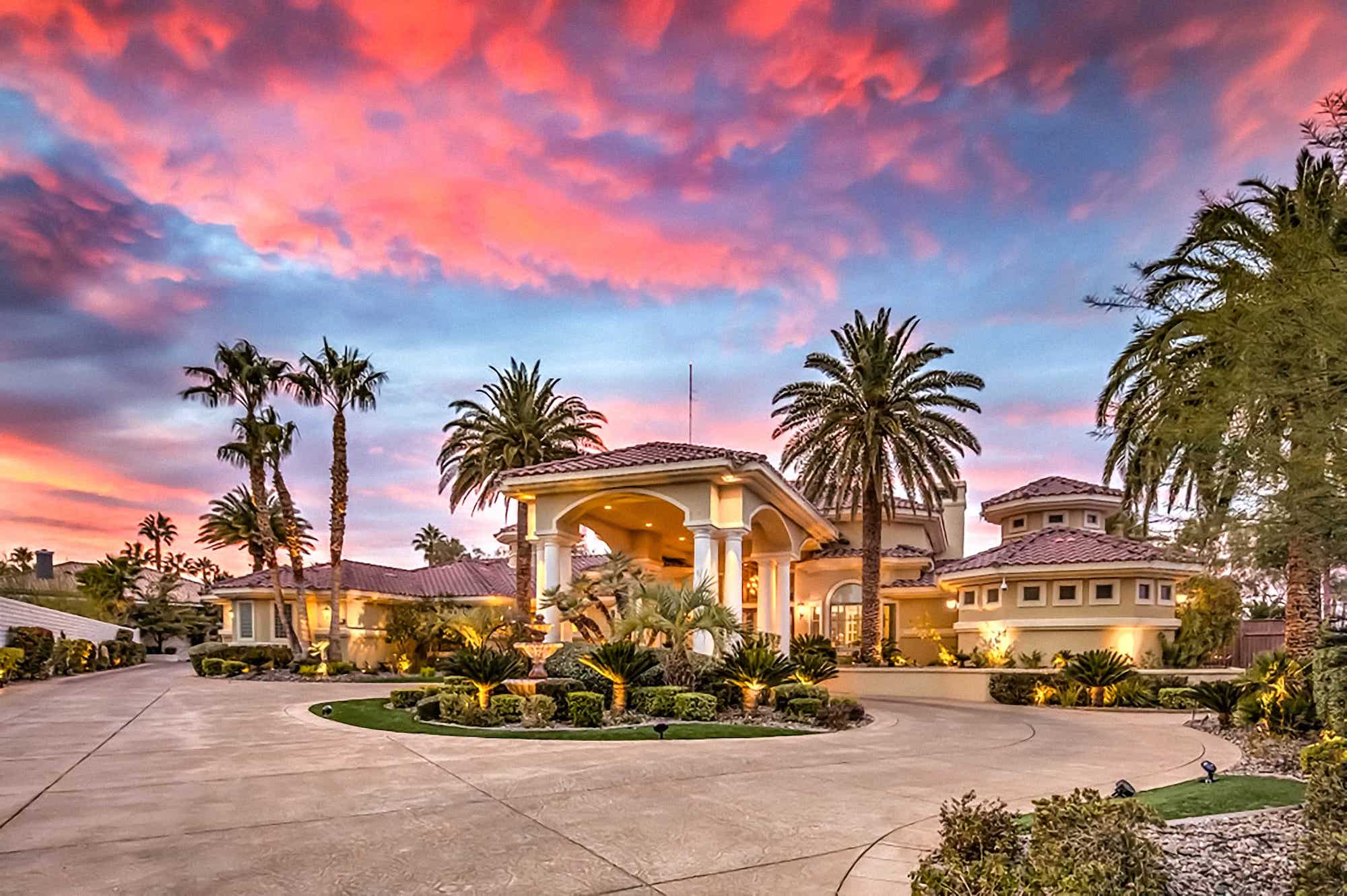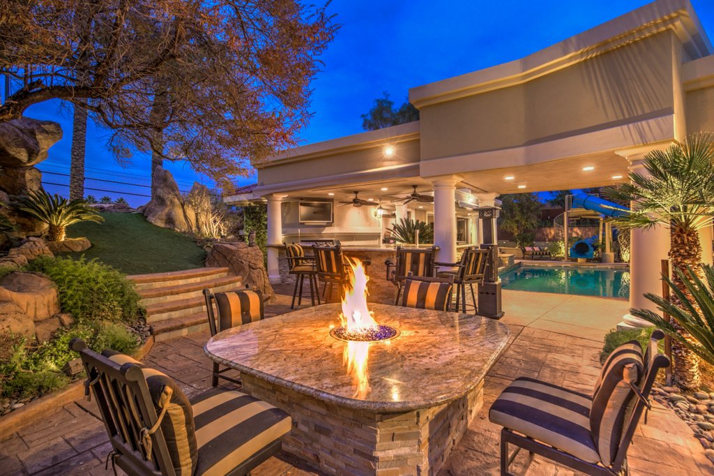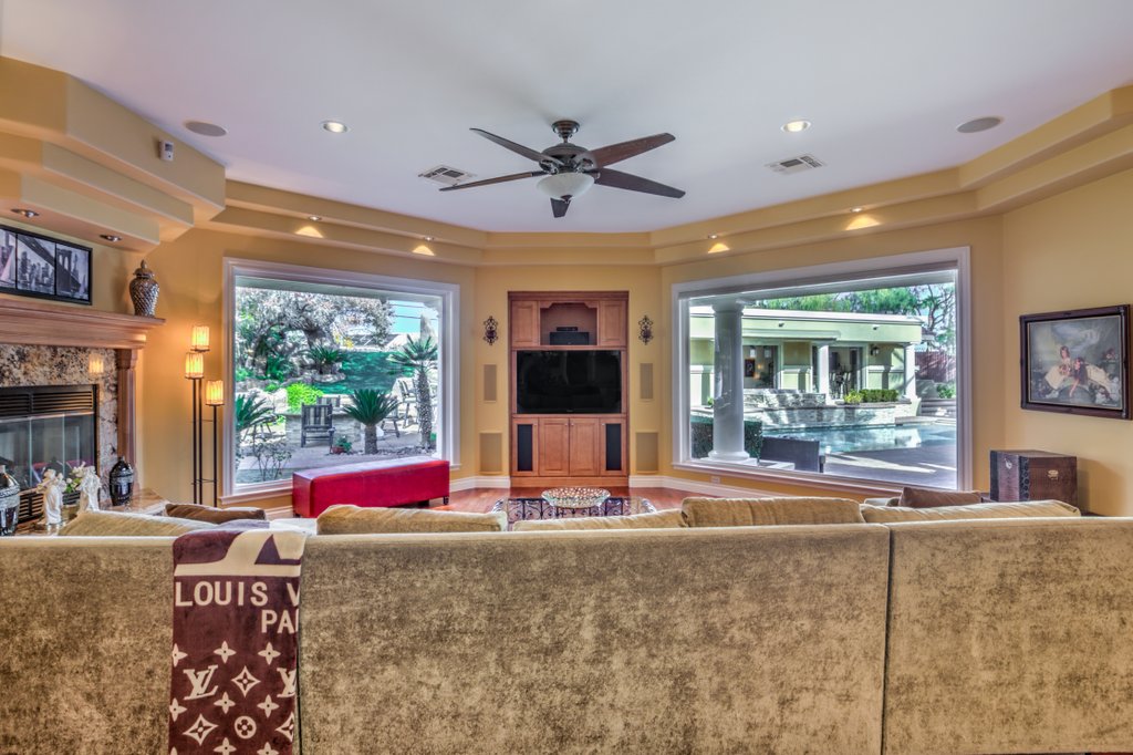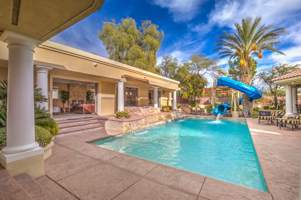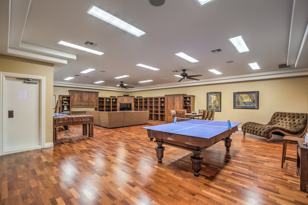 No matter your game, this home is fully equipped to serve up the best recreational and entertainment experience, including indoor basketball and racquetball/handball courts, a fitness center fully equipped with steam shower and sauna, an eight-person home theater, a resort-like in-ground pool, and a detached garage that will make the perfect, secure home for your RV or car collection. The grounds include mature thoughtful landscaping, including water features. Entertainers dream resort style backyard featuring waterfalls, fire features, meticulous lush landscaping, professional outdoor kitchen, bar, fire pits, retractable awnings, misting systems, multiple covered outdoor living/dining rooms and entertaining areas with TV and sound systems, and waterfall feature pool with a water- jetted, spiral slide. There is a special surprise for the young at heart- a biking or walking path surrounding the expansive acre with a custom rock tunnel, play structure and archery galley. Truly, this home is in a class all its own.