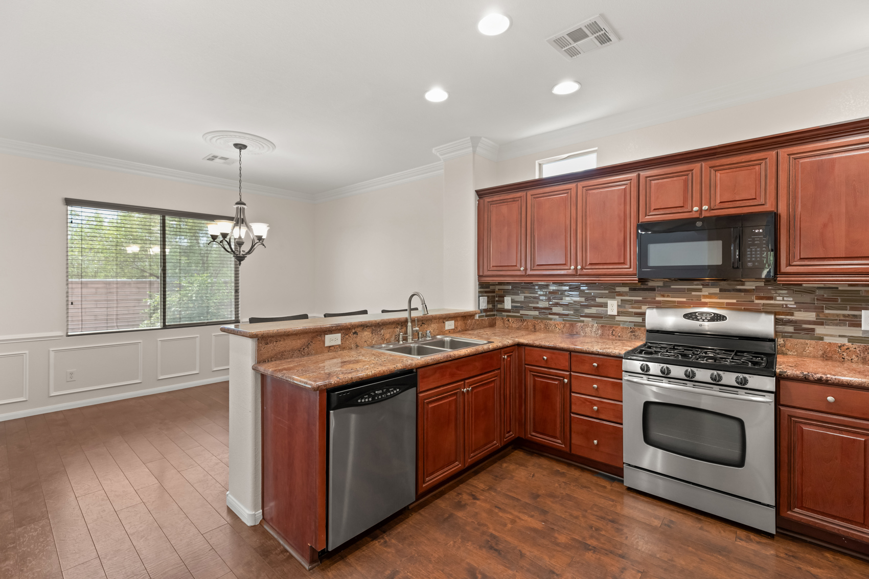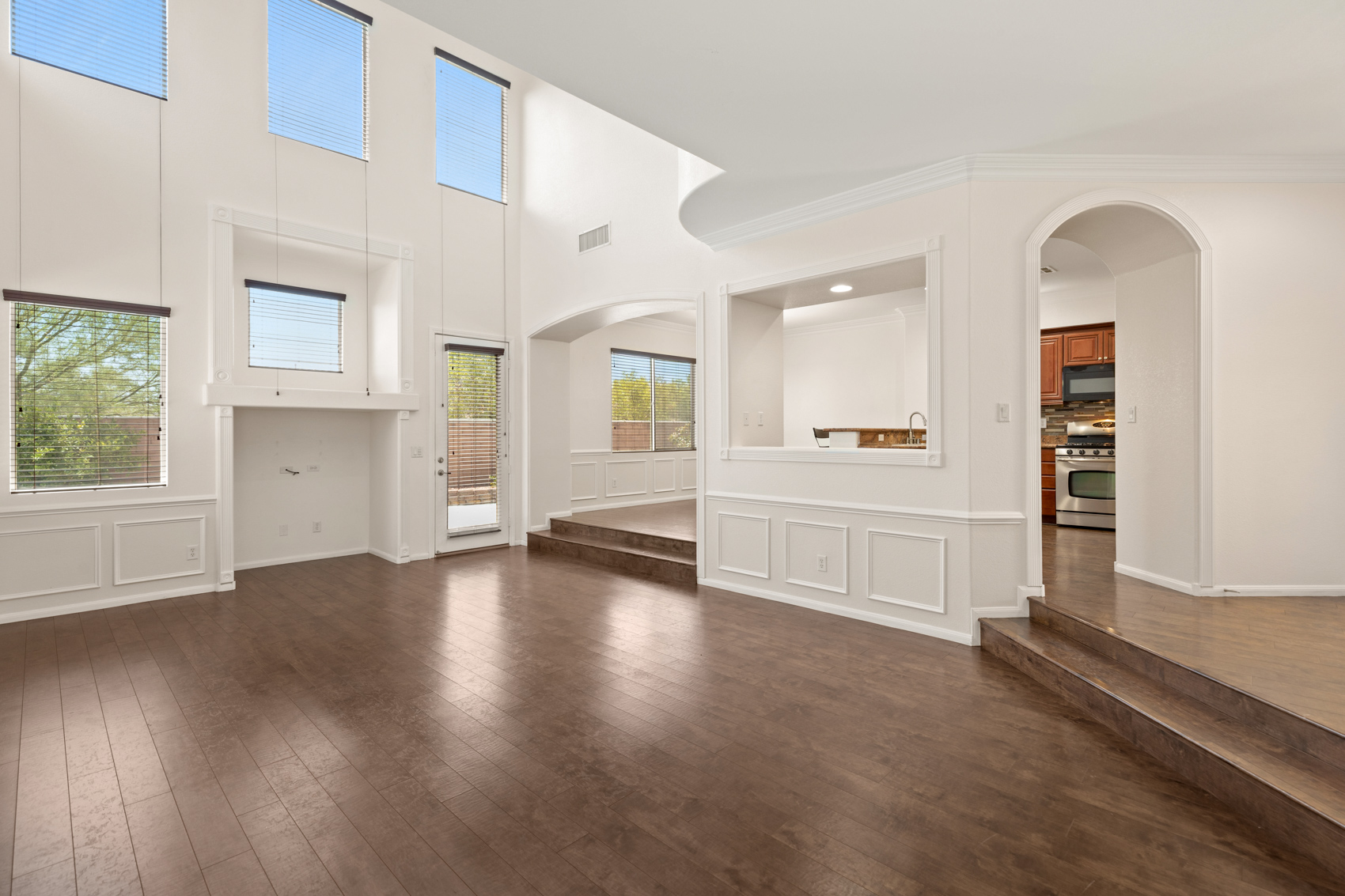 The bright, open floor plan is highlighted by soaring 20-foot ceilings in the great room, rich hardwood floors, and timeless moldings throughout. The kitchen, bathed in natural light, features upgraded cabinets, stunning granite countertops, and newer stainless steel appliances, making it a chef's dream. Outside, the rare, low-maintenance backyard is a blank canvas, ready for your personal touch, with ample room for a pool or outdoor oasis.