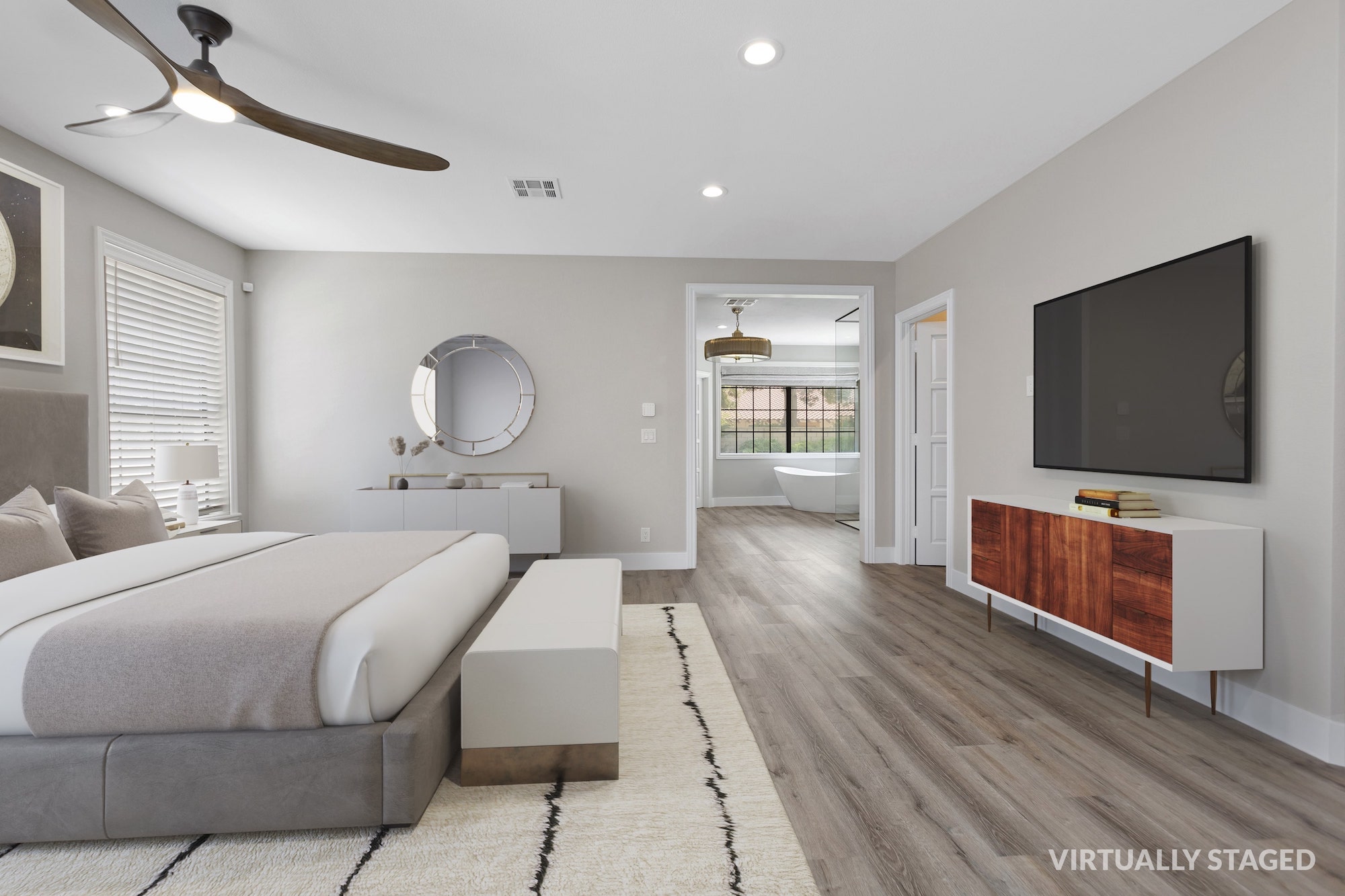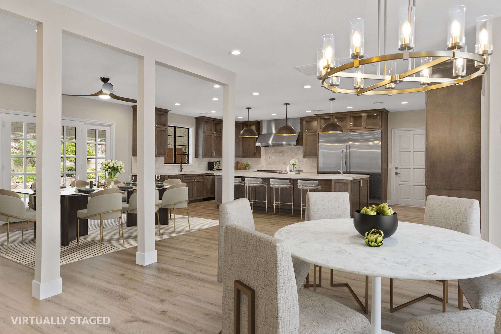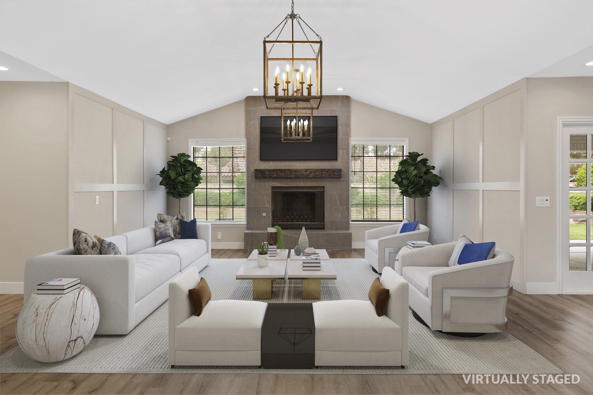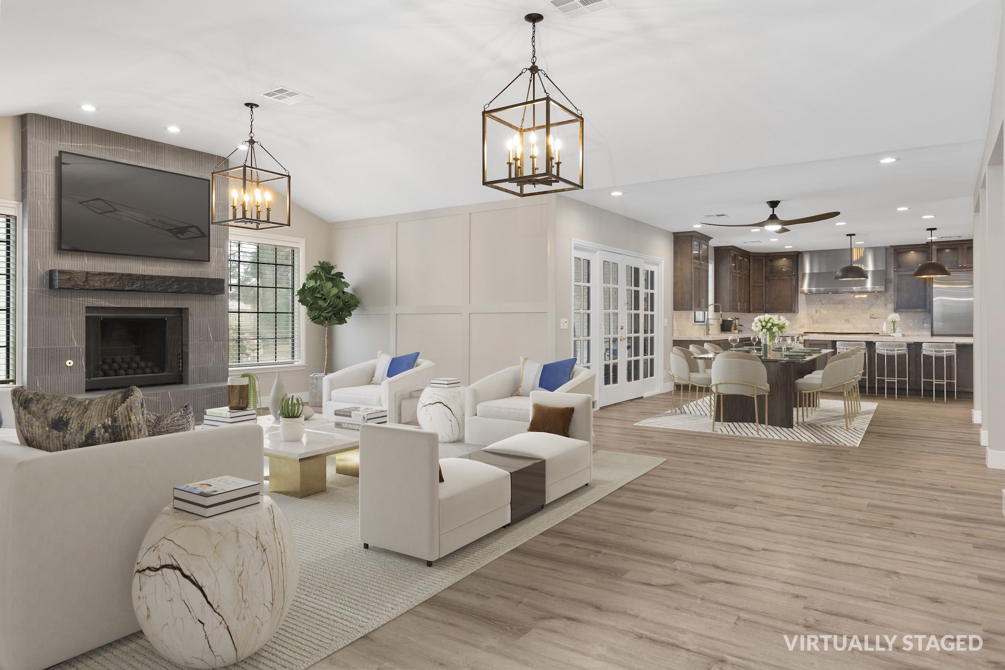 The five-bedroom, four-bath home, situated on a prime half-acre corner lot, has 4,619 square feet of interior space. Natural light pours into the open-plan interior, and every area boasts a welcoming, easy-living appeal. The entry court, with a circular drive, is elegantly simple, and a separate driveway leads to garage space for five vehicles, as well as a gated space for RV parking. The three-bay garage is ideal to double as a workshop outfitted with air-compressor outlets, 220V outlets, insulated and climate-controlled, and even features a separate entrance and full-sized bathroom.
