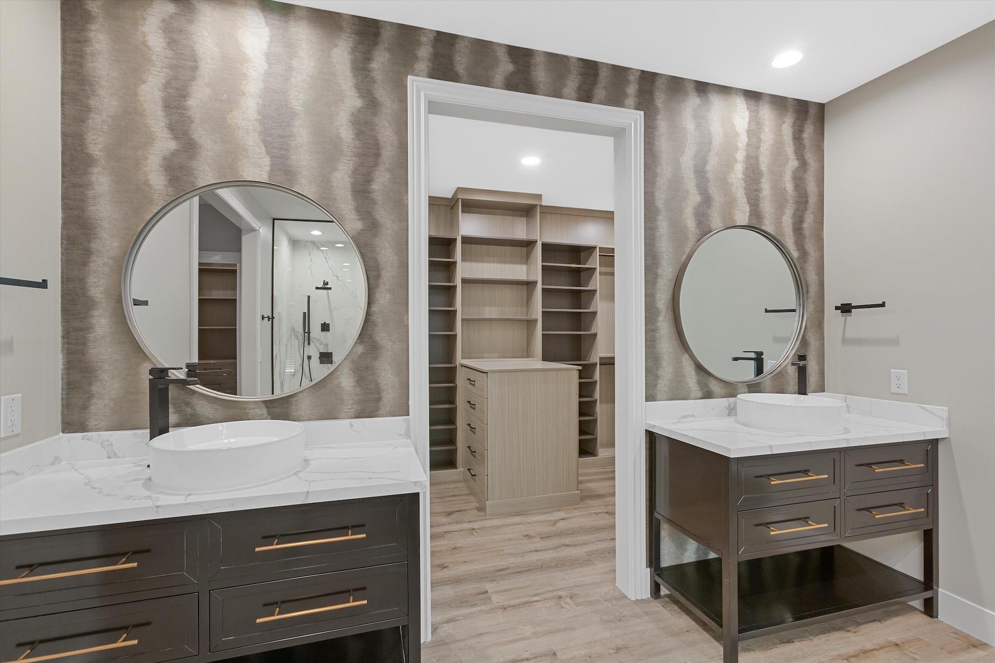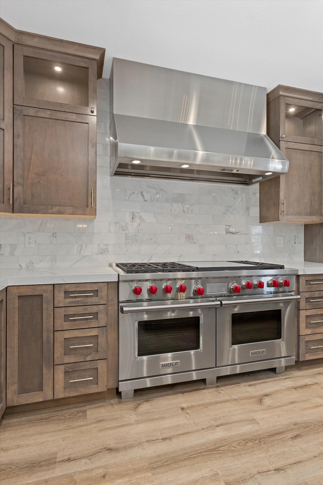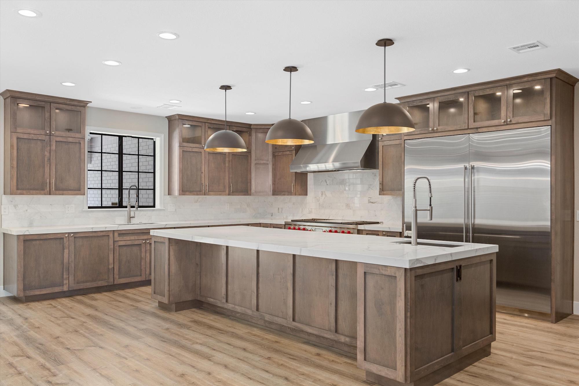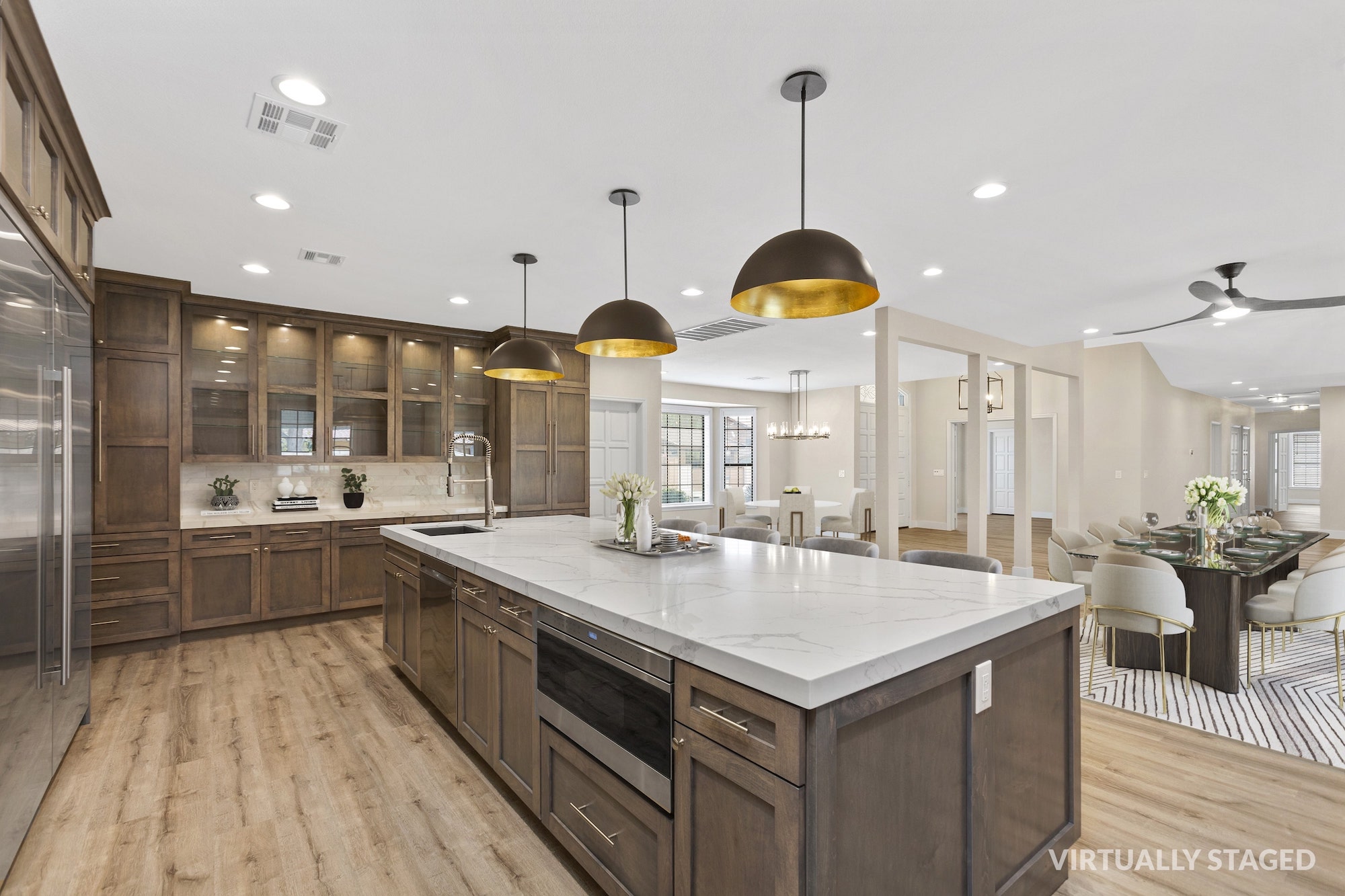 The kitchen is a masterpiece with stunning quartz countertops and a trio of dramatic pendant light fixtures over an expansive 12-foot island outfitted with a second sink for easy food preparation. Custom cabinets and the best in professional-grade Wolf appliances, including a 60ā designer Subzero column refrigerator/freezer, a 60ā Wolf range and hood, Wolf microwave drawer, and two dishwashers complete the high-end kitchen. The homeās great room is open to the kitchen and adjacent dining space and is centered by a fireplace framed by windows that overlook a grassy expanse of yard. The backyard boasts a landscaped pond and built-in barbecue in addition to a playful outdoor shower, a brick patio with a fire pit, and a shaded pavilion ideal for entertaining. The master bedroom is a vision of functional space with two closets with built-ins, and a showstopper master bath. There is a room-size glass-walled shower for two and a Euro-style sculptural soaking tub set into a windowed corner overlooking the backyard oasis. The additional bedrooms also have walk-in closets and contemporary baths. This gorgeous home also features a separate expansive den with a distinctive bar/mini kitchen wall can be used as an office or an ideal family retreat.